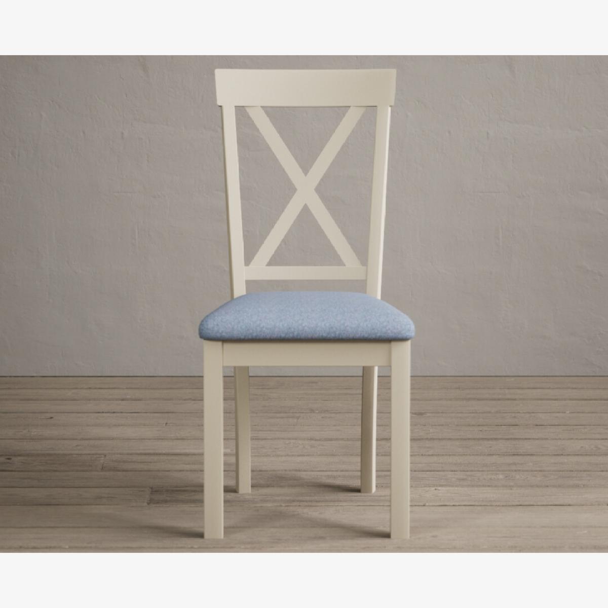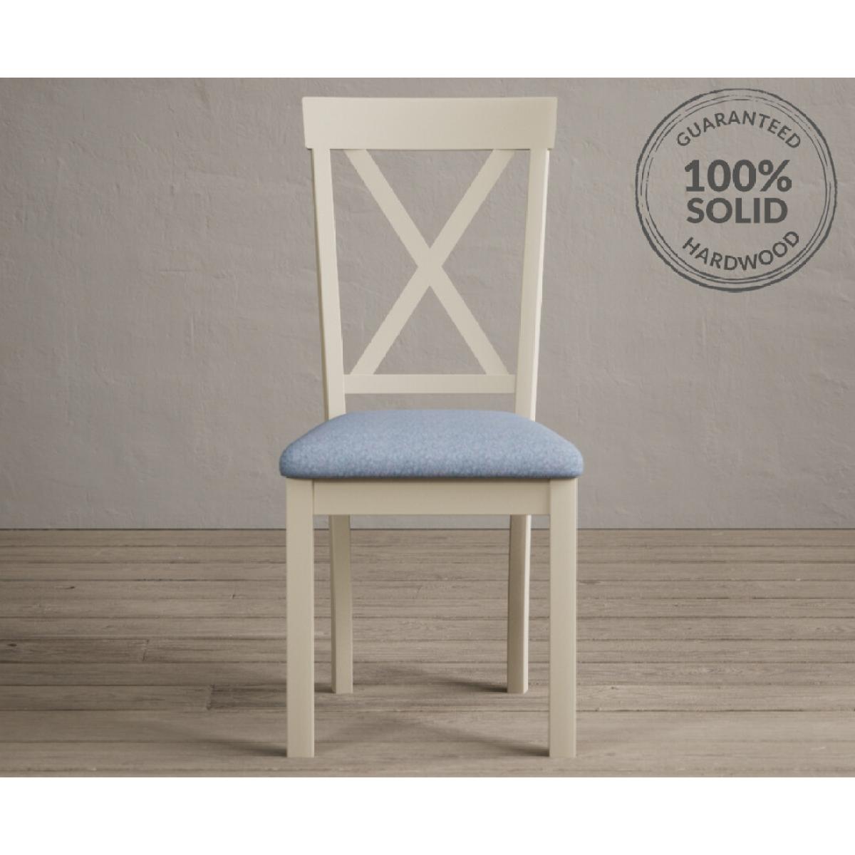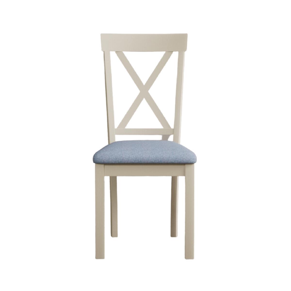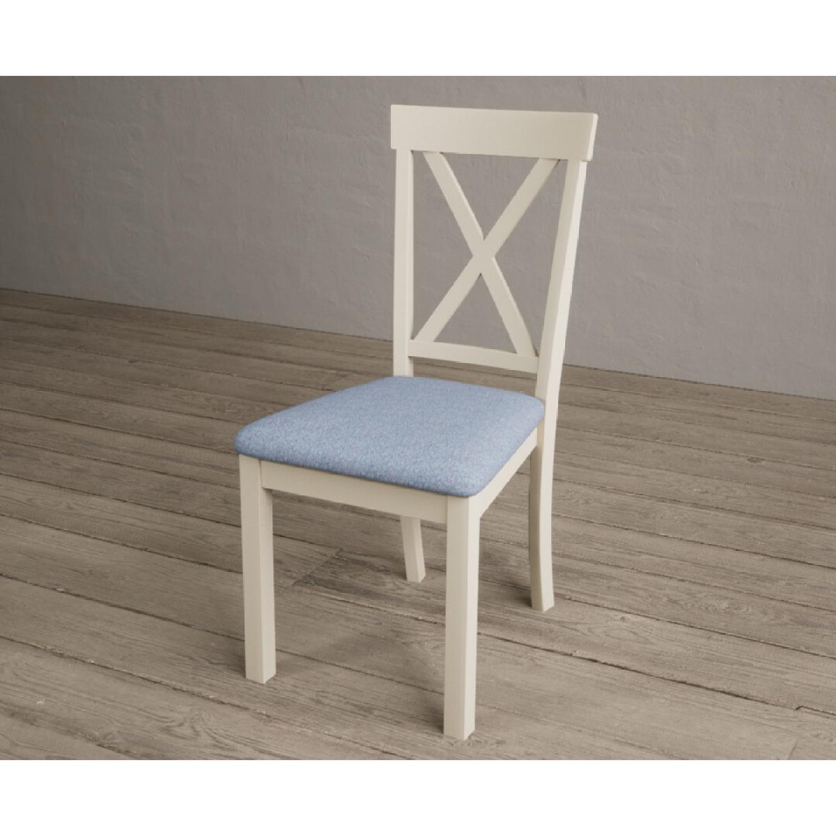 Hertford Cream Dining Chairs with Sky Blue Fabric Seat Pad feature sturdy painted solid wood frames with an x back design and light blue fabric seat pads.