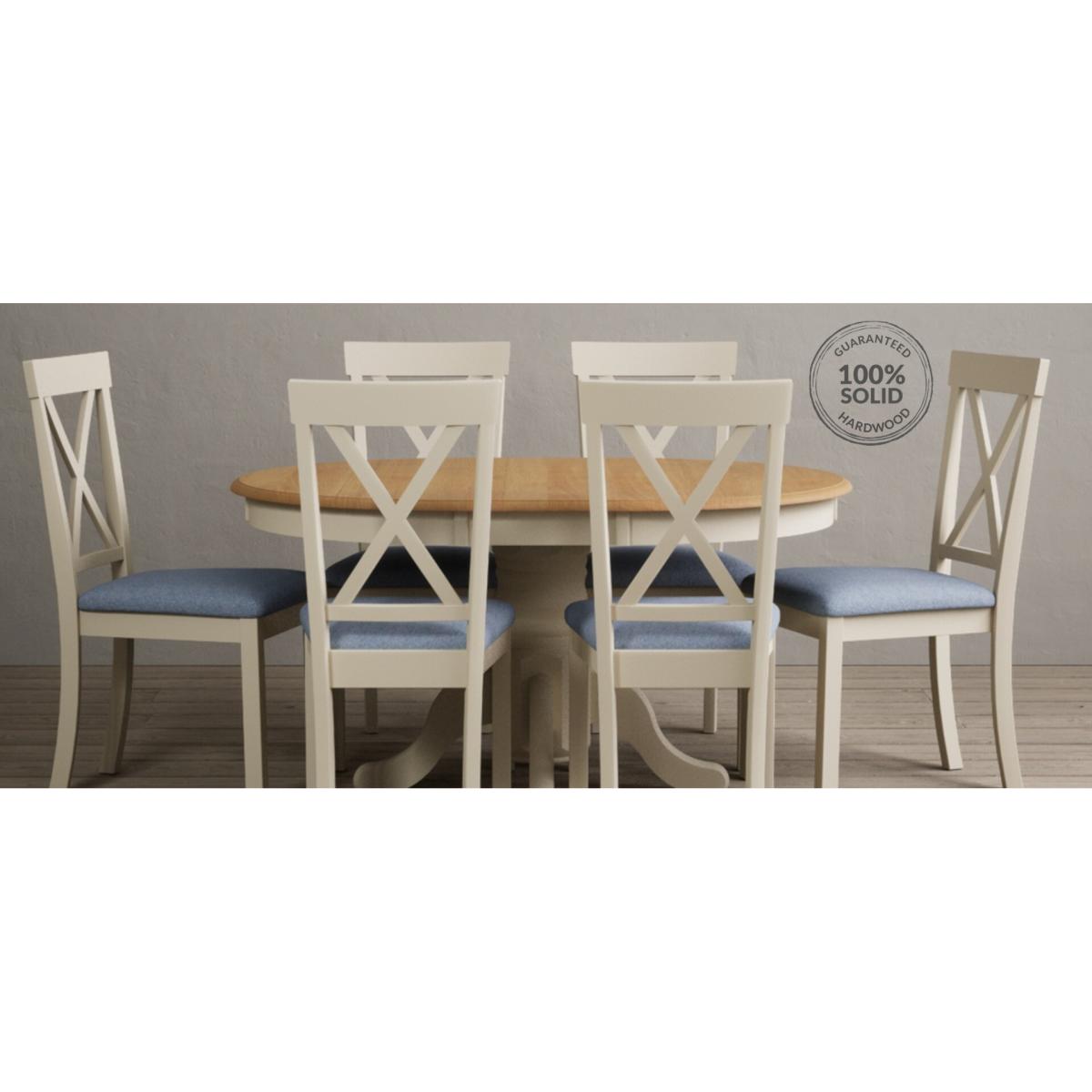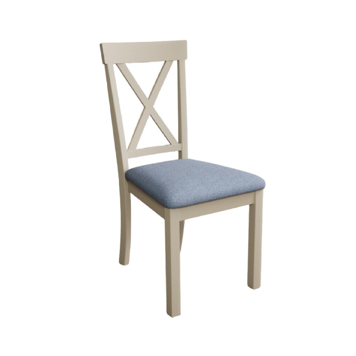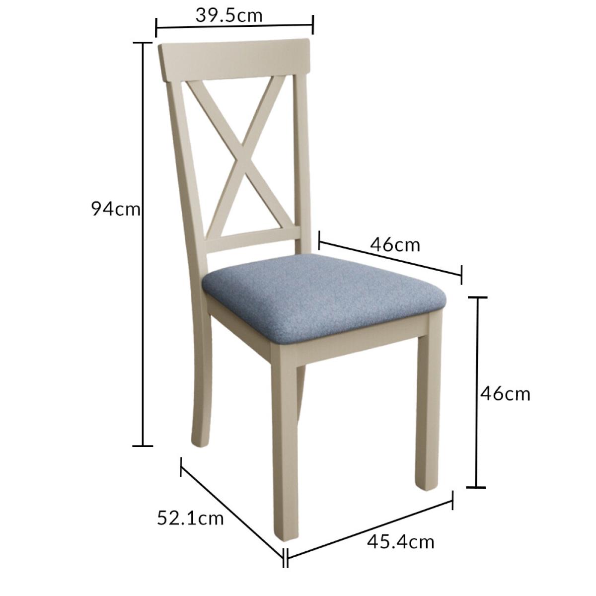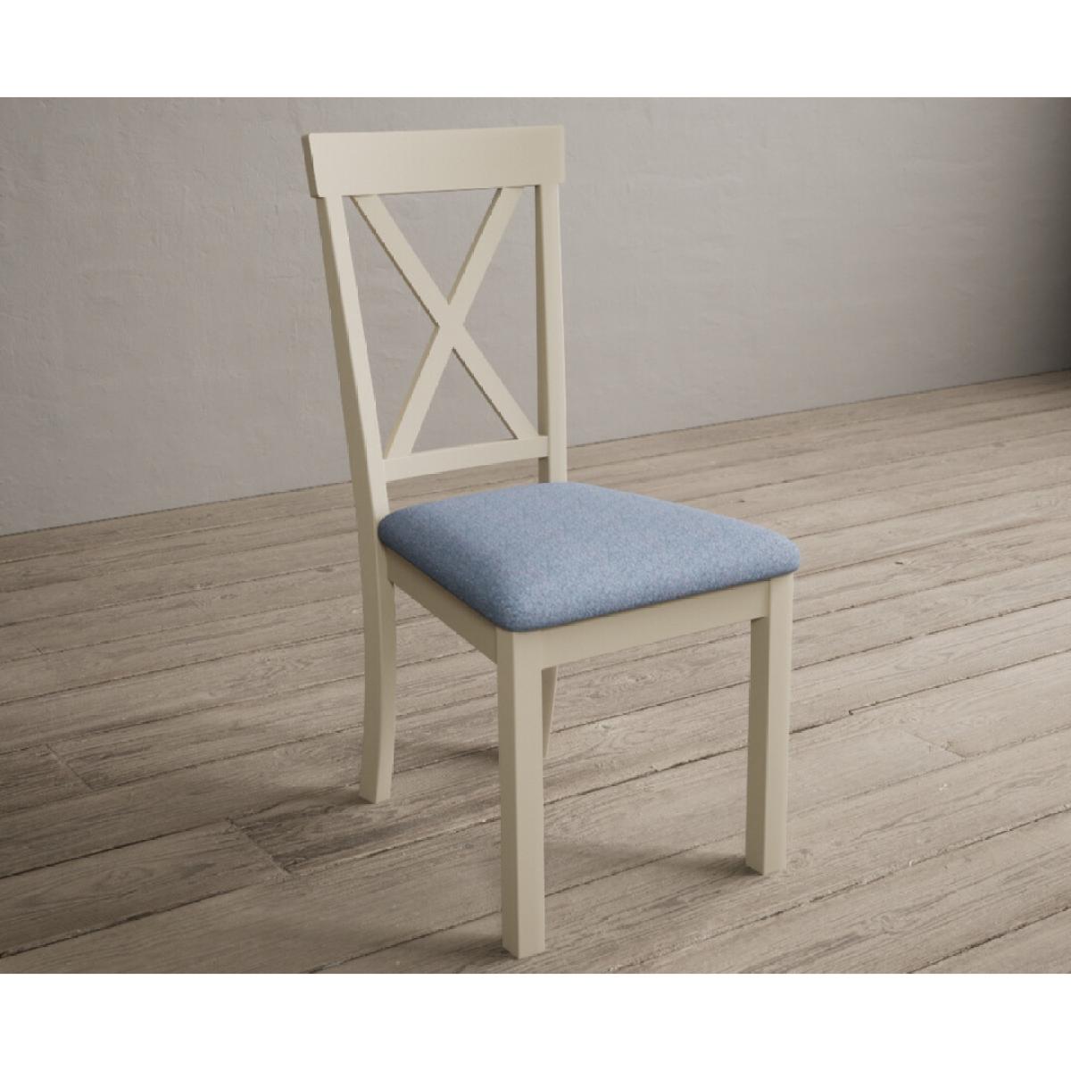 Hertford Cream Dining Chairs with Sky Blue Fabric Seat Pad feature sturdy painted solid wood frames with an x back design and light blue fabric seat pads.