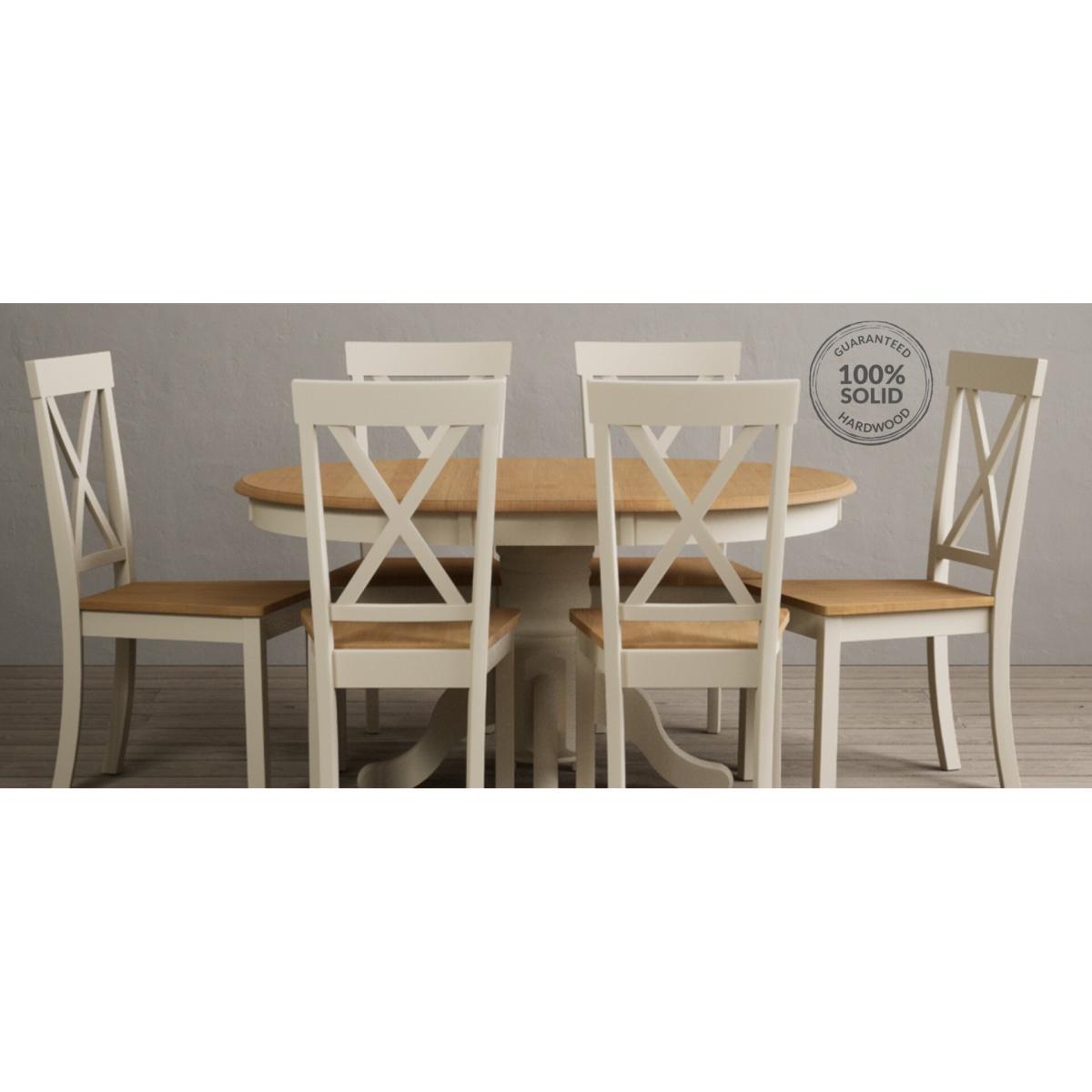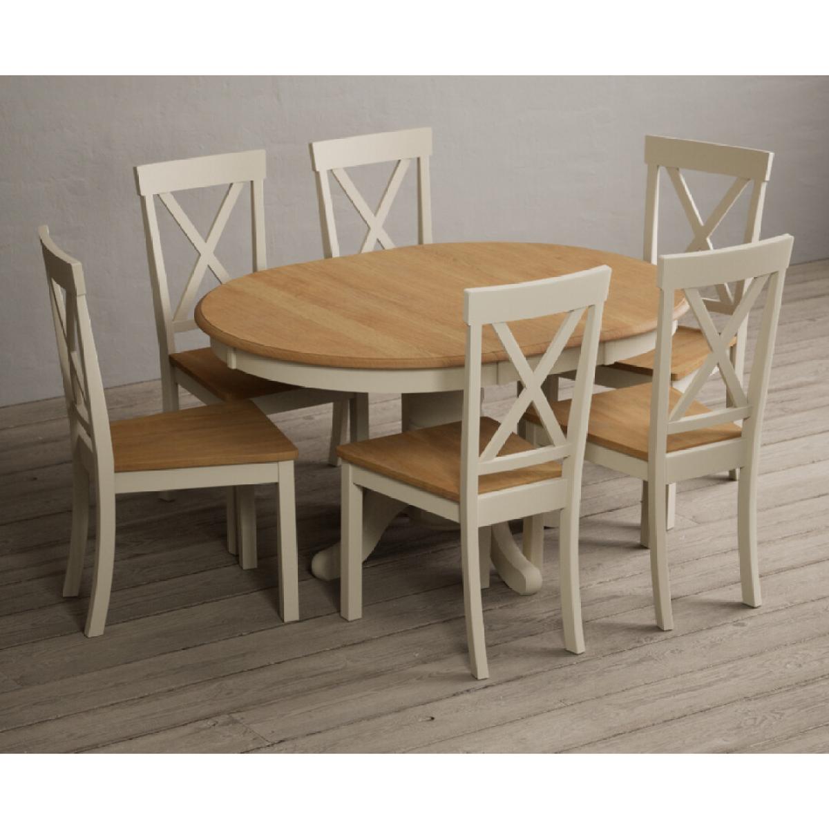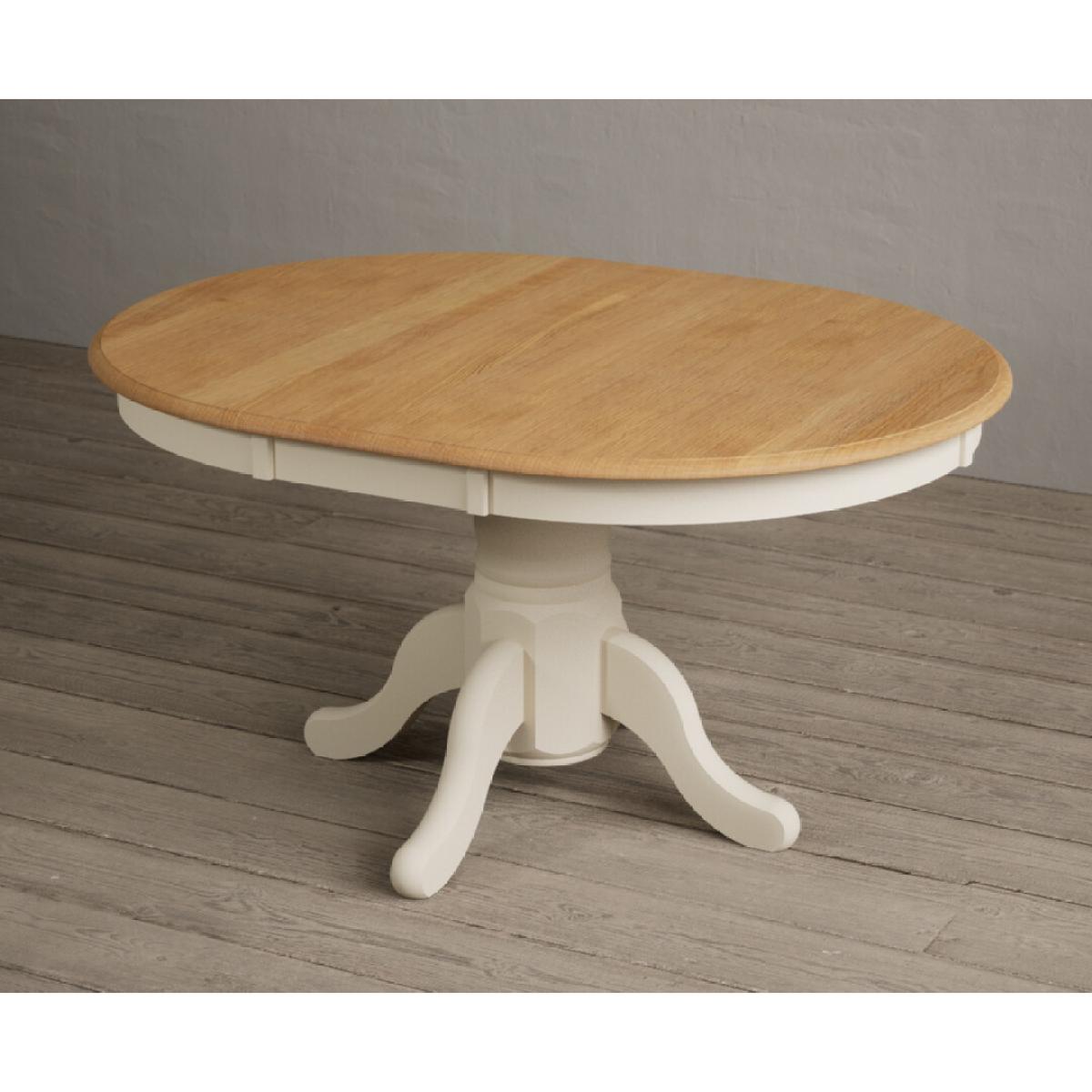 The Hertford Oak and Cream Painted Pedestal Extending Dining Table with Hertford Chairs features a solid wood table with a painted finish and 100% solid oak tabletop, with matching painted chairs.
