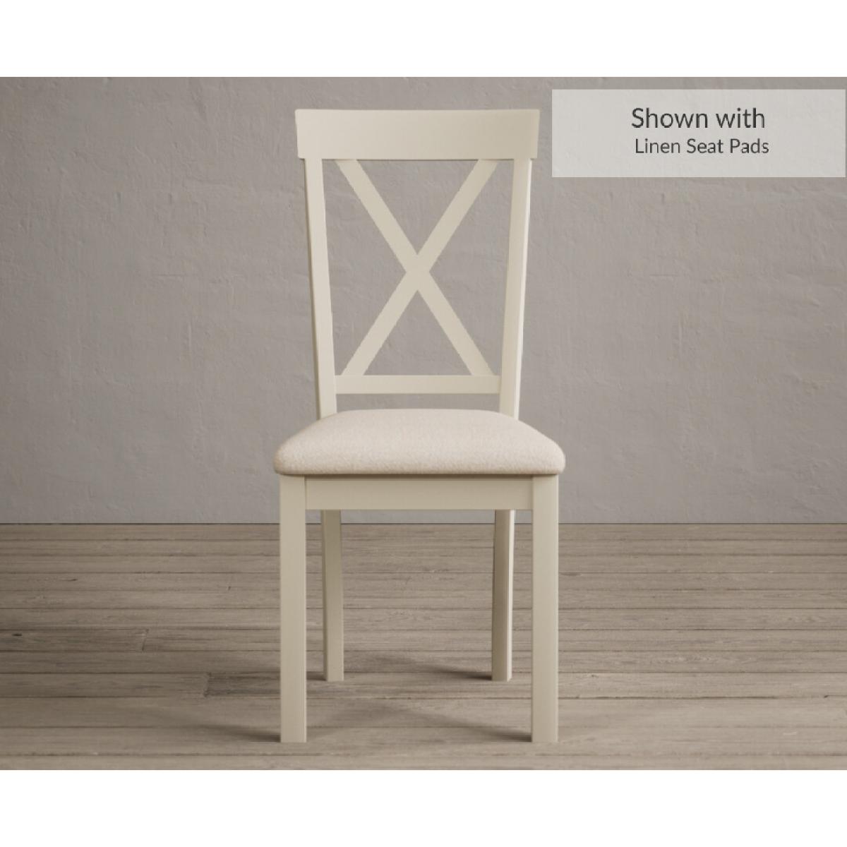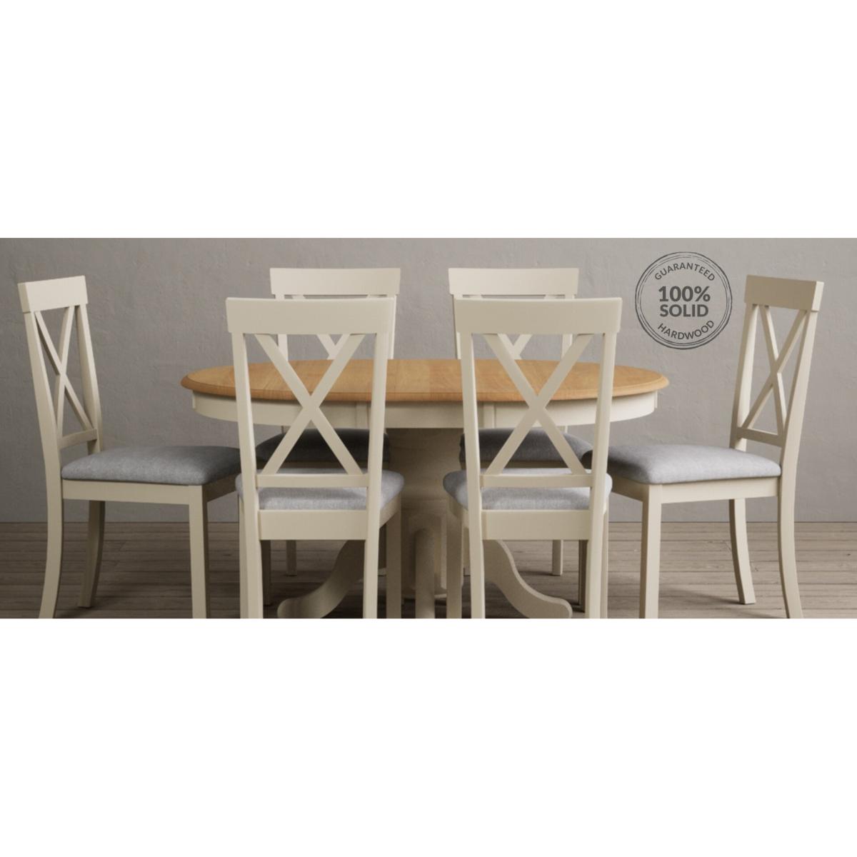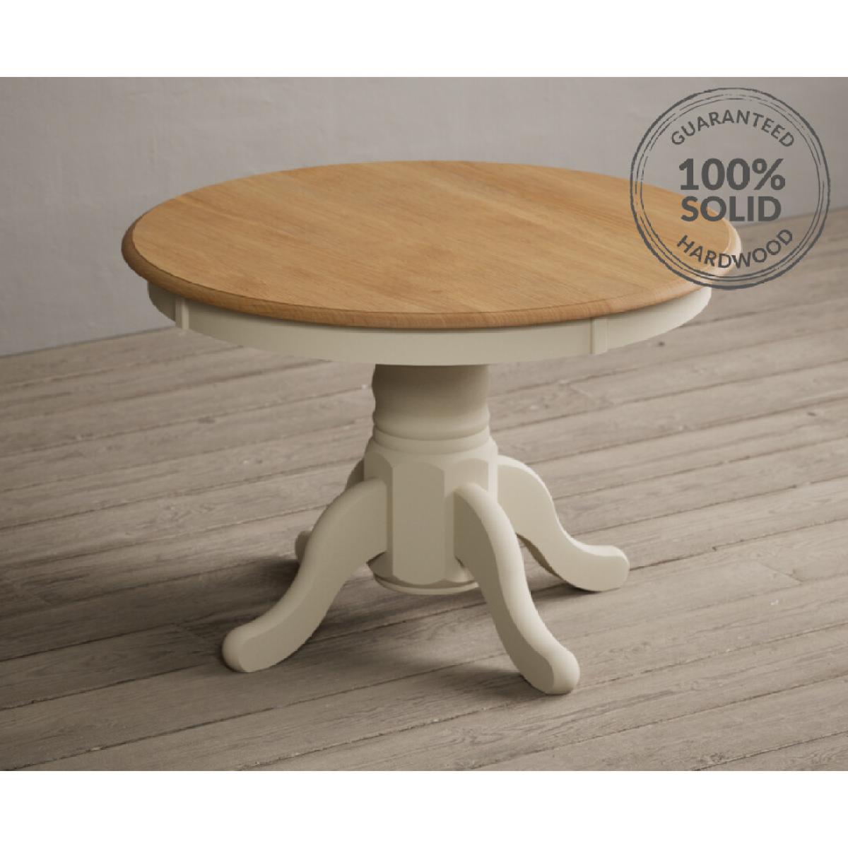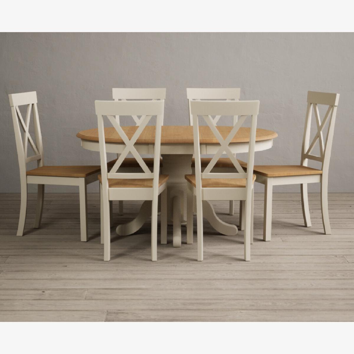 The Hertford Oak and Cream Painted Pedestal Extending Dining Table with Hertford Chairs features a solid wood table with a painted finish and 100% solid oak tabletop, with matching painted chairs.