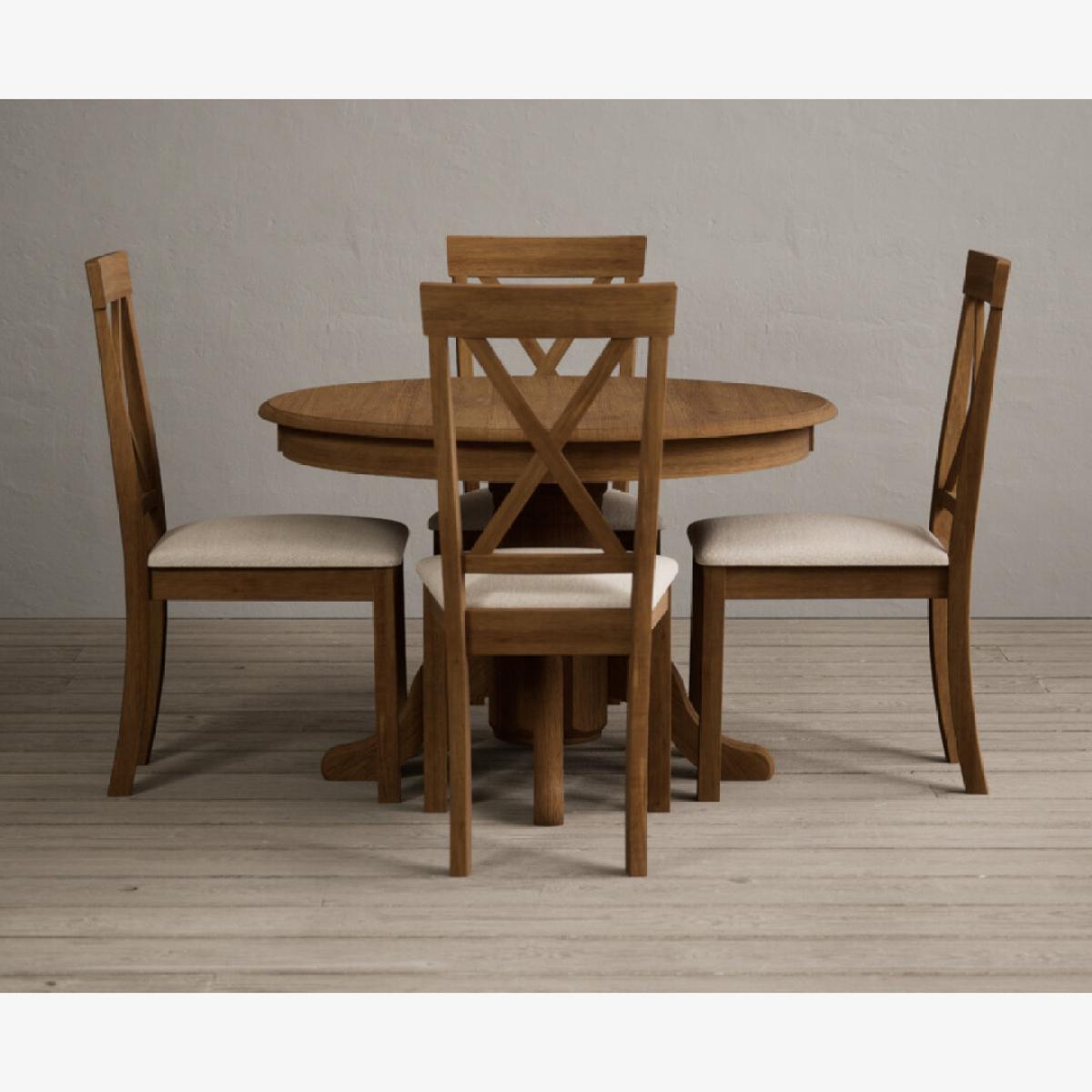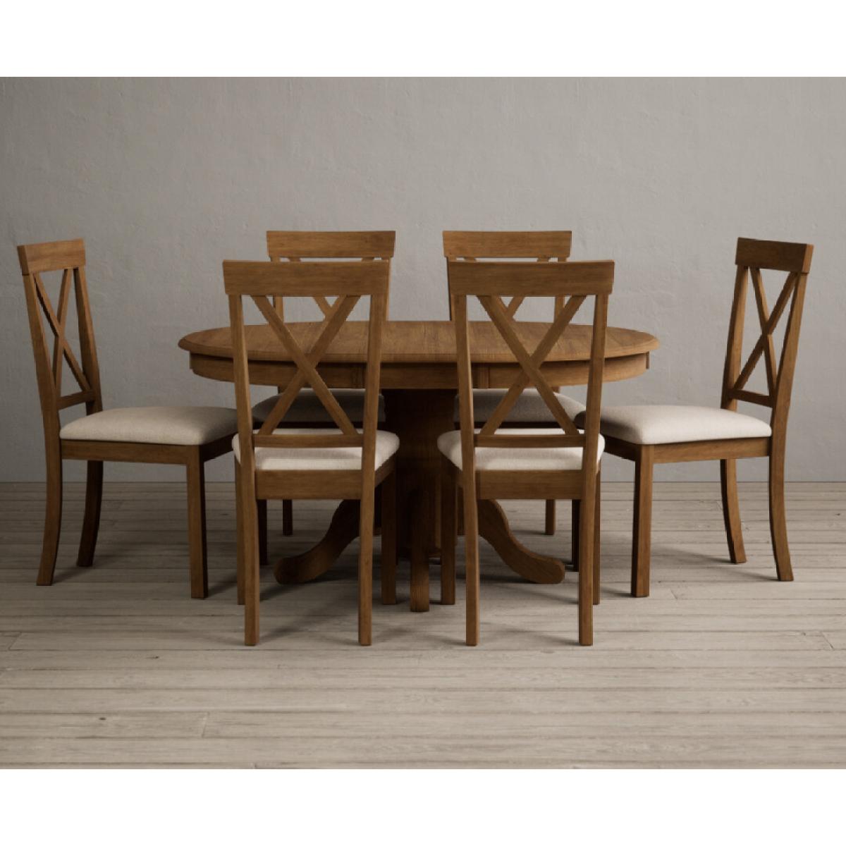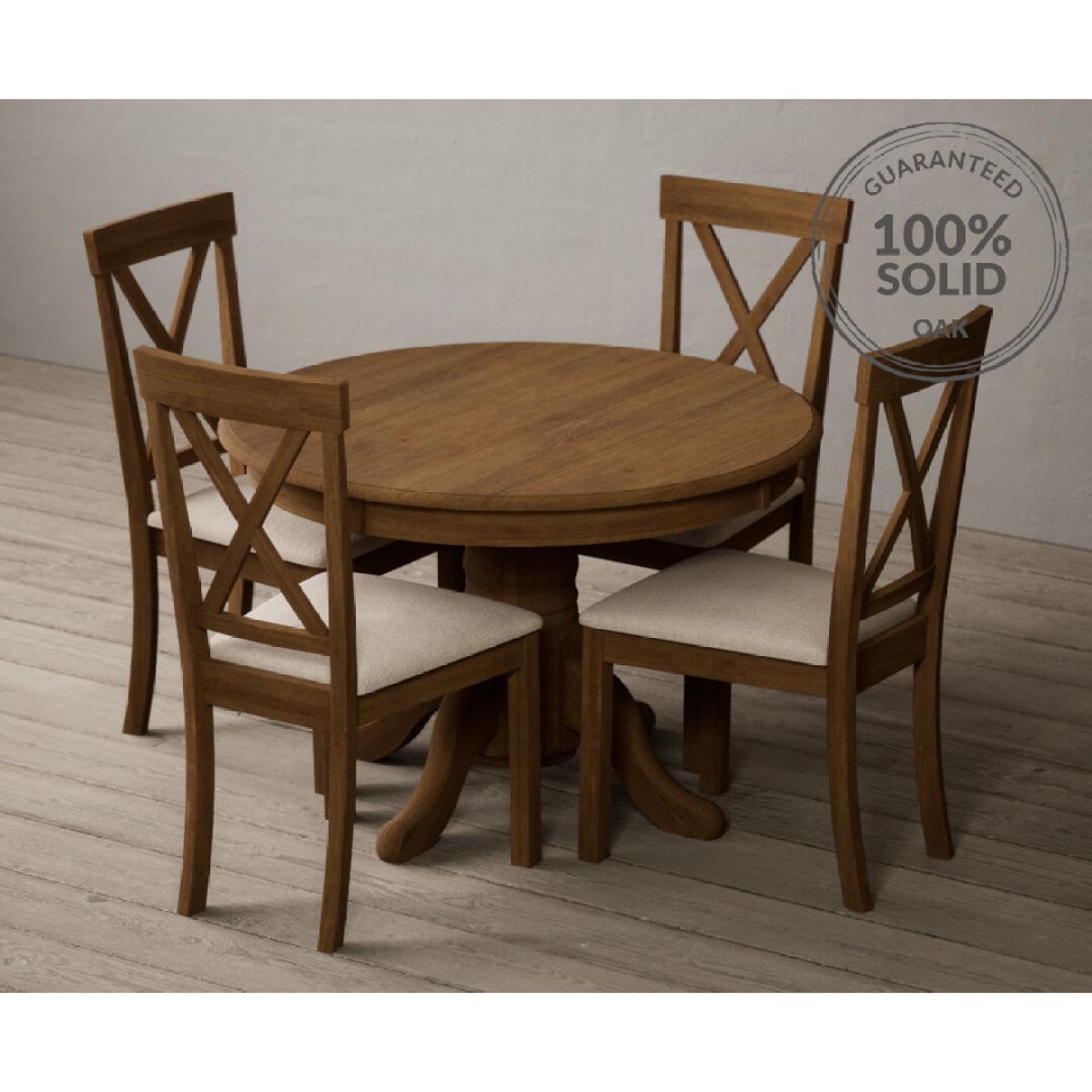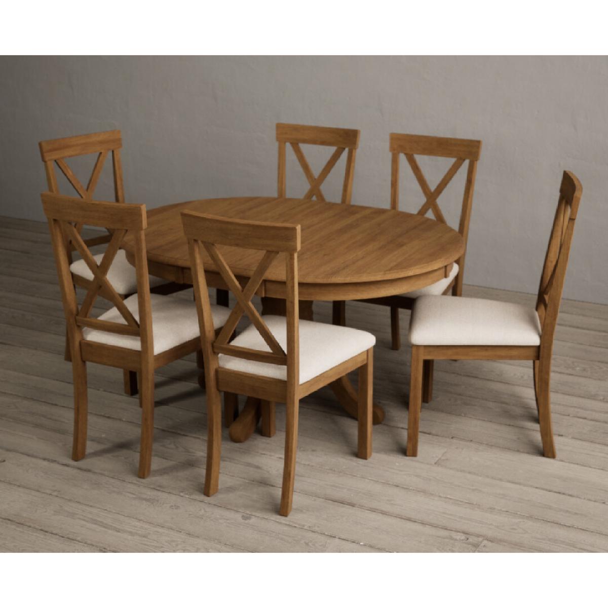 The Hertford Rustic Oak Pedestal Extending Dining Table with Hertford Chairs features a rustic 100% solid oak dining table and matching chairs.