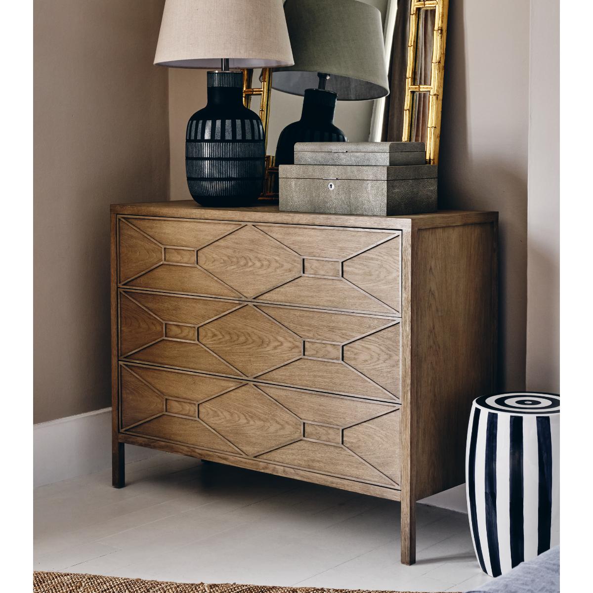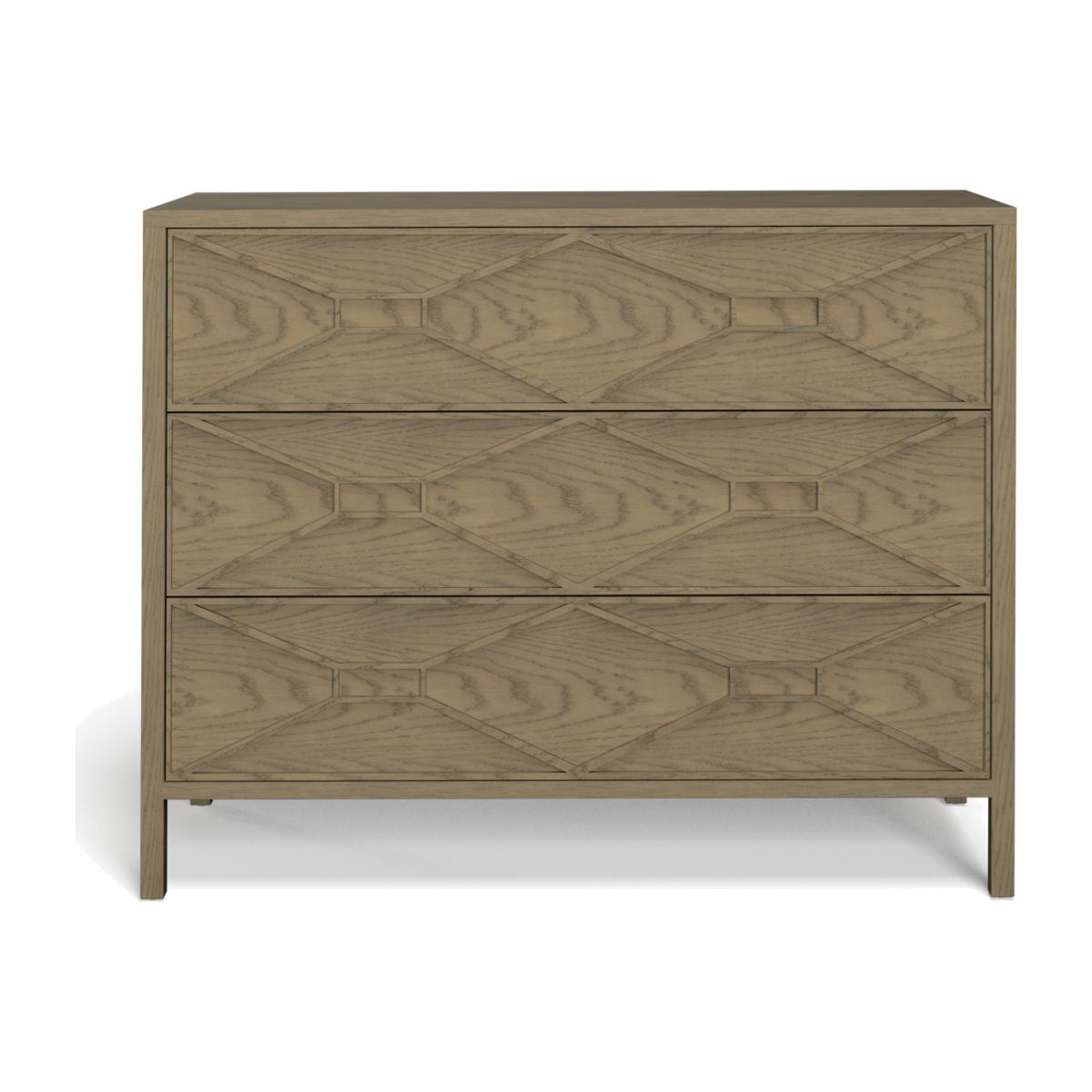 Explore the various sides – and grains – of wood with the Hester Chest of Drawers, whose façade is adorned with geometric facets, each highlighting the material's unique knots and texture. Due to the differences in the grain featured on the solid oak and natural-wood veneer, each piece is a one-of-a-kind addition to a scheme.