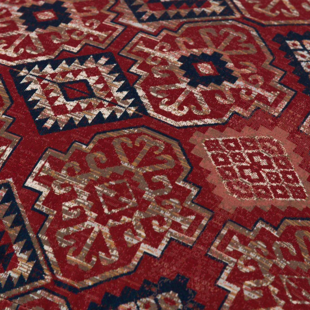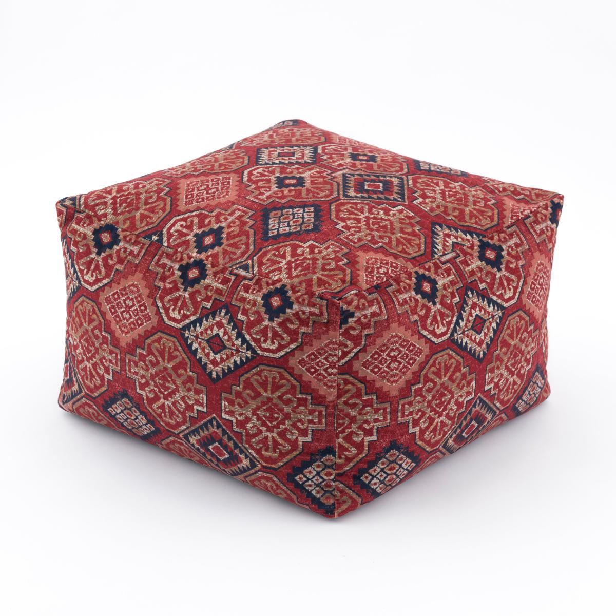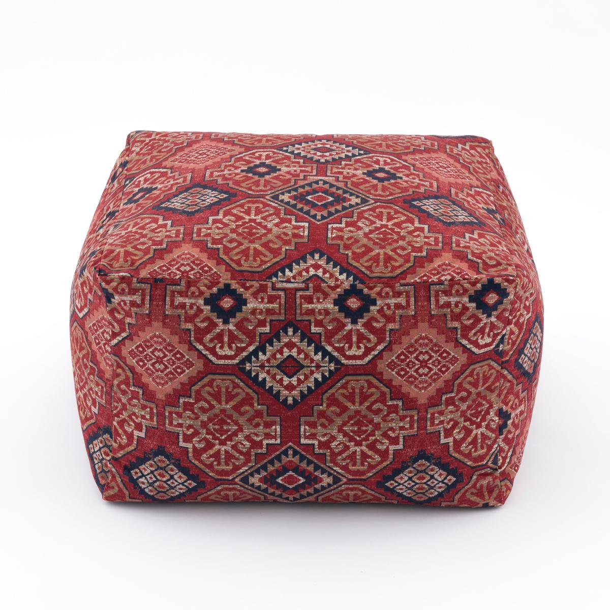* Moroccan style* Global geometric design* Filled with polyester beads Reminiscent of artisan rug designs, this stylish Kilim Cube Pouffe will add a touch of eclectic charm to your home. Whether you use it as extra seating, as a footstool or a stylish side table, the rich colours combined with an eye catching geometric design will make a wonderful addition in any room.