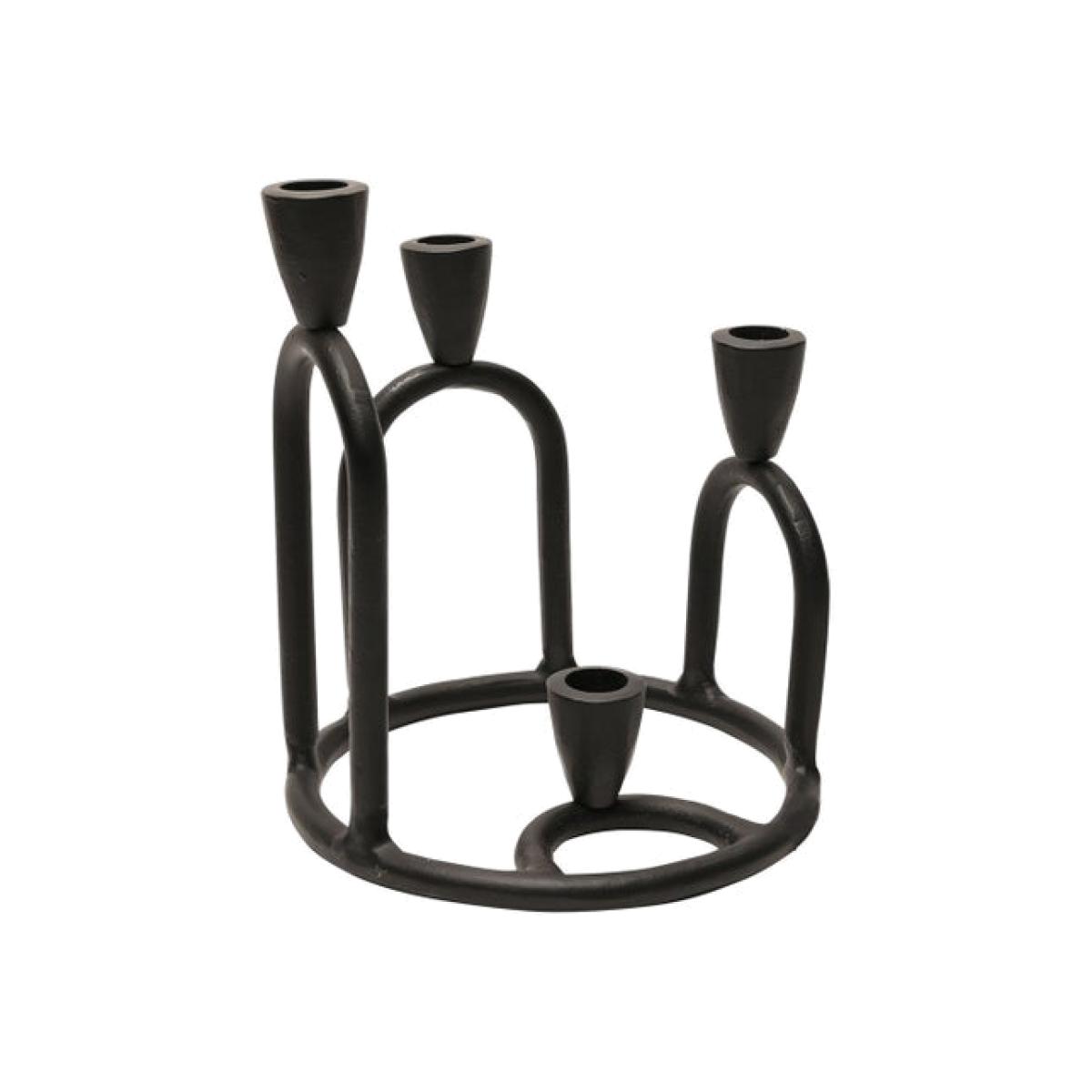 * 4 candle capacity * Sleek design * Crafted from durable aluminium Create a bold centrepiece with the Hestia Aluminium Candlestick Holder for 4 Candles. Crafted from black aluminium, its modern circular design adds a sculptural edge to any room. Sleek and minimal, it holds four candles; deal for adding a warm, inviting glow to your space. Whether styled on a dining table, sideboard or mantel, it brings effortless sophistication. Its clean lines and matte finish make it a perfect fit for both contemporary and classic interiors. Striking, simple, and beautifully designed.