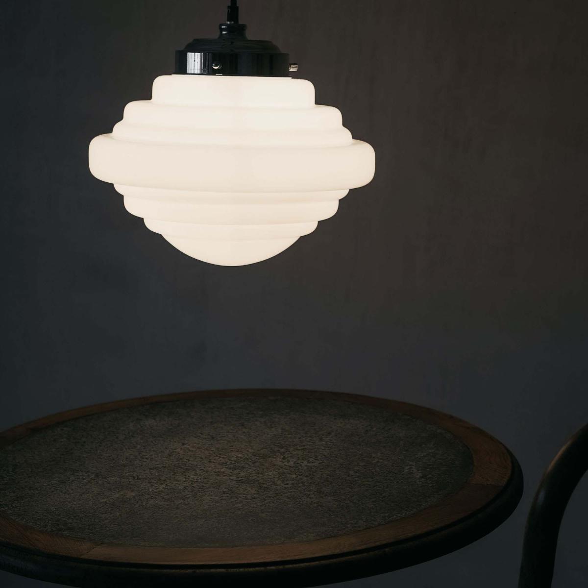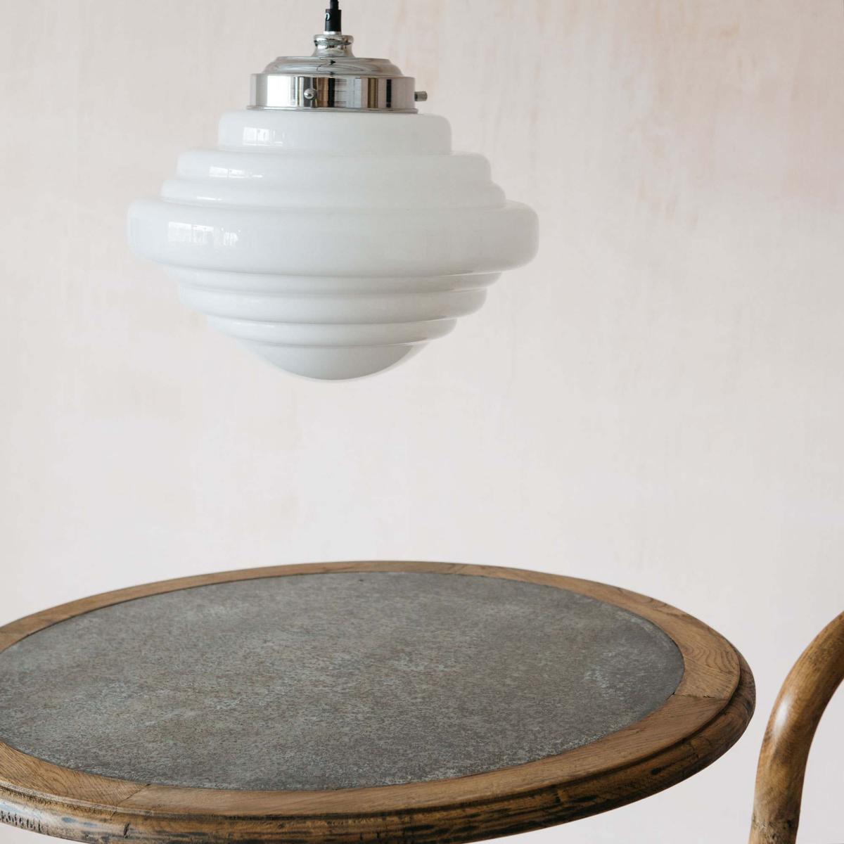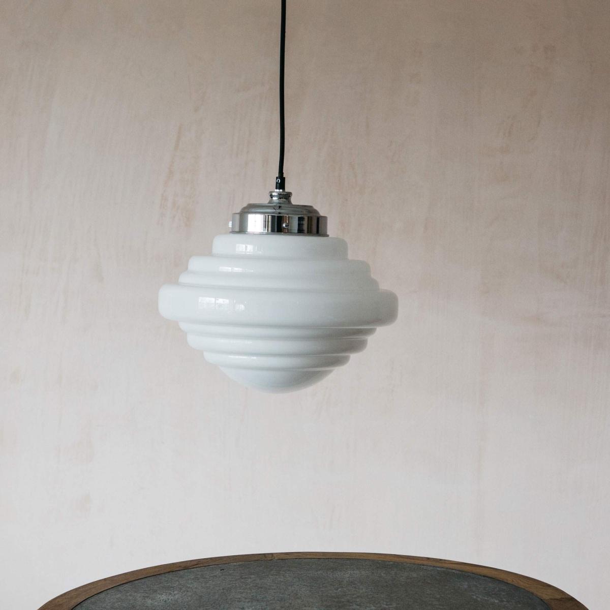 A classic art deco-inspired ceiling pendant with sculptural detailing and a polished chrome finish. Perfect for adding warmth and character to your lighting arrangement.