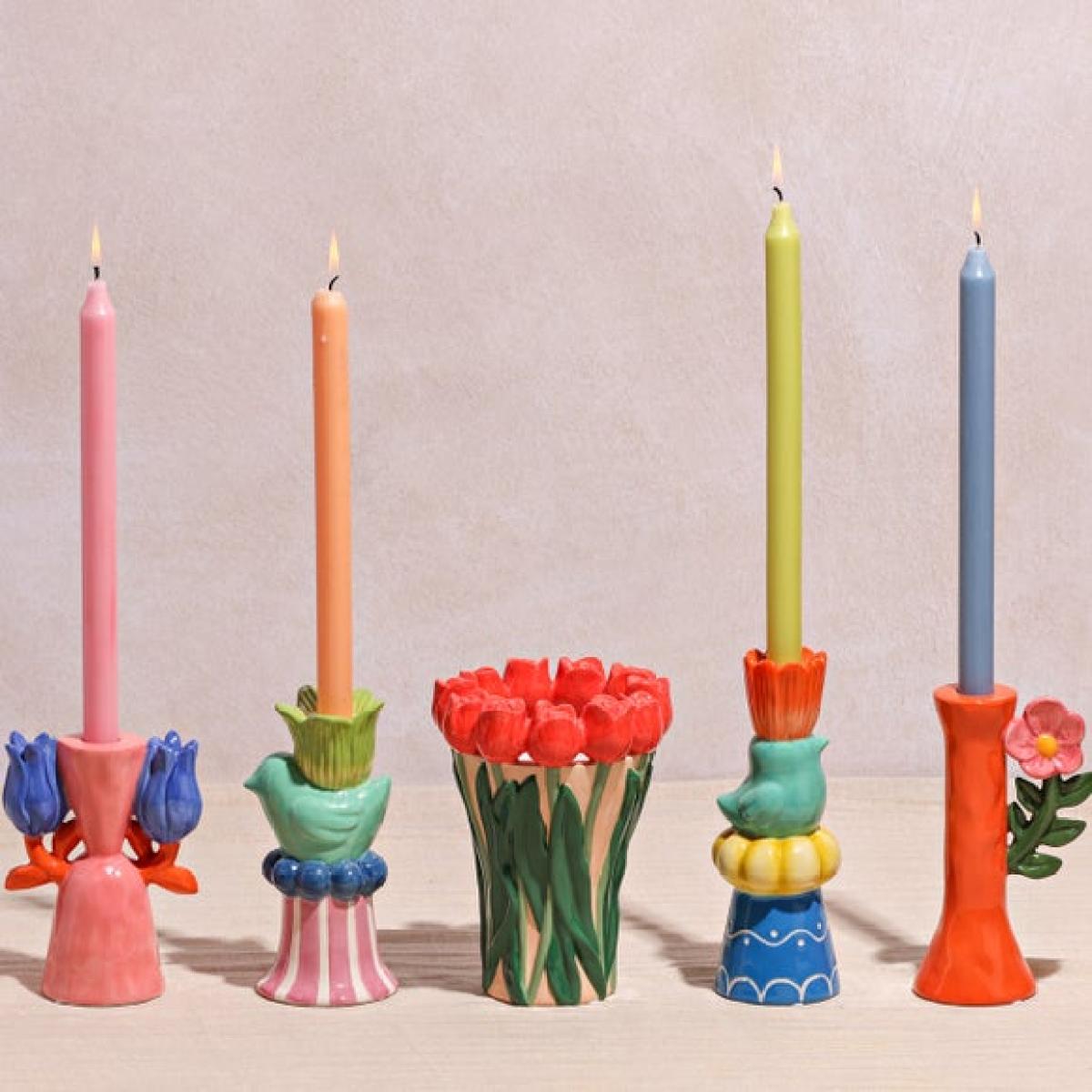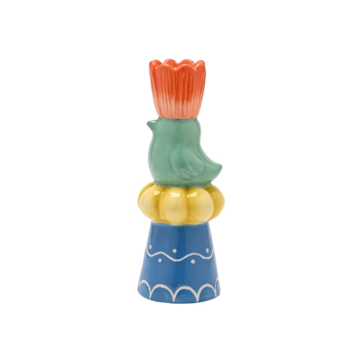 * Brightly glazed ceramic * Bold orange flower and bird detail * Whimsical stacked design * Fits a taper candle (not included) * Perfect for creating a cheerful focal point Brighten your home with the Hestia Bird & Orange Flower Candlestick Holder. Its ceramic design combines vibrant colour with a stylised bird and flower for a fun, artistic touch. Designed to hold a taper candle (not included), it brings warmth and personality to any display. A delightful accent that makes a statement on mantels, tables, or shelves.