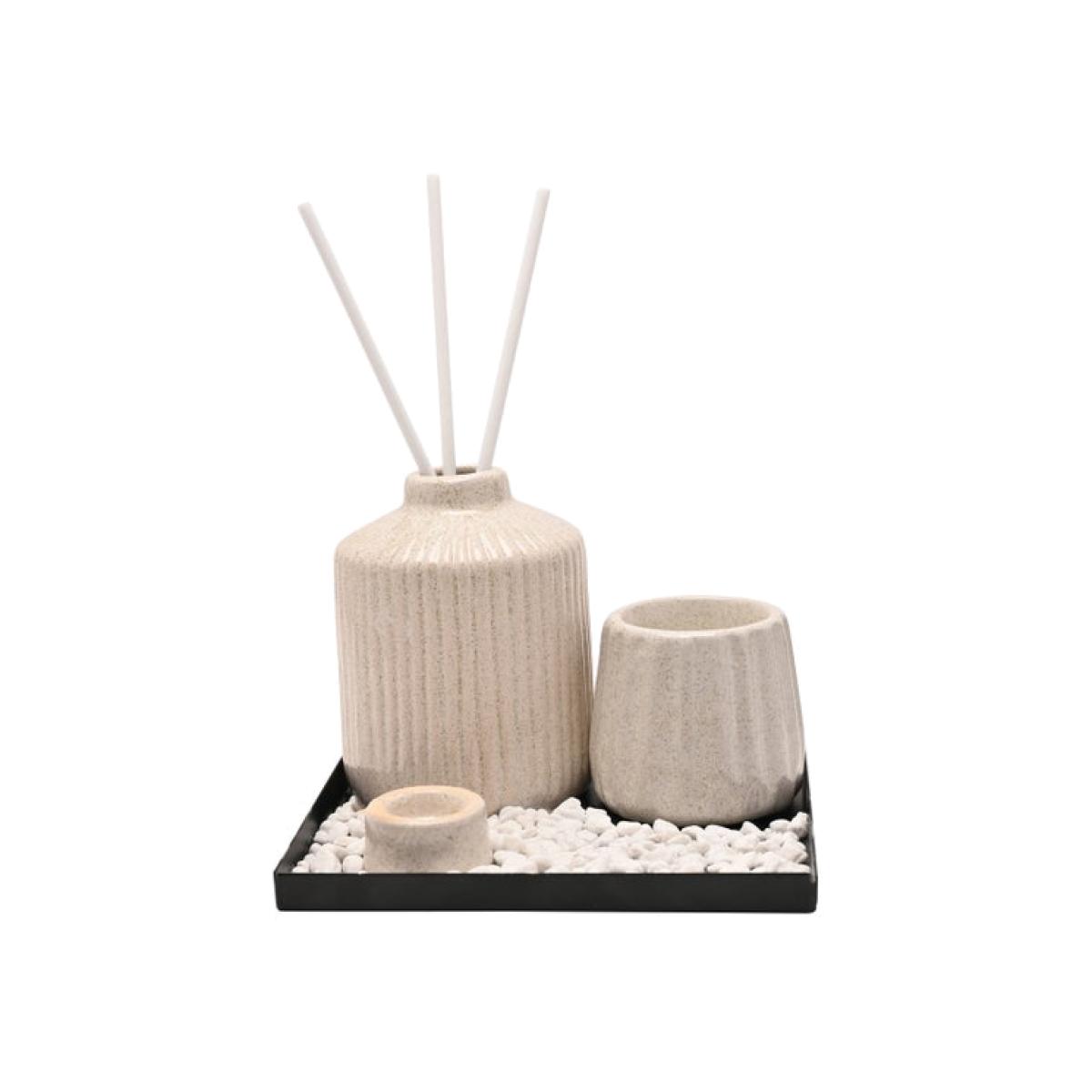 * Ceramic diffuser vessel with lid * Matching tealight holder * Black tray with white pebbles * Three reed sticks * Available in two calming colours * Minimalist, zen‑inspired design Create a soothing spot at home with this elegant, minimalist set. The smooth ceramic pieces sit on a black tray filled with white pebbles for a balanced, contemporary look. Add your favourite fragrance oil and let the reeds gently diffuse scent, while the tealight holder brings a soft, ambient glow. Perfect for dressing bathrooms, bedrooms or consoles with a touch of tranquil style. Please note: Fragrance oil and tealight not included.