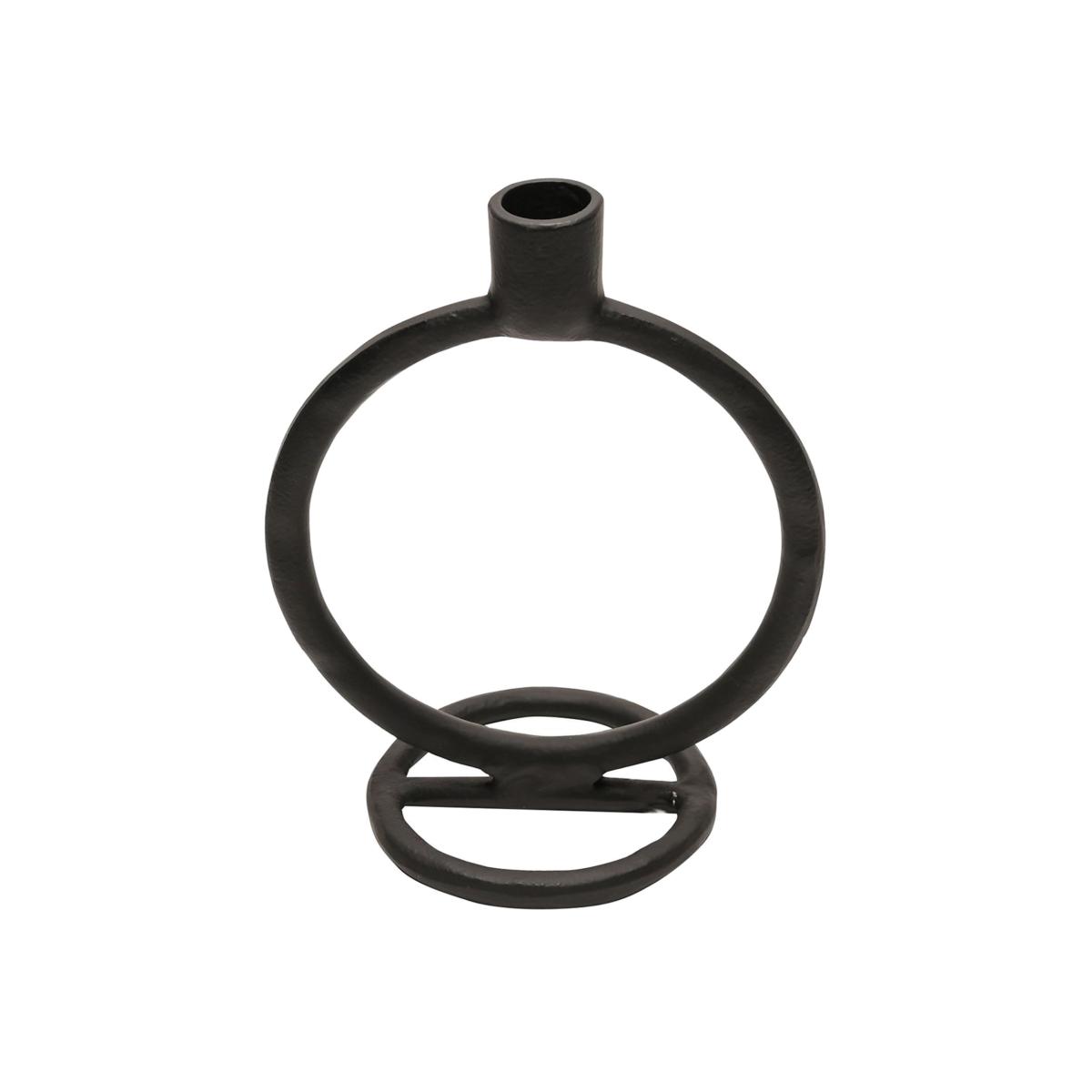 * Stylish Candlestick Holder * Abstract, circular design * Durable metal composition Elevate your home décor with the sculptural simplicity of the Hestia Circular Dinner Candle Holder. Made from durable black aluminium, this candlestick holder features a sleek, abstract circular design that adds architectural interest to any room. Its bold, minimalist form makes it a striking addition to dining tables, mantels, or sideboards, while the single candle platform is perfect for creating a soft, ambient glow. Whether styled alone or grouped for impact, this piece effortlessly blends modern elegance with functional design.