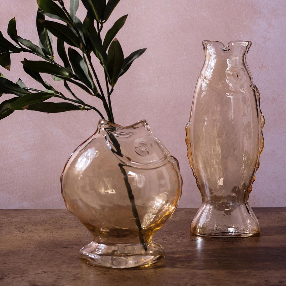 * Fun round fish design * Crafted from glass * Lovely centrepiece An a splash of fun into you home decor with the Hestia Fish Glass Rounded Vase. With its sculpted fish shape and warm tint, it brings a soft glow to your decor. The rounded glass from adds a sense of balance and charm, perfect as a standalone piece or paired with a few favourite stems. Blending elegance with creativity, it's a lovely nod to aquatic beauty. Ideal for shelves, sideboards or window sills. Full of character, it's a vase that's sure to catch the eye.