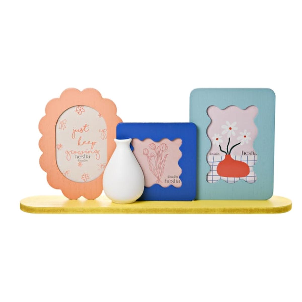 * Three freestanding frames * Two 6" x 4" and one 4" x 4" frames * Vibrant, bright colours and playful shapes * Small decorative vase for a sprig or mini bouquet Brighten your space with this joyful collage set, pairing three uniquely shaped frames with a petite vase for an easy, styled‑together look. The bold colours and wavy silhouettes bring instant personality to favourite photos, whether you’re curating holiday snaps or everyday moments. Freestanding and simple to arrange, it’s made for shelves, consoles and side tables. Just add a dried stem or faux flower to the vase and you’ve got a ready‑made display with feel‑good vibes.