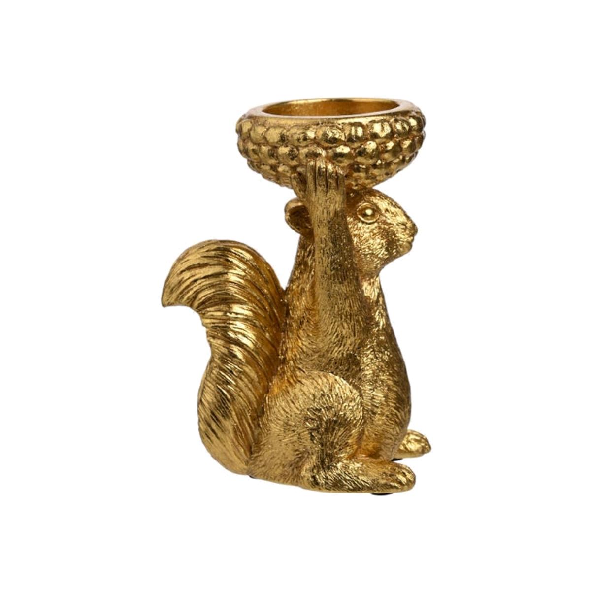 * Cute squirrel design * Gleaming gold finish * Durable resin material * Holds a tealight (not included) Bring a whimsical yet sophisticated touch to your home with the Hestia Gold Squirrel Tealight Holder. Featuring a delightful squirrel figure holding a small bowl aloft, it’s designed to fit a tealight perfectly (not included). When lit, it casts a gentle glow that adds warmth and character to any setting. A stylish accent piece that looks beautiful on side tables, shelves or as part of a seasonal display.