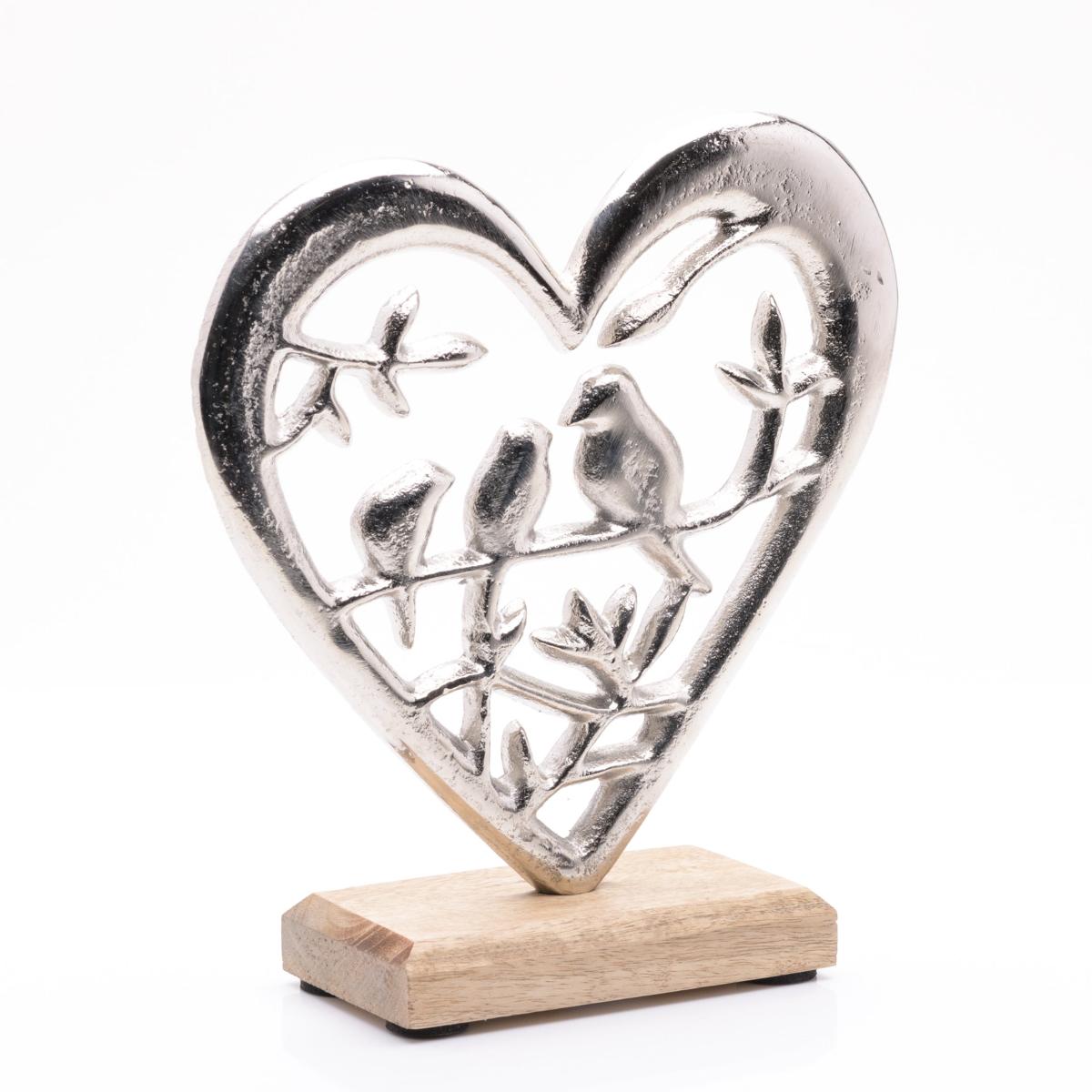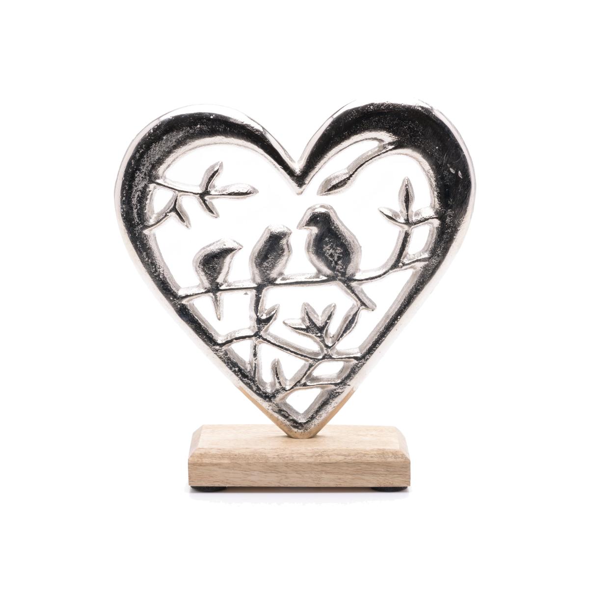 * Sturdy wooden base with metallic detailing * Elegant design * Perfect adding a calming feel to any home Celebrate affection and connection with the Hestia Metal Heart and Love Birds Ornament. Featuring a silver metal heart encircling a trio of delicately perched birds, this elegant sculpture rests on a smooth wooden base for added warmth. Symbolic and stylish, it's the perfect ornament to display on mantels, consoles, or windowsills, offering a subtle tribute to love and unity.