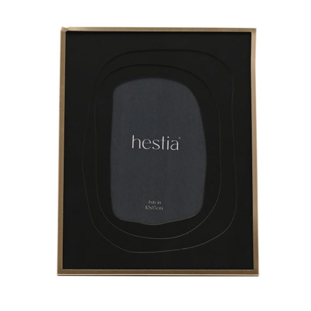 * Aluminium frame in black or gold * Layered mount for added depth * Holds a 6" x 4" photo * Freestanding design * Portrait or landscape display Showcase your favourite memories with the Hestia Aluminium Photo Frame. Its modern frame and layered mount create a refined contrast that draws attention to your photo. Designed for a 6" x 4" print, it offers flexibility with both portrait and landscape orientations. A chic, versatile piece that adds sophistication to any space. Available in a choice of colour: gold frame with black mount, or black frame with white mount.