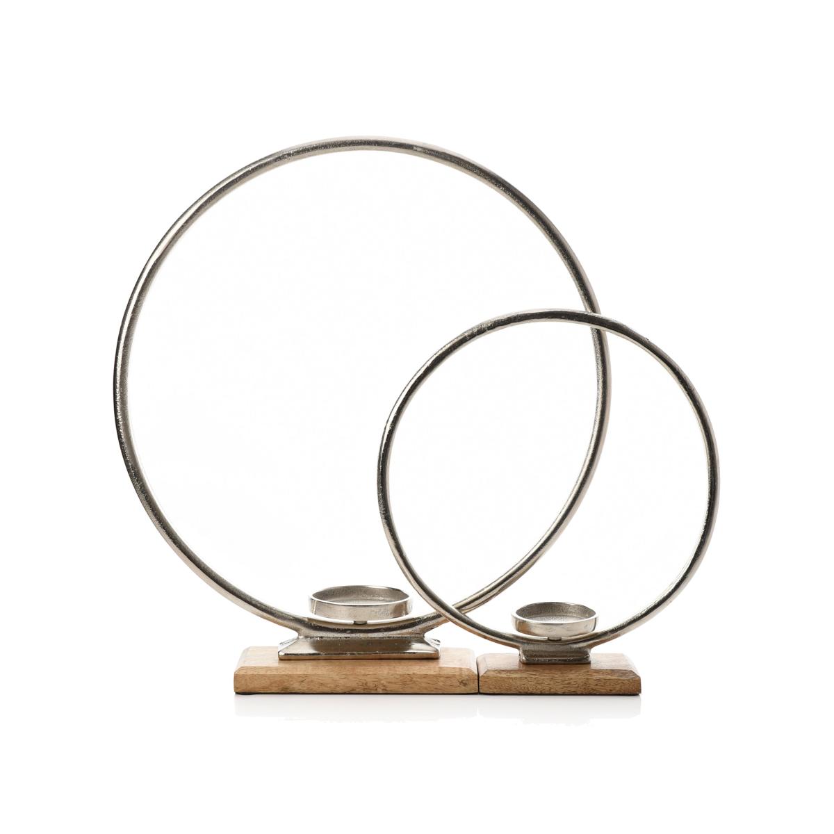* Eye catching candle holders * Modern, circular design * Durable metal composition * Set of two Add sculptural elegance to your space with the Hestia Set of 2 Metal Hoop Candle Holders. Featuring two sizes, these striking candle holders blend industrial style black metal hoops with natural wooden bases for a harmonious contrast of materials. Designed to hold tealights, each piece brings a warm and contemporary flair to shelves, console tables, or centerpieces. The paired design allows for layered styling and added visual interest - ideal for creating a serene, ambient setting in any modern home.