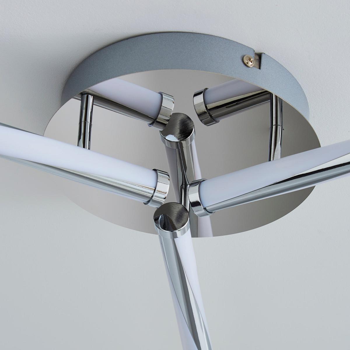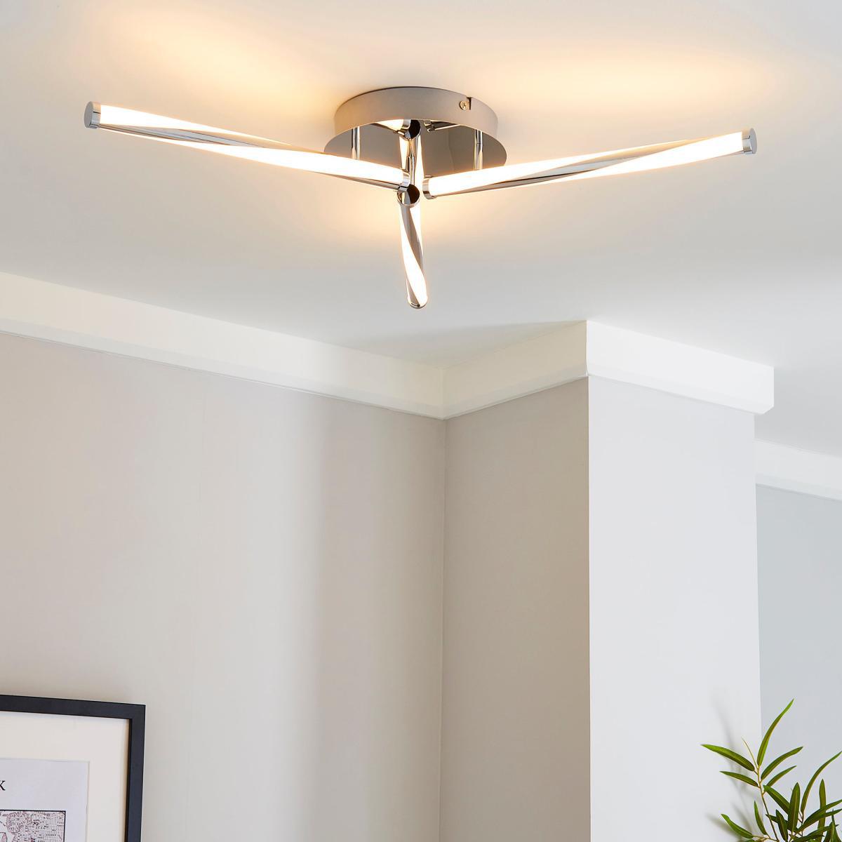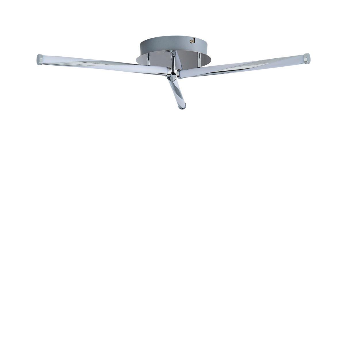 This LED ceiling light has 3 lights with a chrome back plate and integrated LED bulbs.