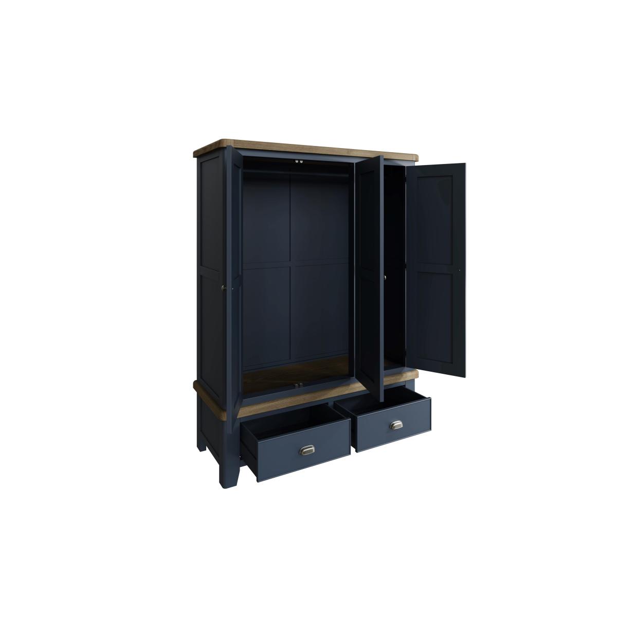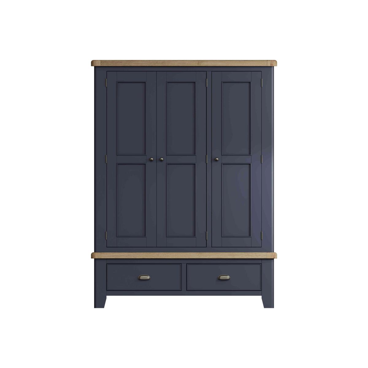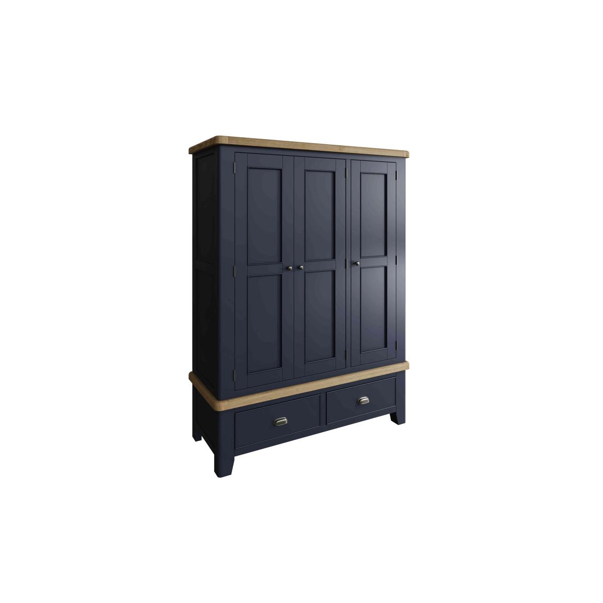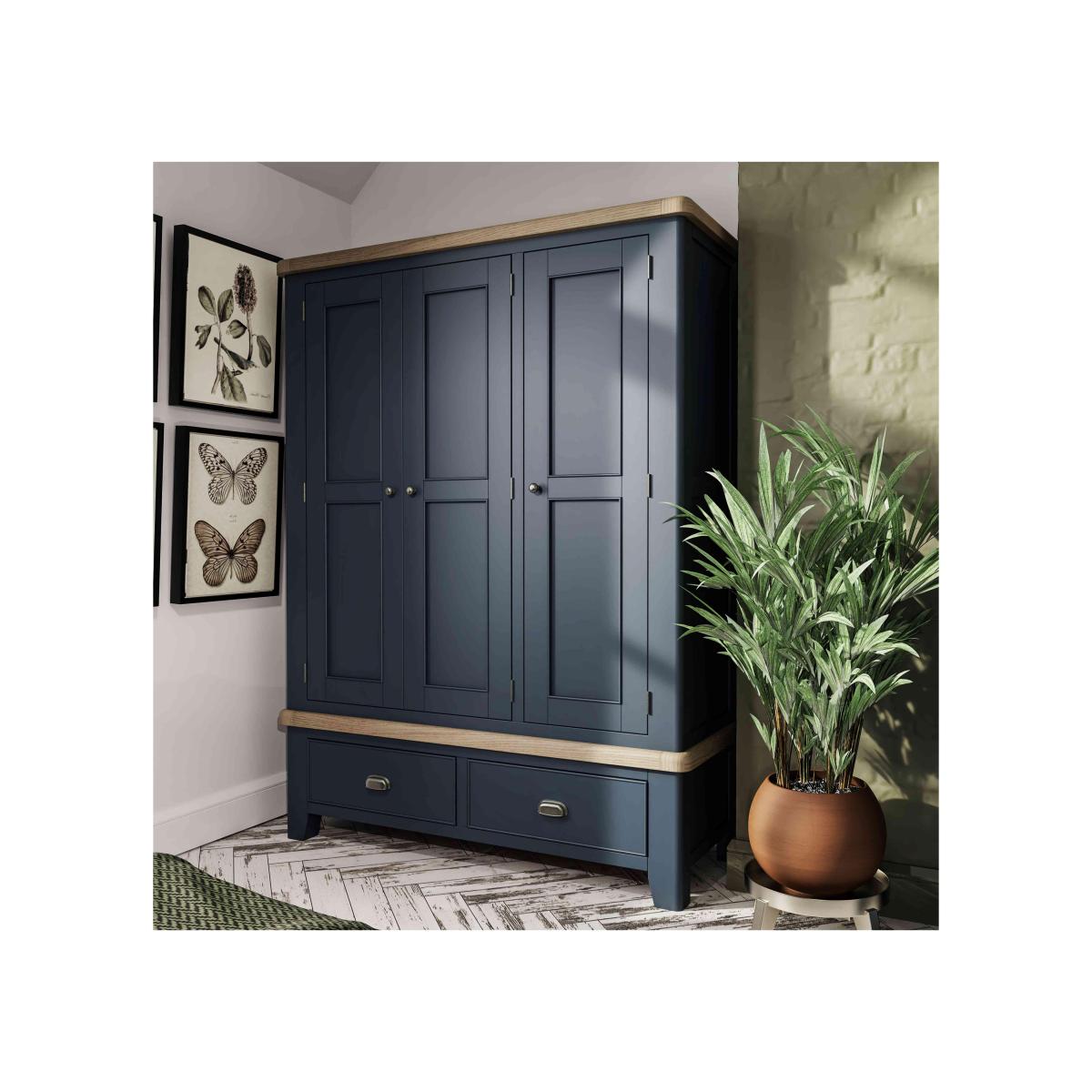 Contemporary painted furniture style meets high-end craftsmanship in the Hewitt bedroom furniture range. Finished in a deep dark blue – a colour that works equally well in modern and classic interiors – this collection is both on trend and understated. The range’s generously proportioned pieces are solidly constructed and offer elegant details like rounded oak tops as well as eminently practical storage features. The statement bed frame, for example, has two end drawers neatly finished with metal cup handles. Comprising chests of drawers, wardrobes and more, the Hewitt bedroom furniture collection is also available in an all-oak finish. Impressive both in stature and style, this fantastic wardrobe has a dark blue painted finish that’s right on trend. And with generous hanging space and roomy drawers, it’s a very practical piece too. Why you'll love it. Beautiful 3-door wardrobe with an on-trend dark blue painted finish. Traditional craftsmanship meets understated contemporary style. Generously proportioned with 2 drawers for roomy storage. Doors hide a single full-width compartment with hanging rail. Contrasting oak accents have gently rounded corners. Doors and drawers have metal handles in an antique brass finish. This wardrobe is also available in a classic all-oak finish. Part of the extensive Hewitt range of coordinating bedroom furniture. What you need to know. Painted wardrobe is made of solid pine; oak wardrobe is made of solid oak. Wardrobe space has hanging rail; 2 lower drawers. Dust with a lint-free cloth. Do not use silicon-based furniture polish. Painted finish is hardwearing but may chip if knocked. Natural oak surfaces may display knots, markings and colour variation. The Hewitt range includes a wide choice of wardrobes, chests of drawers, bed frames and more. Warning!. Furniture can tip over unexpectedly and cause injury. This item should be fixed to a wall using the anti-tip kit provided with the furniture. Be sure to use the correct wall fixings suitable for the walls in your home.