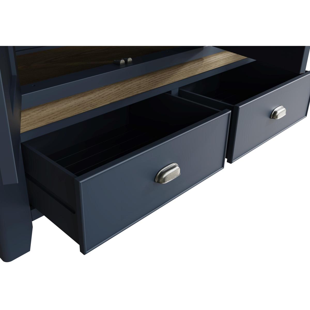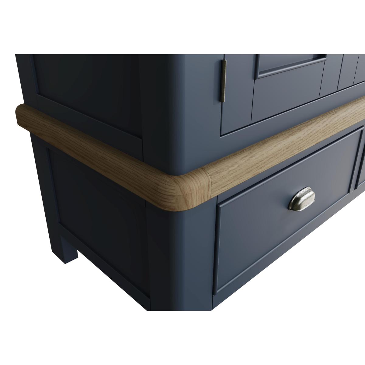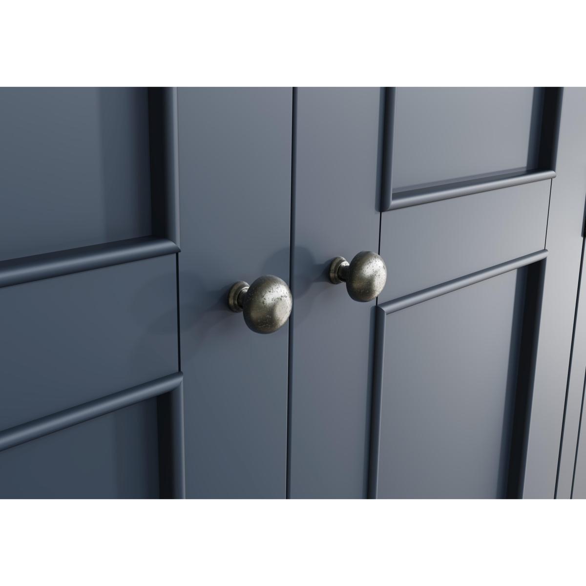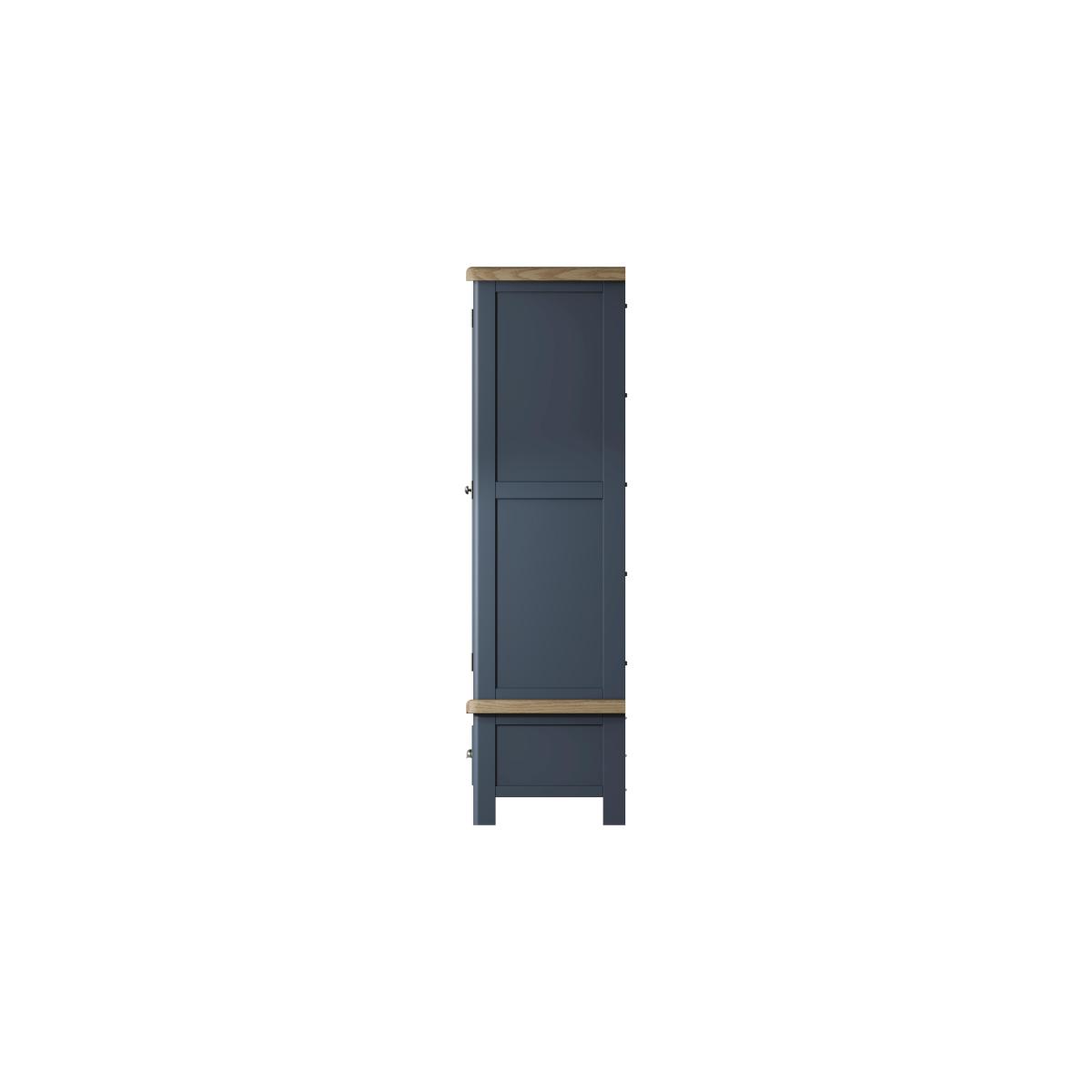 Contemporary painted furniture style meets high-end craftsmanship in the Hewitt bedroom furniture range. Finished in a deep dark blue – a colour that works equally well in modern and classic interiors – this collection is both on trend and understated. The range’s generously proportioned pieces are solidly constructed and offer elegant details like rounded oak tops as well as eminently practical storage features. The statement bed frame, for example, has two end drawers neatly finished with metal cup handles. Comprising chests of drawers, wardrobes and more, the Hewitt bedroom furniture collection is also available in an all-oak finish. Impressive both in stature and style, this fantastic wardrobe has a dark blue painted finish that’s right on trend. And with generous hanging space and roomy drawers, it’s a very practical piece too. Why you'll love it. Beautiful 3-door wardrobe with an on-trend dark blue painted finish. Traditional craftsmanship meets understated contemporary style. Generously proportioned with 2 drawers for roomy storage. Doors hide a single full-width compartment with hanging rail. Contrasting oak accents have gently rounded corners. Doors and drawers have metal handles in an antique brass finish. This wardrobe is also available in a classic all-oak finish. Part of the extensive Hewitt range of coordinating bedroom furniture. What you need to know. Painted wardrobe is made of solid pine; oak wardrobe is made of solid oak. Wardrobe space has hanging rail; 2 lower drawers. Dust with a lint-free cloth. Do not use silicon-based furniture polish. Painted finish is hardwearing but may chip if knocked. Natural oak surfaces may display knots, markings and colour variation. The Hewitt range includes a wide choice of wardrobes, chests of drawers, bed frames and more. Warning!. Furniture can tip over unexpectedly and cause injury. This item should be fixed to a wall using the anti-tip kit provided with the furniture. Be sure to use the correct wall fixings suitable for the walls in your home.