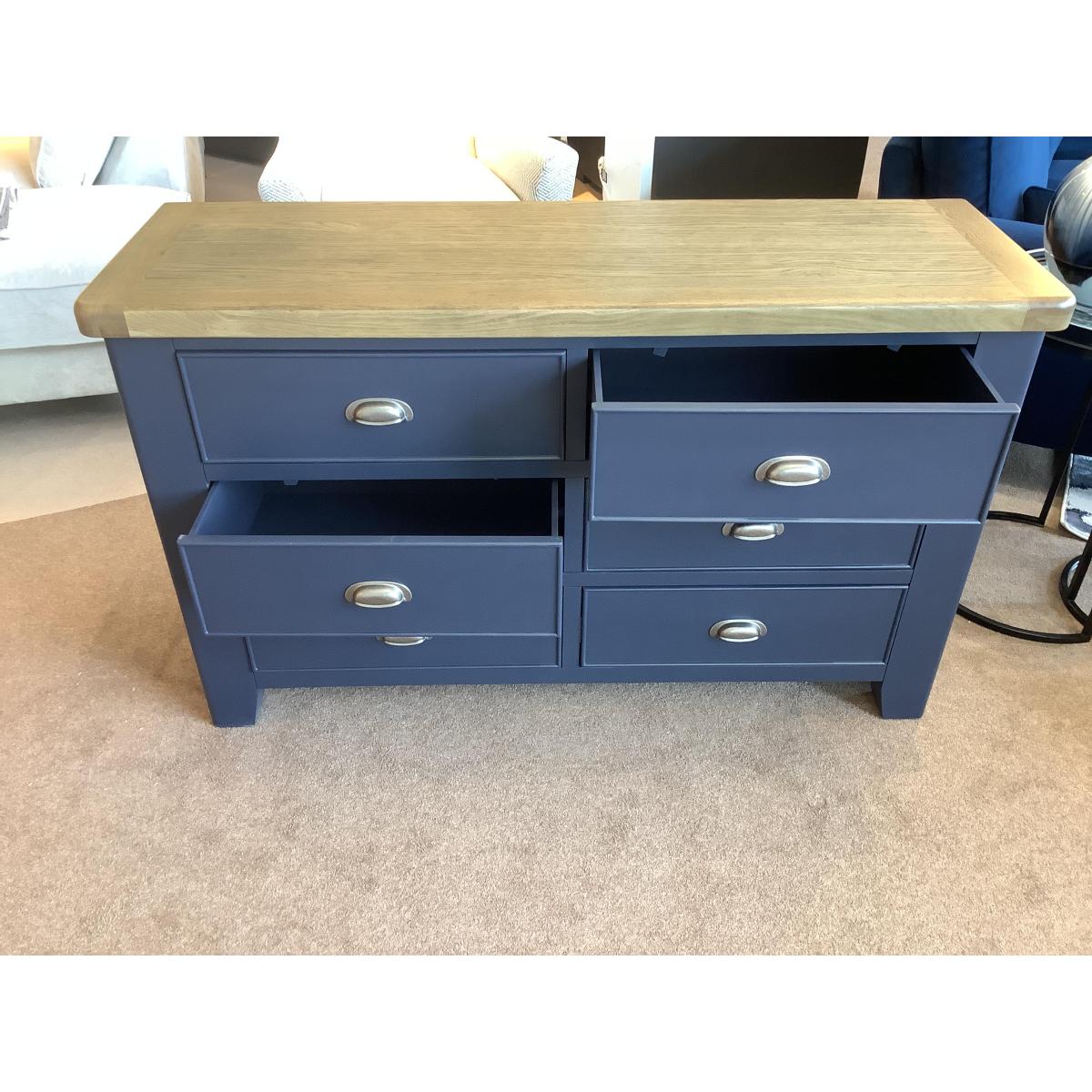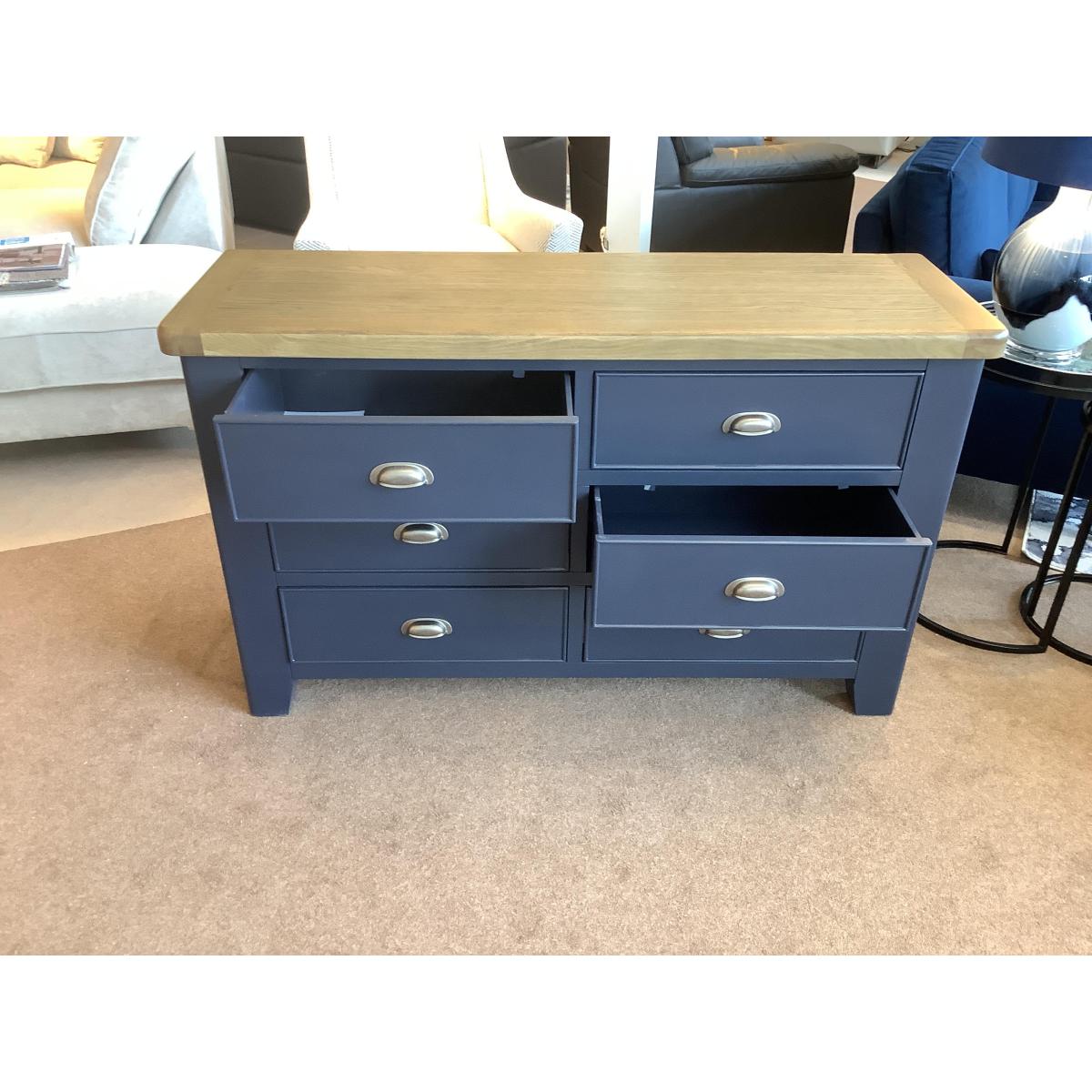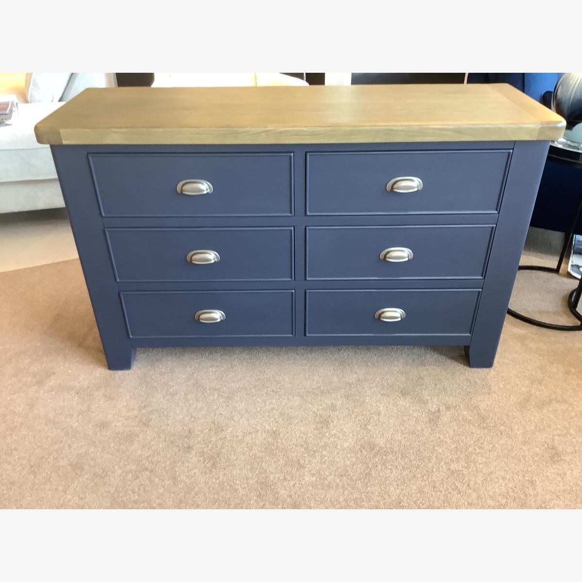For sale is the Hewitt 6 drawer chest oak top with blue painted finish.