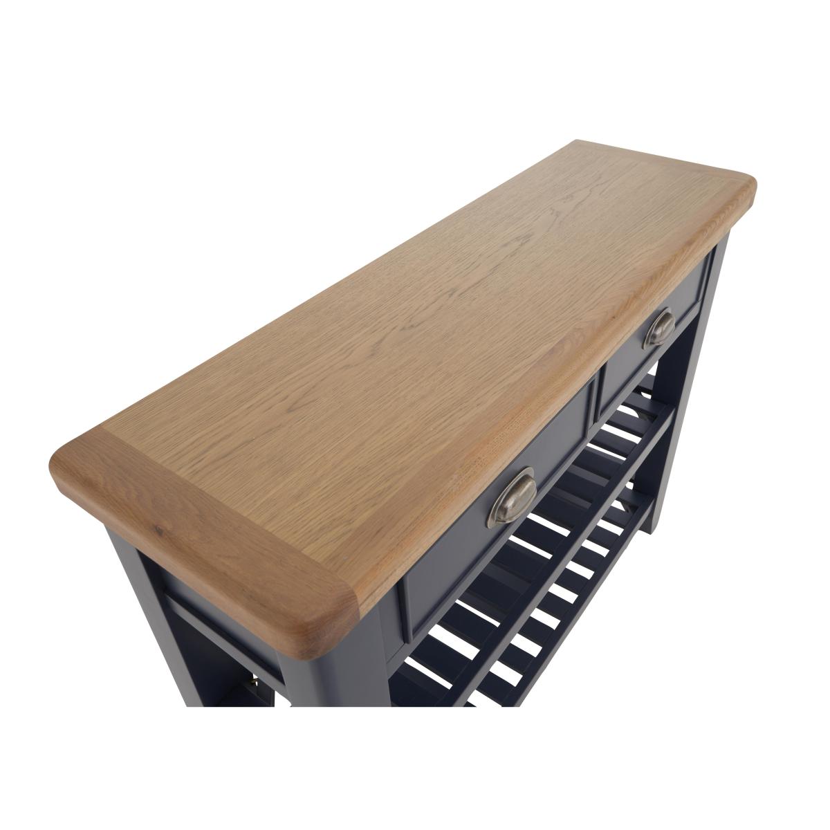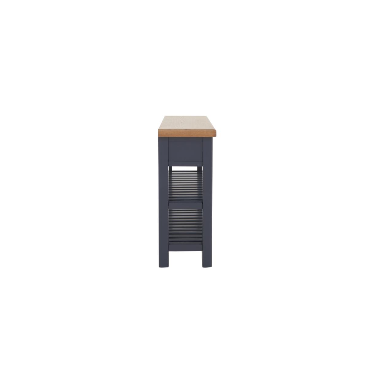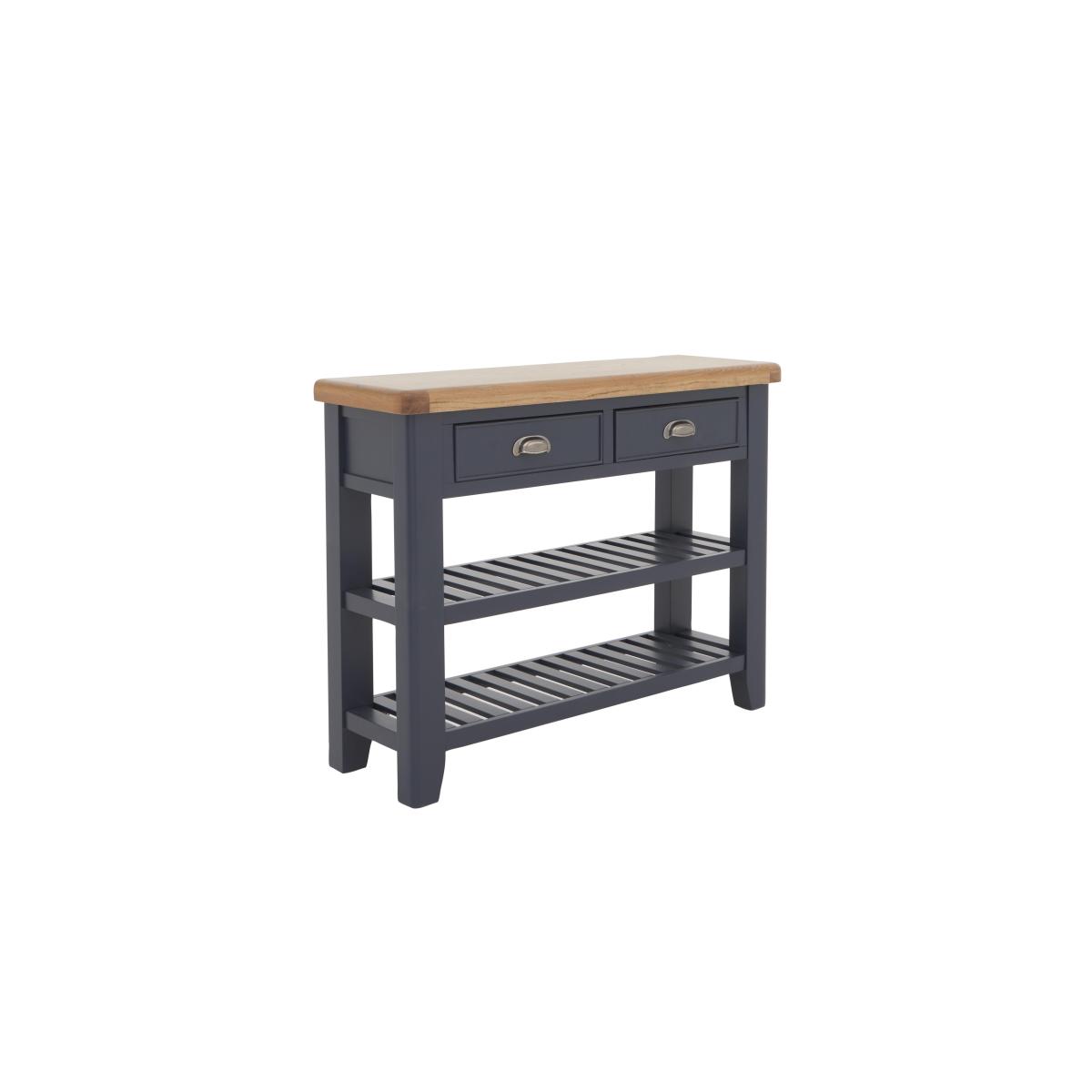 Wherever you place it – hallway, living room or dining room – this lovely console table delivers practical storage and on-trend style. We love that dark blue painted finish. Only at Furniture Village. Why you'll love it. Understated contemporary style with an on-trend dark blue painted finish. Console table showcases impressive craftsmanship. Generously proportioned storage with drawers, baskets and a lower shelf. Contrasting oak top has gently rounded corners. Drawers have metal cup handles in an antique brass finish. This console table is also available in a classic all-oak finish. Part of the extensive Hewitt range of coordinating dining furniture. Exclusive to Furniture Village. What you need to know. Made with solid oak and oak veneers. 2 drawers, 2 storage baskets, lower shelf. Dust with a lint-free cloth. Do not use silicon-based furniture polish. Painted finish is hardwearing but may chip if knocked. Natural oak surfaces may display knots, markings and colour variation. The Hewitt range includes a wide choice of dining tables, dining sets, storage furniture and more. WARNING!. Furniture can tip over unexpectedly and cause injury. This item must be fixed to a wall using the anti-tip kit provided. Be sure to use the correct wall fixings suitable for the walls in your home. Furniture Village is not able to fix anti-tip devices for you. Seek professional advice if you are unsure.