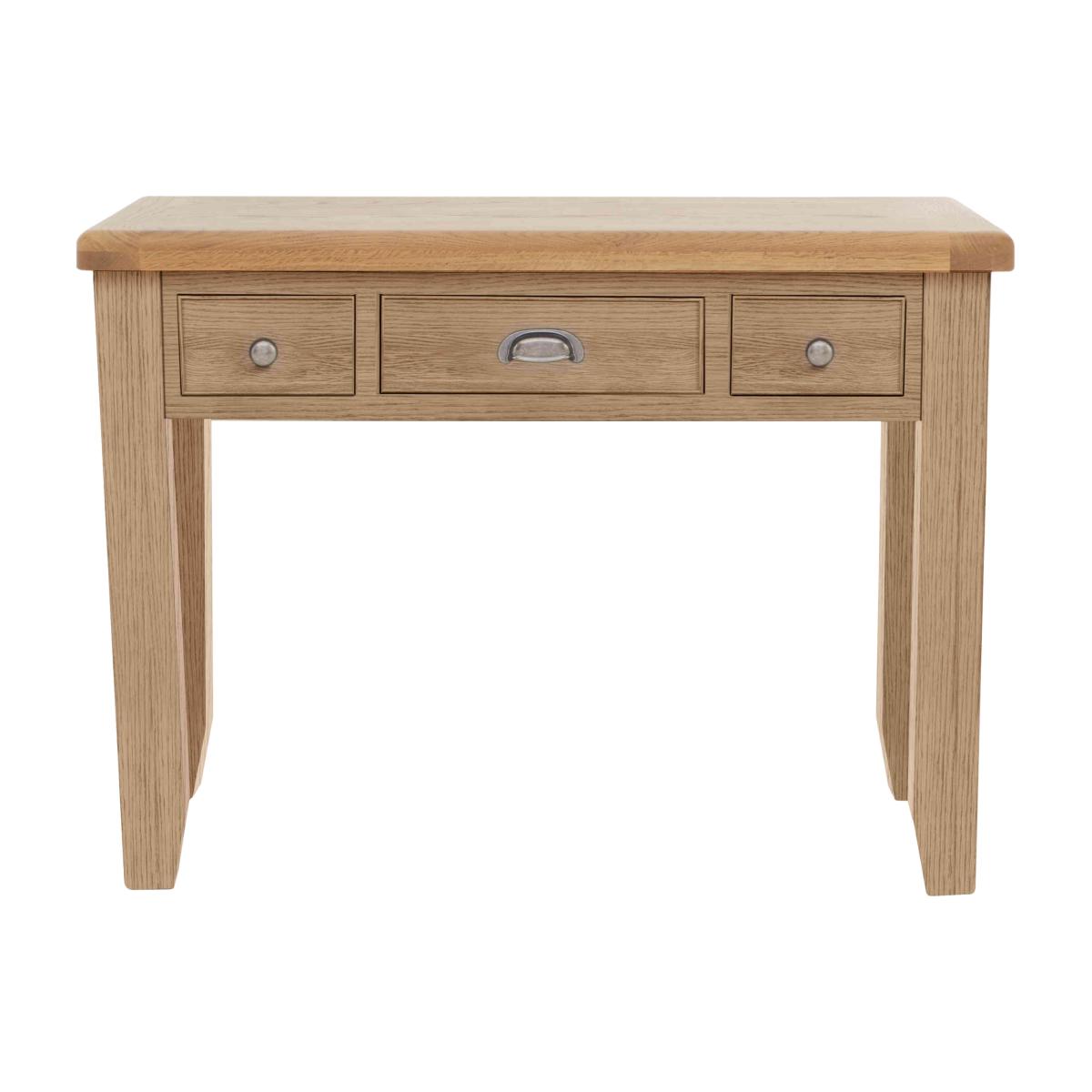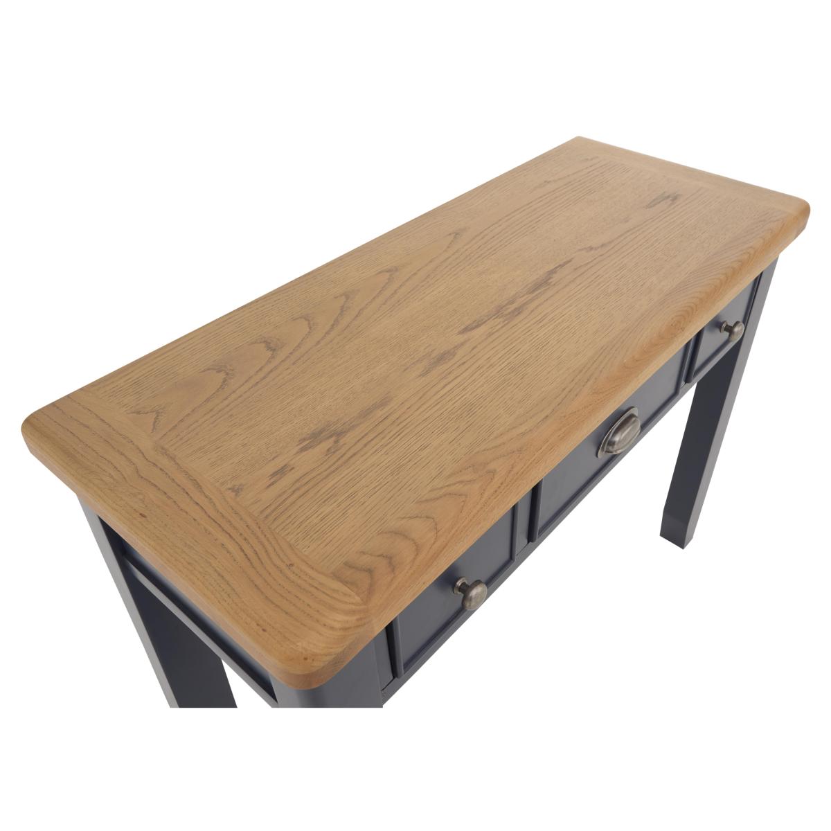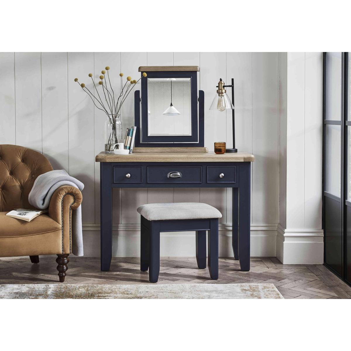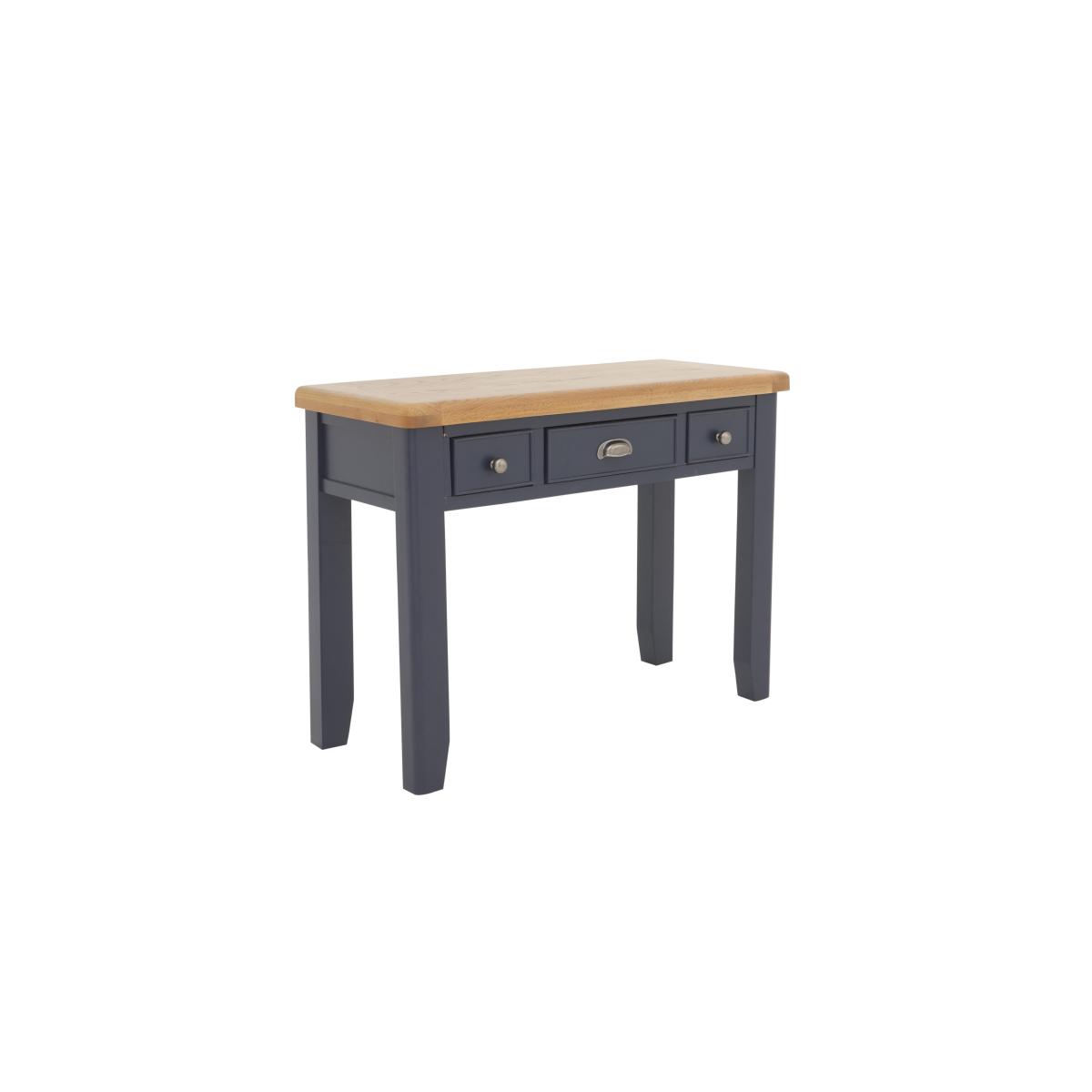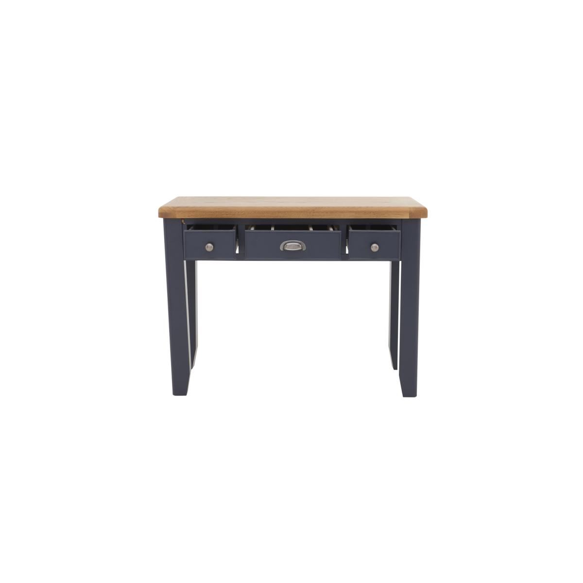 Contemporary painted furniture style meets high-end craftsmanship in the Hewitt bedroom furniture range. Finished in a deep dark blue – a colour that works equally well in modern and classic interiors – this collection is both on trend and understated. The range’s generously proportioned pieces are solidly constructed and offer elegant details like rounded oak tops as well as eminently practical storage features. The statement bed frame, for example, has two end drawers neatly finished with metal cup handles. Comprising chests of drawers, wardrobes and more, the Hewitt bedroom furniture collection is also available in an all-oak finish. With three drawers for makeup and a spacious surface for other bits and pieces, the Hewitt dressing table makes getting ready a breeze. It’s a looker too, thanks to its lovely dark blue painted finish. Only at Furniture Village. Why you'll love it. Beautiful dressing table with an on-trend dark blue painted finish. Traditional craftsmanship meets understated contemporary style. Generously proportioned with practical drawer storage. Contrasting oak top has gently rounded corners. 3 drawers have metal cup handles in an antique brass finish. This dressing table is also available in a classic all-oak finish. Part of the extensive Hewitt range of coordinating bedroom furniture. Exclusive to Furniture Village. What you need to know. Painted dressing table is made of solid pine; oak dressing table is made of solid oak. 3 drawers. Dust with a lint-free cloth. Do not use silicon-based furniture polish. Painted finish is hardwearing but may chip if knocked. Natural oak surfaces may display knots, markings and colour variation. The Hewitt range includes a wide choice of wardrobes, chests of drawers, bed frames and more. Warning!. Furniture can tip over unexpectedly and cause injury. This item should be fixed to a wall using the anti-tip kit provided with the furniture. Be sure to use the correct wall fixings suitable for the walls in your home.