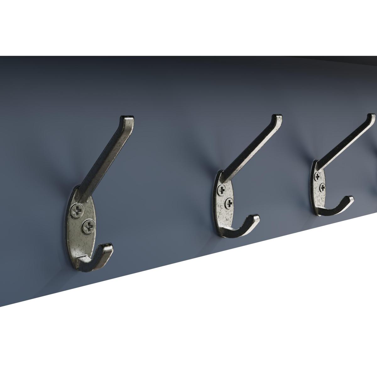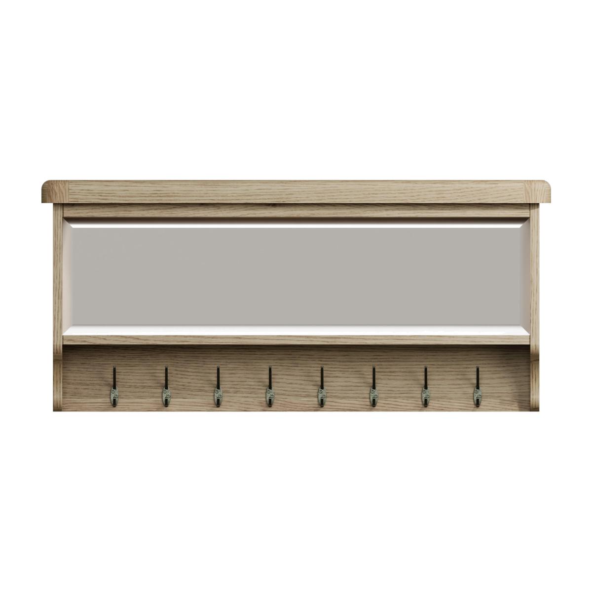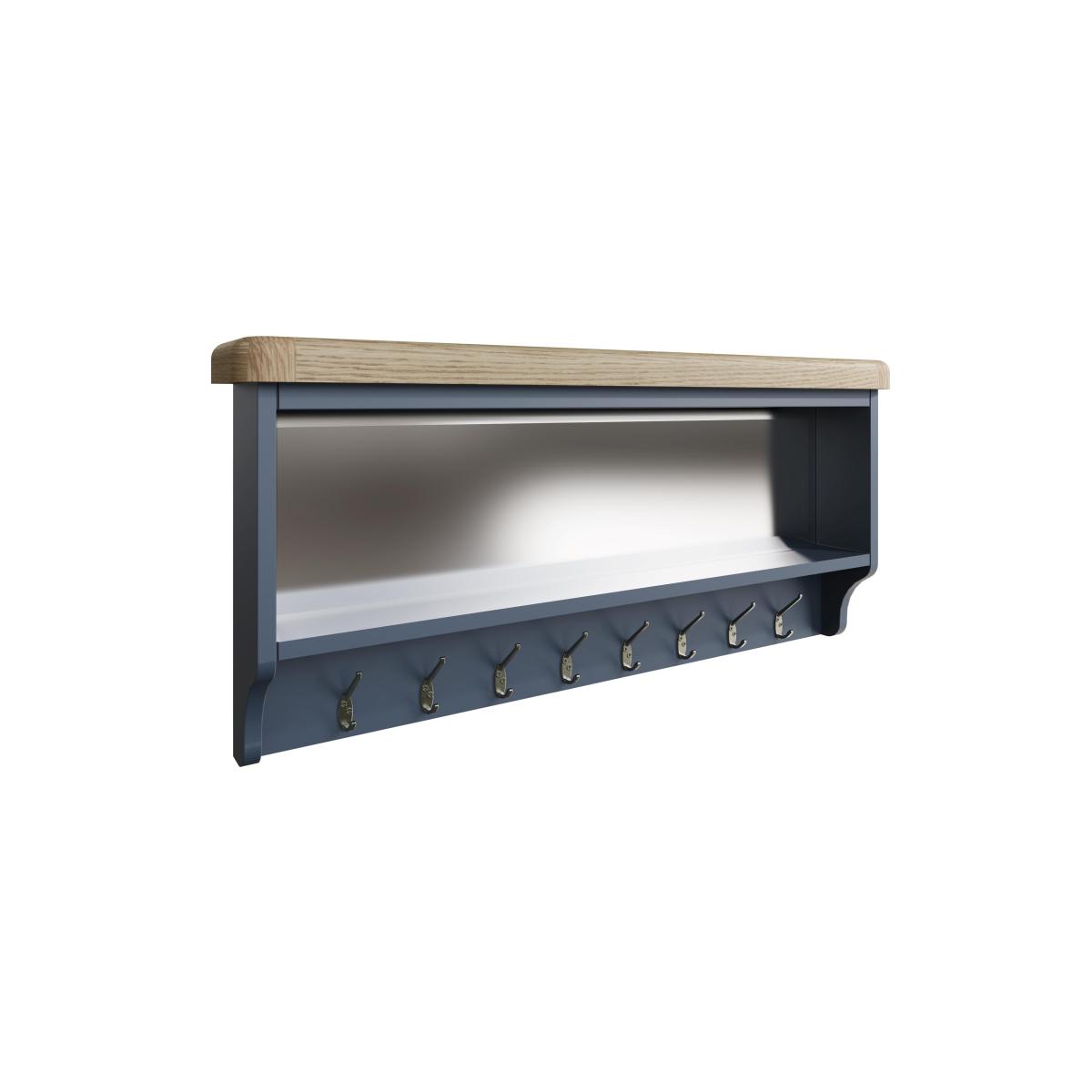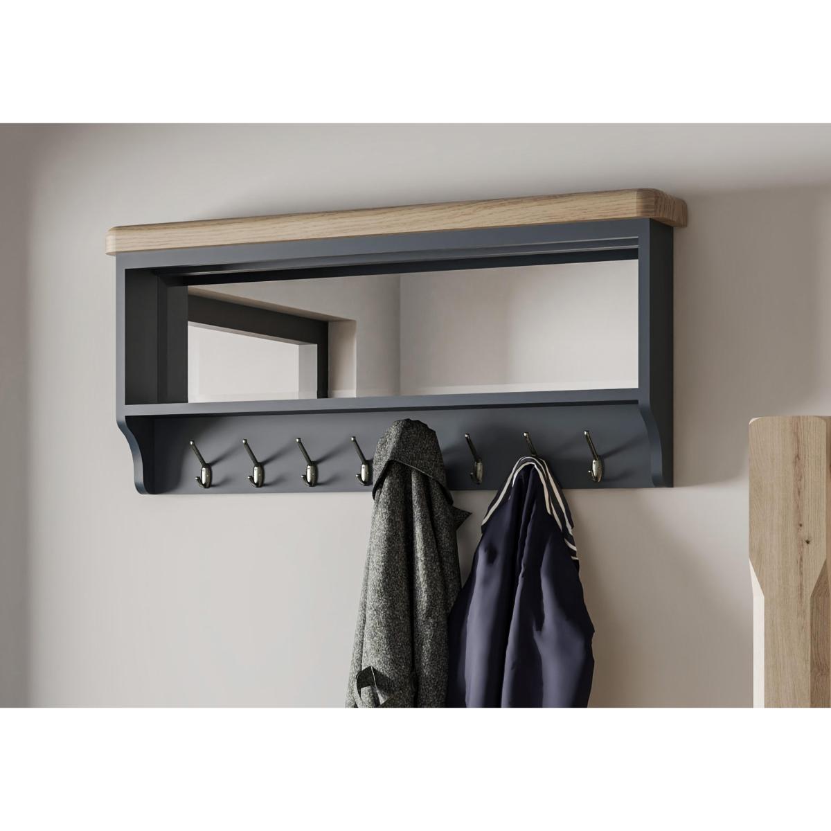 Complement the storage provided by your Hewitt hall bench with this top unit – a clever combination of coat hooks, mirror and shelf. Well-crafted and with a fashionable painted finish in dark blue. Why you'll love it. Understated contemporary style with an on-trend dark blue painted finish. Bench top showcases impressive craftsmanship. Generously proportioned for useful hallway storage. With 8 coat hooks, a shelf and a mirror. Contrasting oak top has gently rounded corners. This hall bench top is also available in a classic all-oak finish. Part of the extensive Hewitt range of coordinating dining furniture. Pairs with the Hewitt hall bench, a useful unit with shoe storage and a cushioned seat. What you need to know. Made with solid oak and oak veneers. Dust with a lint-free cloth. Do not use silicon-based furniture polish. Painted finish is hardwearing but may chip if knocked. Natural oak surfaces may display knots, markings and colour variation. The Hewitt range includes a wide choice of dining tables, dining sets, storage furniture and more.