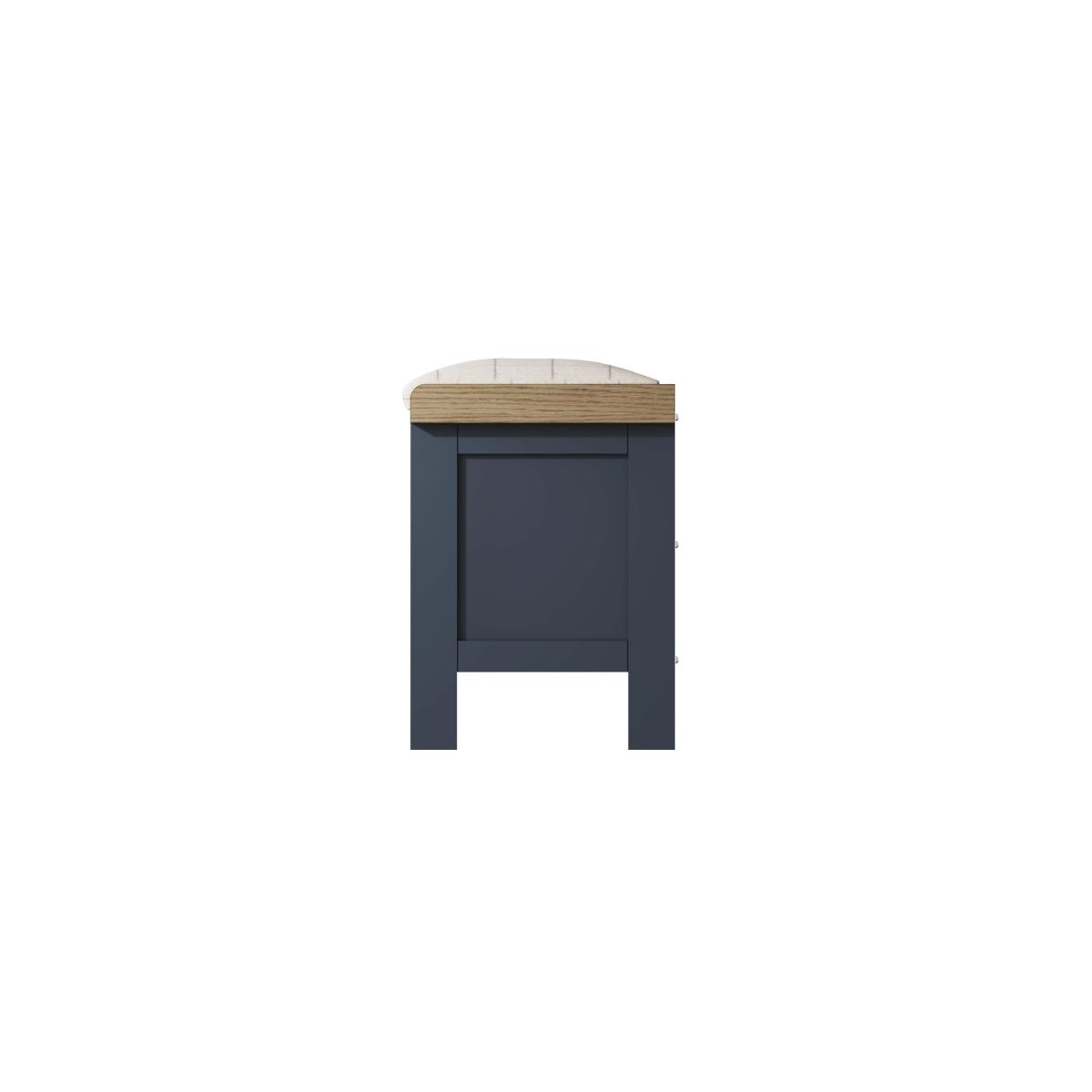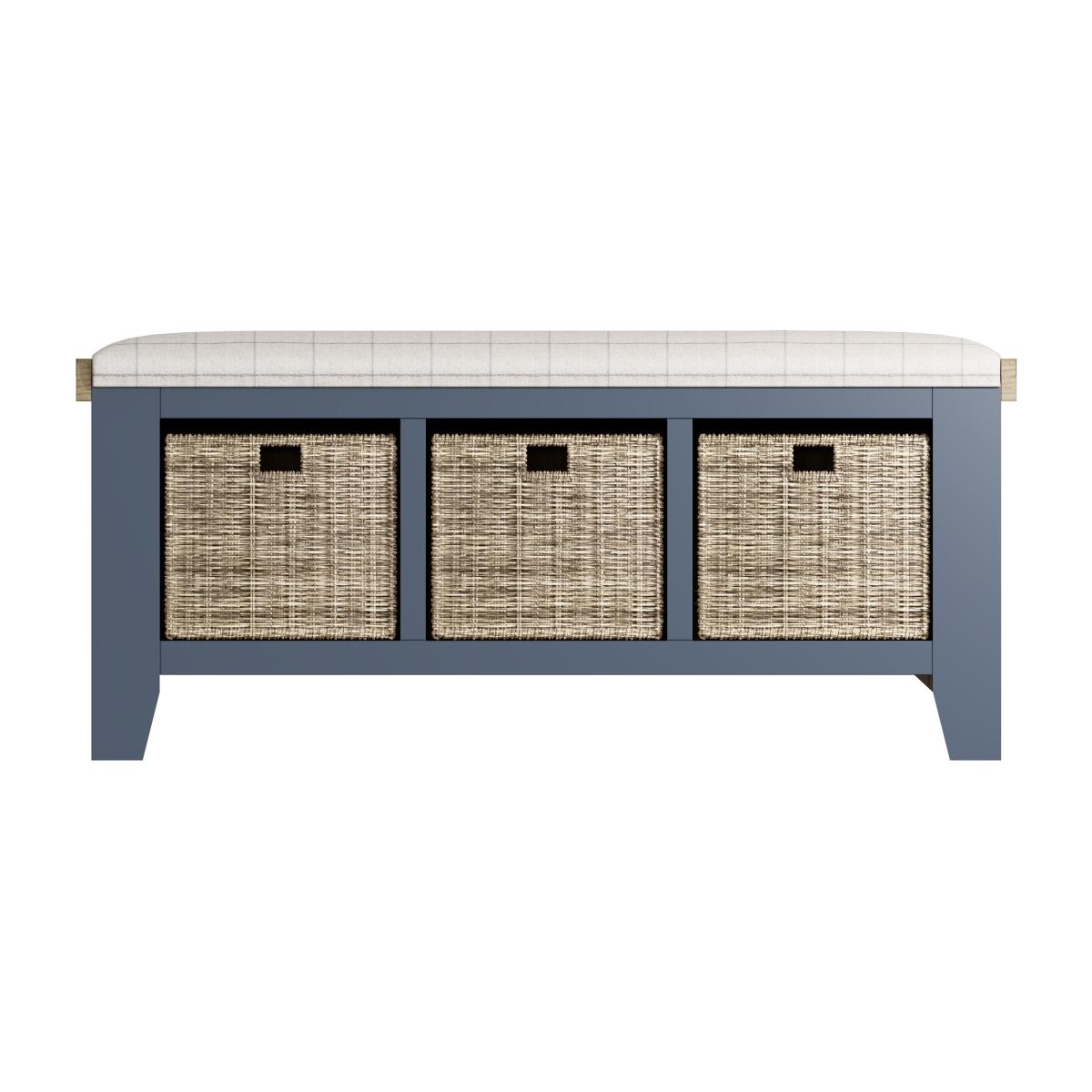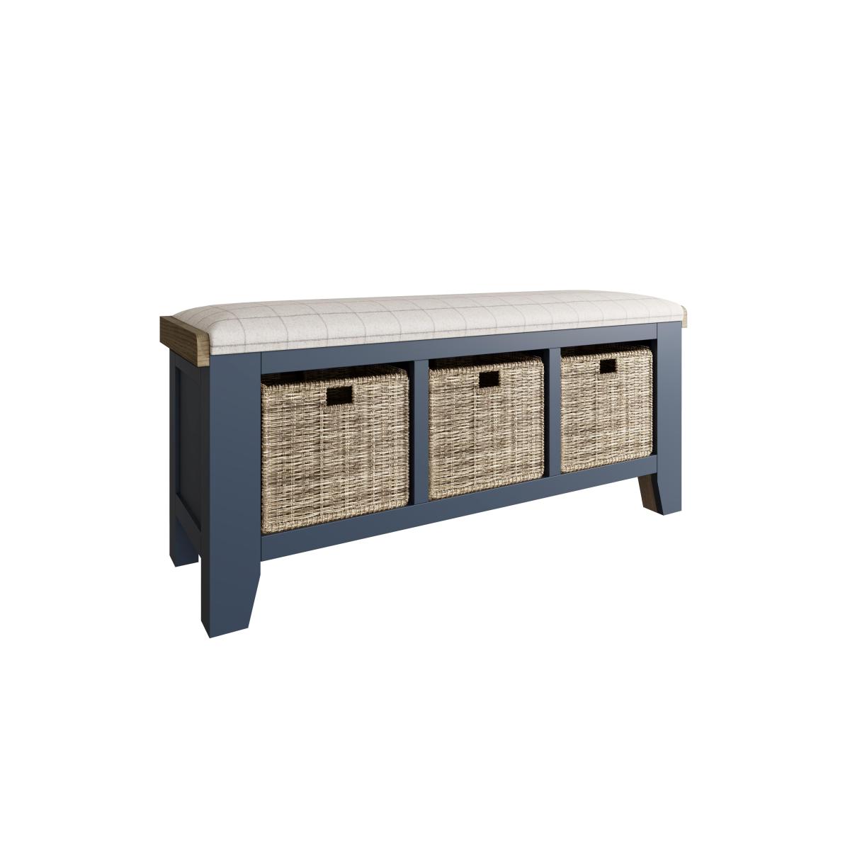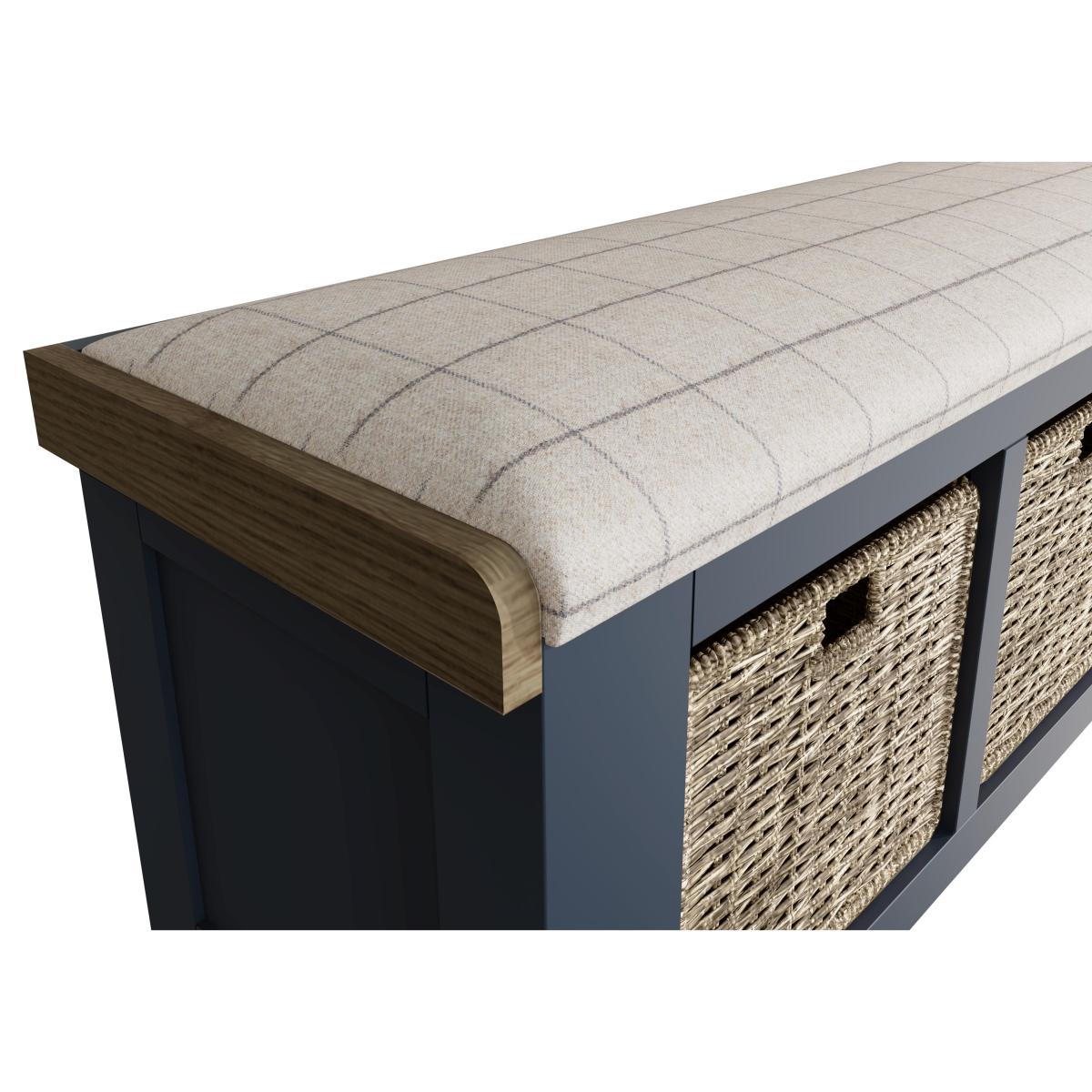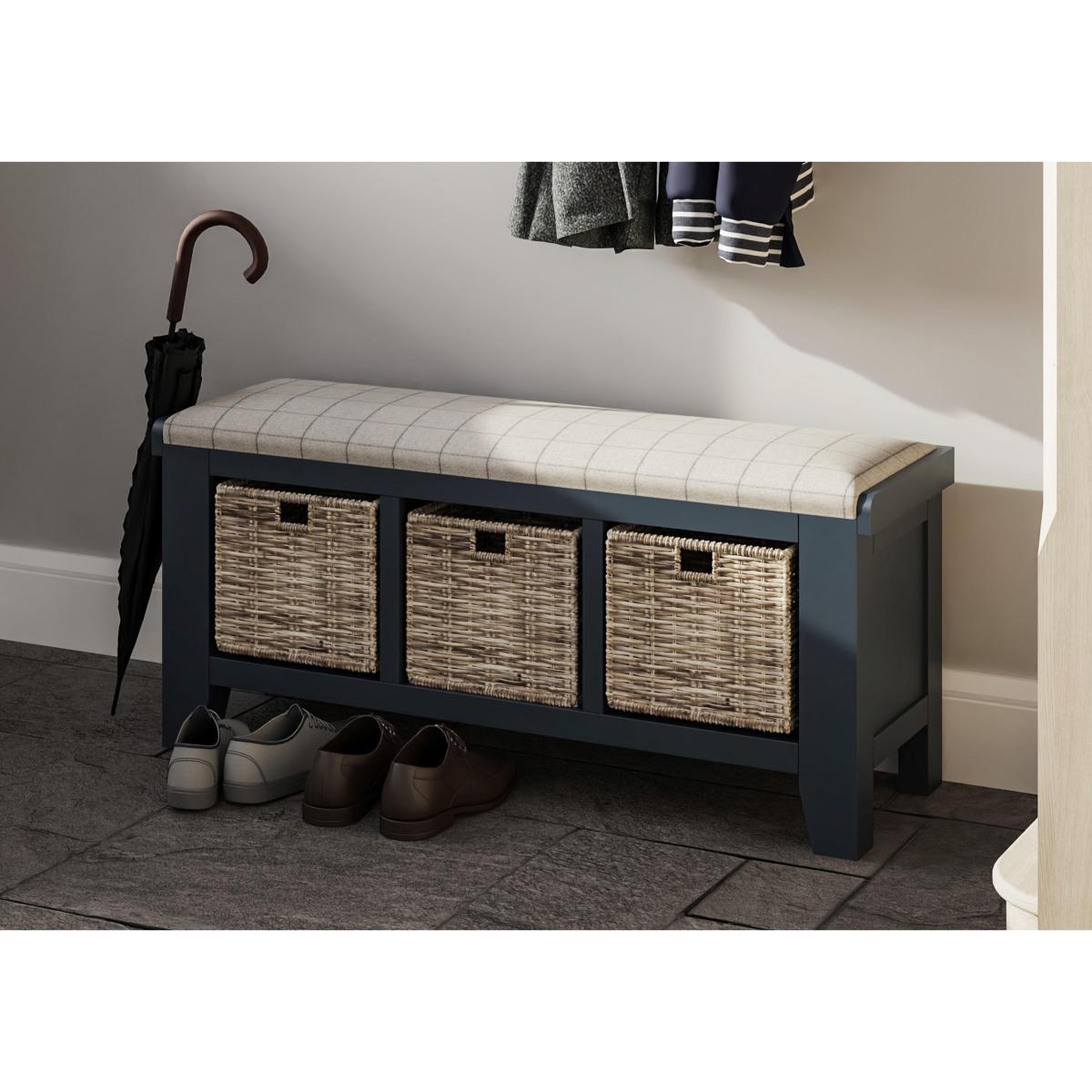 Functionality meets elegant contemporary style in this practical hall bench. There’s ample storage for shoes, hats, gloves and more in the three baskets, and the cushioned seat is a comfy place to sit as you tie your shoes. Why you'll love it. Understated contemporary style with an on-trend dark blue painted finish. Hall bench with baskets showcases impressive craftsmanship. Generously proportioned to provide practical storage and seating. Cushioned seat is upholstered in a chequered wool fabric. Contrasting oak top has gently rounded corners. This bench is also available in oak with natural chequered wool fabric upholstery. Part of the extensive Hewitt range of coordinating dining furniture. Pairs with the Hewitt hall bench top, a useful unit with coat hooks, shelf and mirror. What you need to know. Made with solid oak and oak veneers. 3 baskets. Dust with a lint-free cloth. Do not use silicon-based furniture polish. Painted finish is hardwearing but may chip if knocked. Natural oak surfaces may display knots, markings and colour variation. The Hewitt range includes a wide choice of dining tables, dining sets, storage furniture and more.