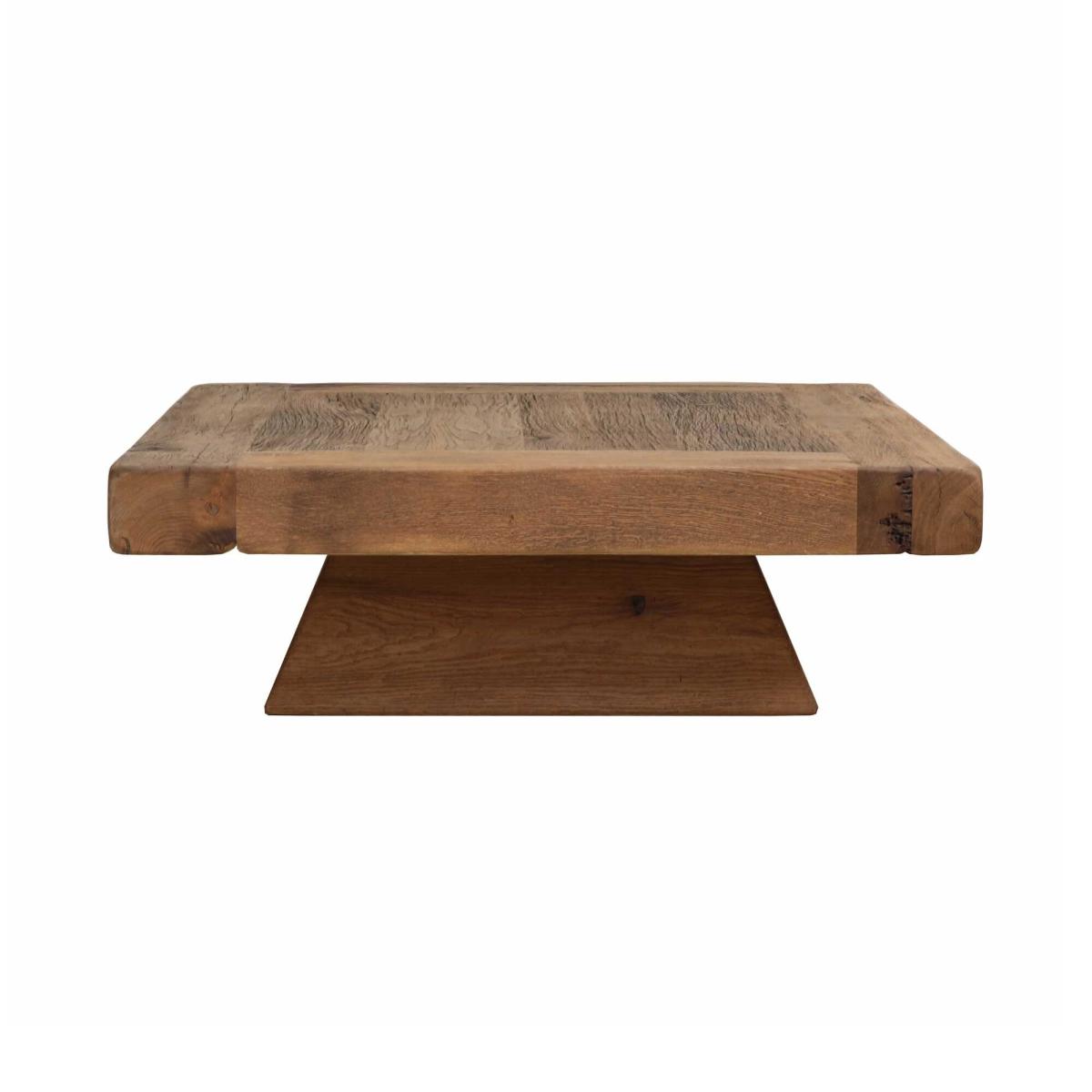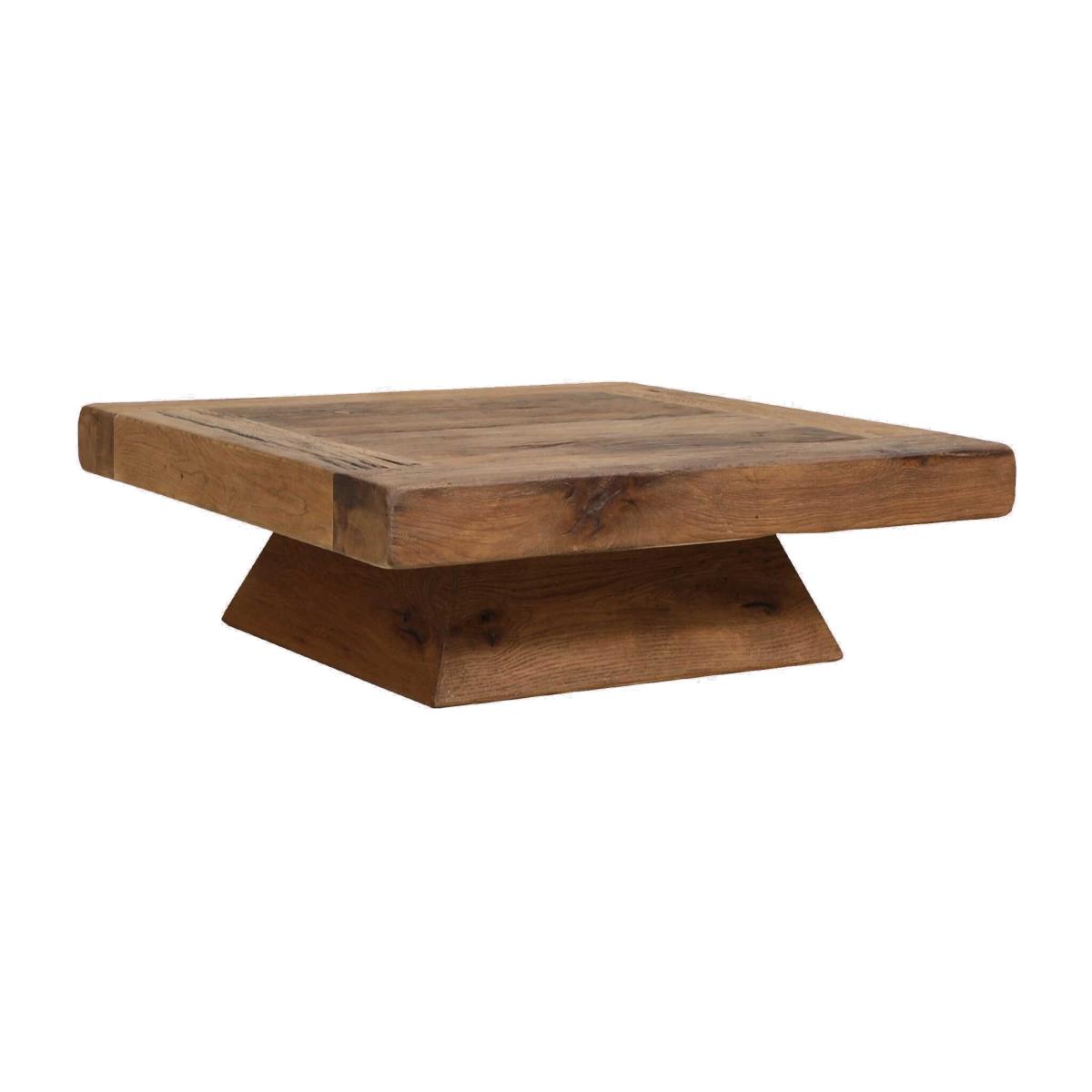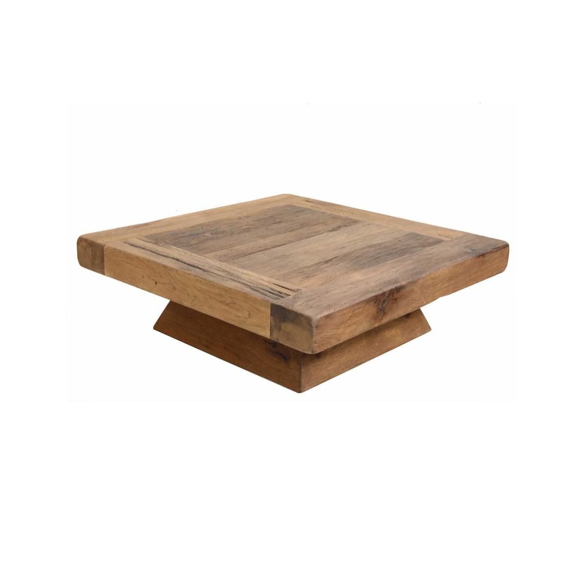 Made from 100% recycled oak, this coffee table features a striking square top and a bold pyramid-style base. Its unique design blends rustic character with sculptural elegance, making it a standout piece in any living space.