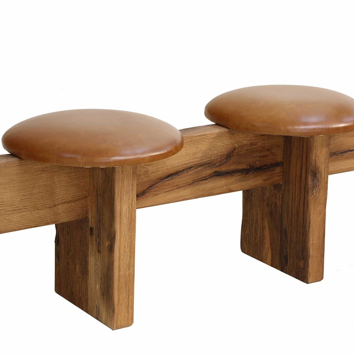 Crafted from 100% recycled oak, this bench combines sustainability with timeless style. Each seat features a smooth, rounded leather cushion for added comfort, while the rich wood grain and natural texture highlight its unique character. Perfect for entryways or shared spaces, it brings warmth and elegance to any setting.