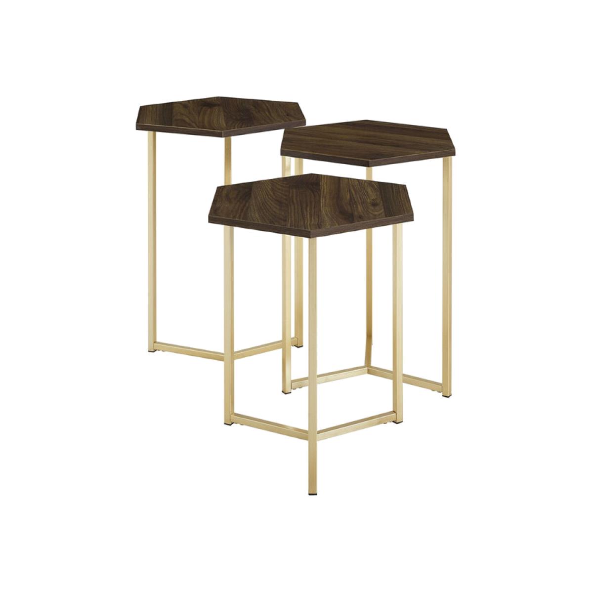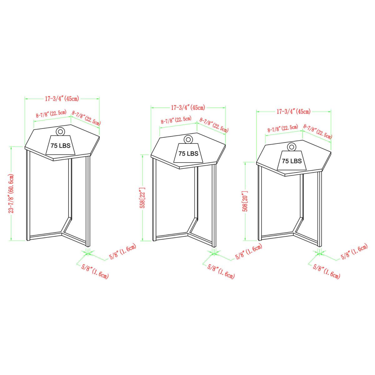 Designed with uniqueness and modern style in mind, this Hexa Set of 3 Modern Nest Tables will make a stunning transitional statement to your home. Their versatility gives you options to choose where you want to place them, making it easy to find a use for each. All are made with hexagon-shaped table tops and metal framing for a mixed element appeal. From pairing the three together in your living room for displaying décor on and then when the room is needed simply fit them together to save space or spread them out among your home and use one as a side table next to a chair, one as a sofa table, and the last as a nightstand in your bedroom.