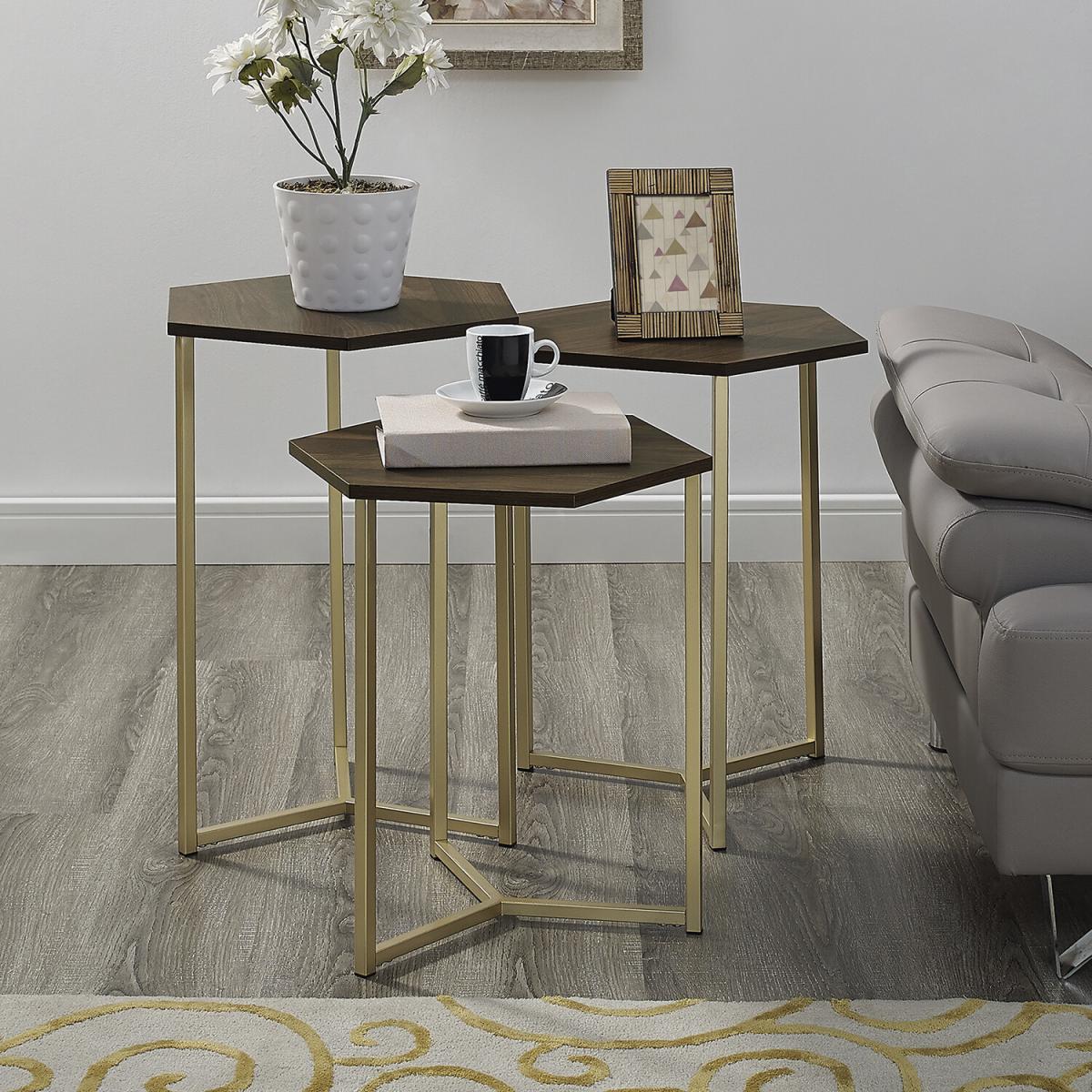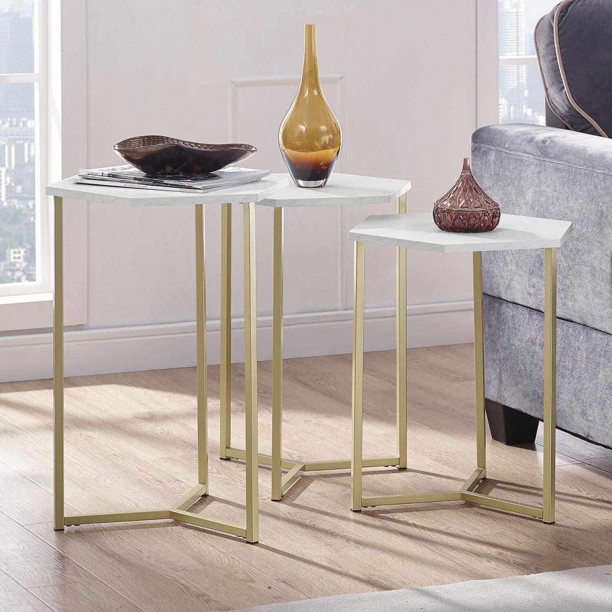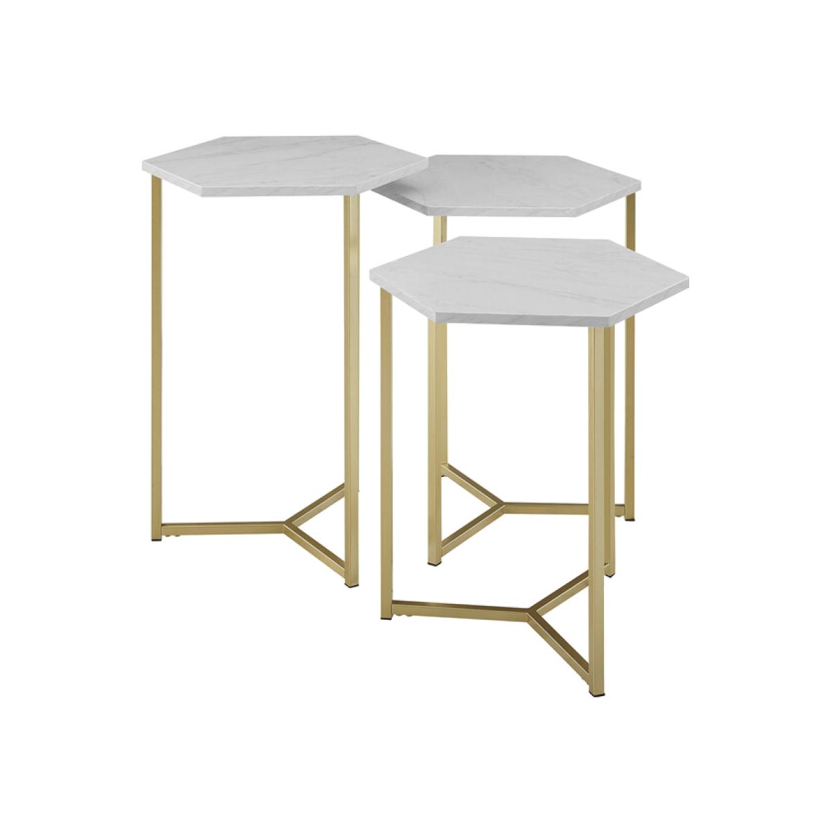 Designed with uniqueness and modern style in mind, this Hexa Set of 3 Modern Nest Tables will make a stunning transitional statement to your home. Their versatility gives you options to choose where you want to place them, making it easy to find a use for each. All are made with hexagon-shaped table tops and metal framing for a mixed element appeal. From pairing the three together in your living room for displaying décor on and then when the room is needed simply fit them together to save space or spread them out among your home and use one as a side table next to a chair, one as a sofa table, and the last as a nightstand in your bedroom.