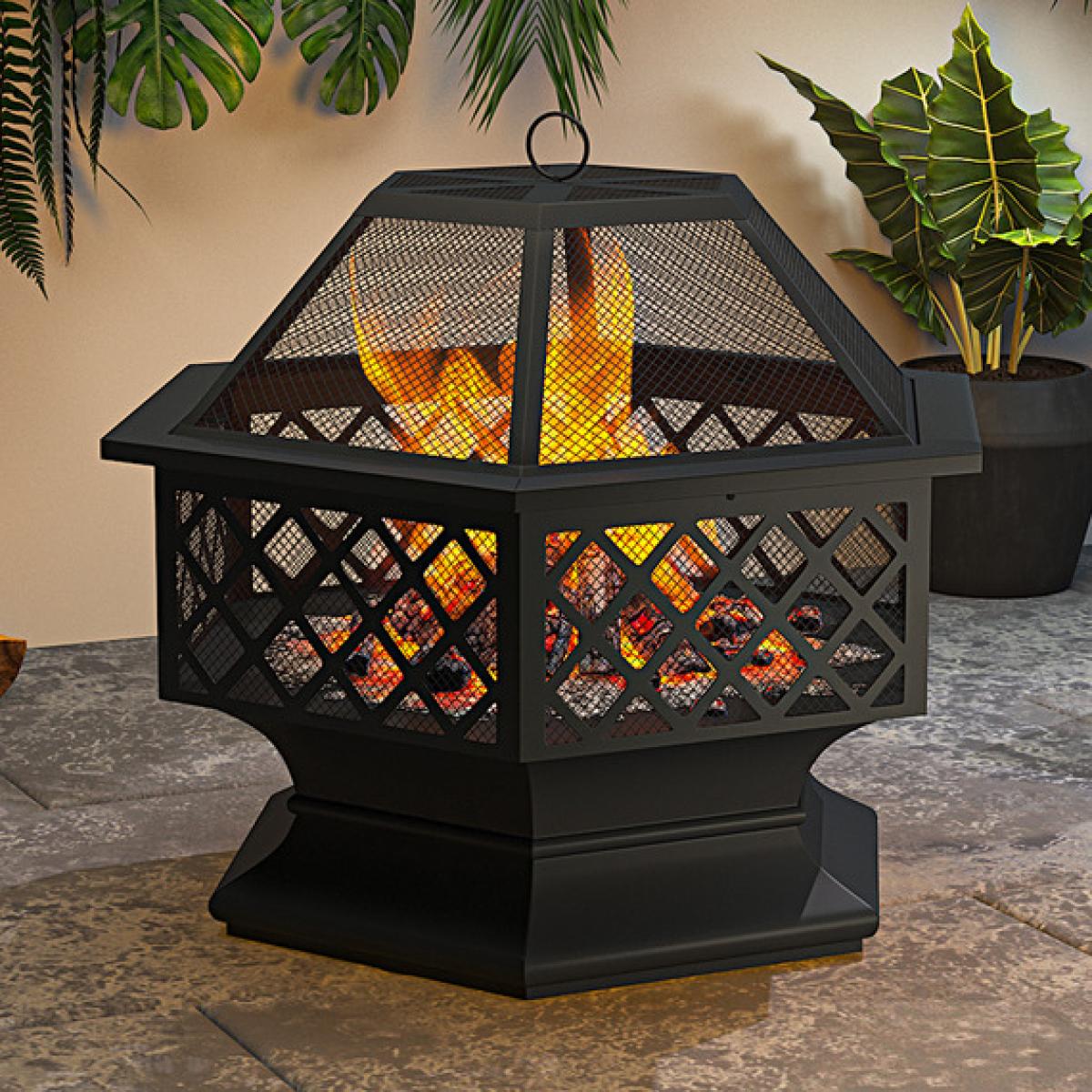 Hexagon Cast Steel Fire Pit Outdoor Brazier Stove Burner Patio - Black