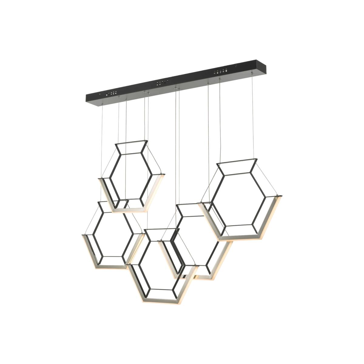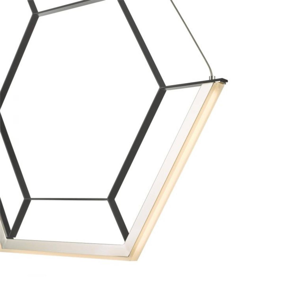 Stunning LED ceiling light boasting a satin black and polished chrome finish. Update your interiors with the dramatic LED Hexagon 5 pendant light. Boasting modern satin black hexagonal frames in varying sizes, this light is complete with polished chrome detailing. The subtle LED downlight offers a warm and welcoming ambience. This highly contemporary piece will look great in both commercial and residential spaces above bars, kitchen islands, and dining tables.