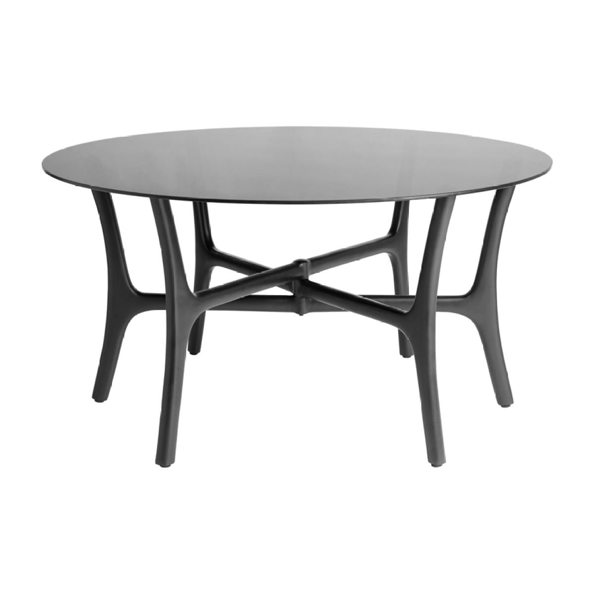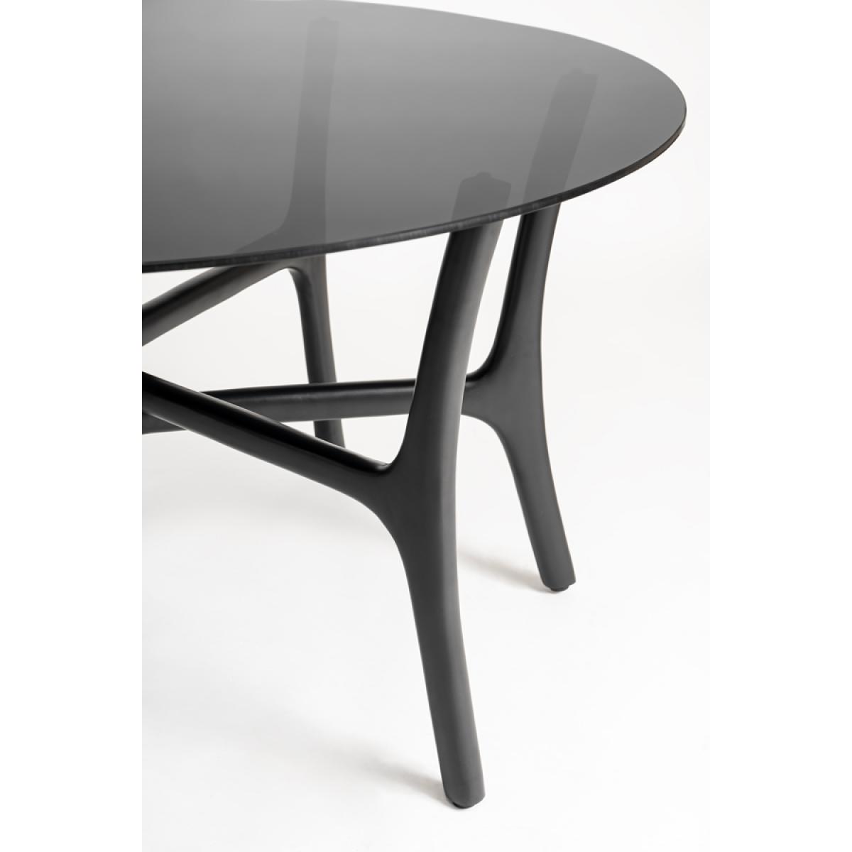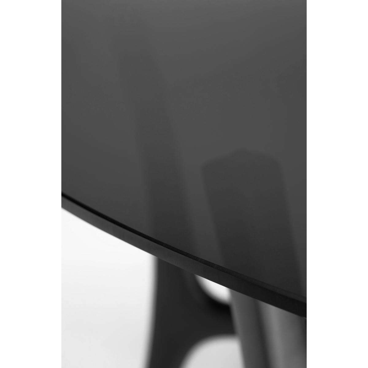 Sculptural six-seater dining table. Form inspired by highly-collectable 1960s American artisan furniture. Toughened transparent black glass top. Aluminium base with black powder-coated finish and height-adjustable feet. Base supplied in three parts which simply bolt together from the underside. We recommend levelling the base using the height-adjustable feet and a spirit level prior to adding the top.