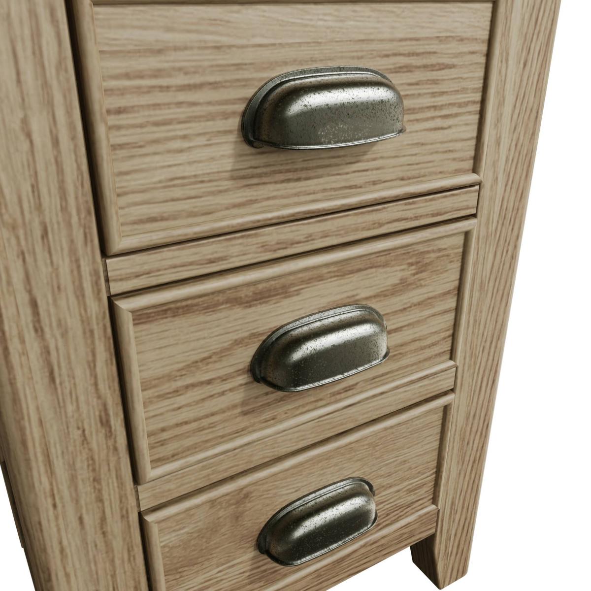 Create a stunning look for your bedroom with the Hexham Furniture collection. With chunky oak tops and smooth rounded corners combined with the eye-catching smoked oak finish, this bedroom furniture collection exudes class and style and will be sure to make a statement in any home. Smoked Oak Finish Solid Wood Frame and Oak Veneer Antique Effect Cup Handle Thick Rounded Oak Top Tapered Legs Dovetailed Drawers Ready Assembled Dimensions - W: 42cm x D: 32cm x H: 58cm All screens vary in colour reproduction and whilst every effort has been made to display the colour as accurately as possible it is for guidance only.