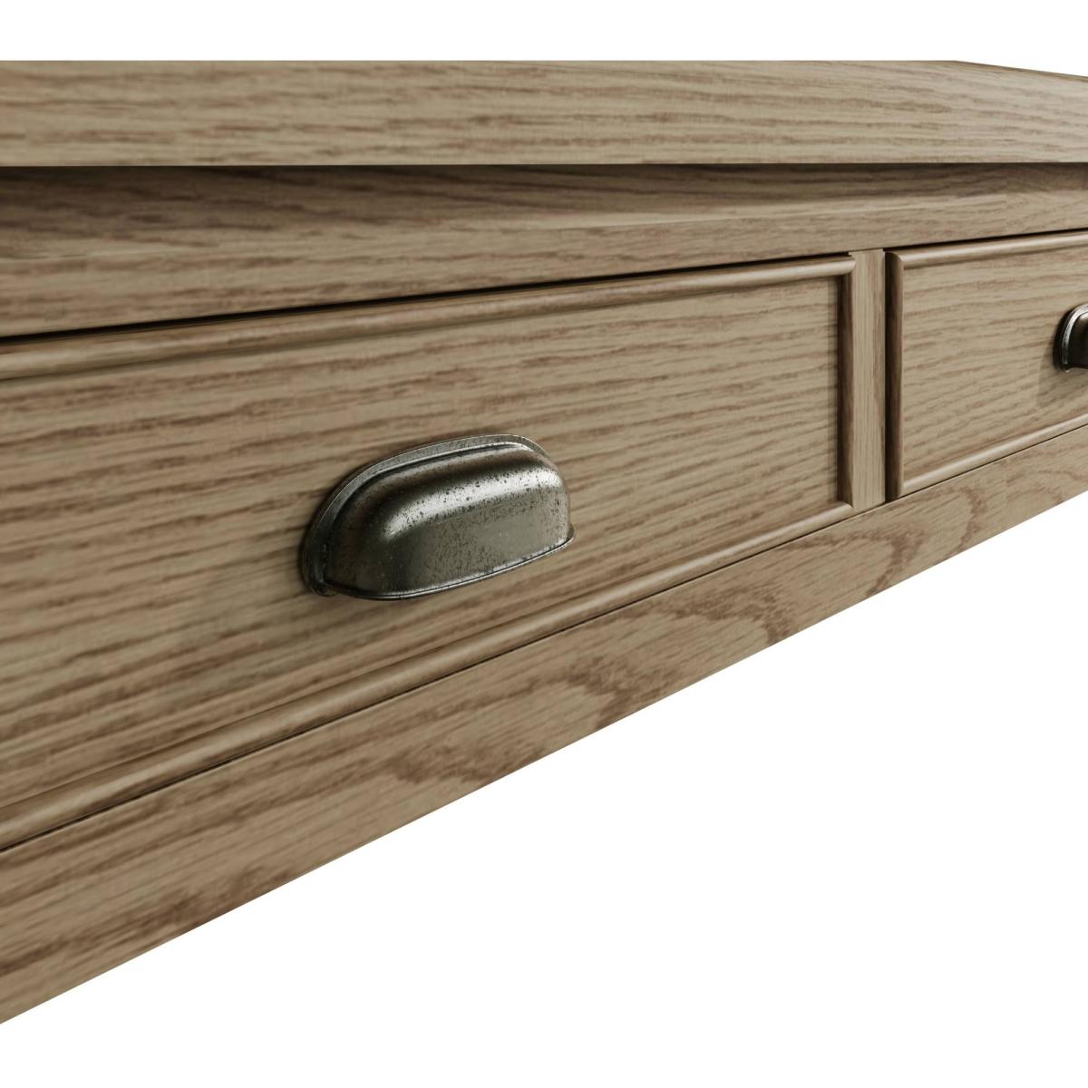 Create a stunning look for your dining room with the Hexham Dining Furniture collection. With chunky oak tops and smooth rounded corners combined with the eye-catching smoked oak solid frames, this furniture collection exudes class and style and will be sure to make a statement in any home. Smoked Oak Solid Wood Frame Antique Effect Cup Style Handles 4 Dovetailed Storage Drawers Chunky Oak Top with Rounded Corners Tapered Legs Assembly Required Dimensions - W 125cm x D 75cm x H 50cm All screens vary in colour reproduction and whilst every effort has been made to display the colour as accurately as possible it is for guidance only.