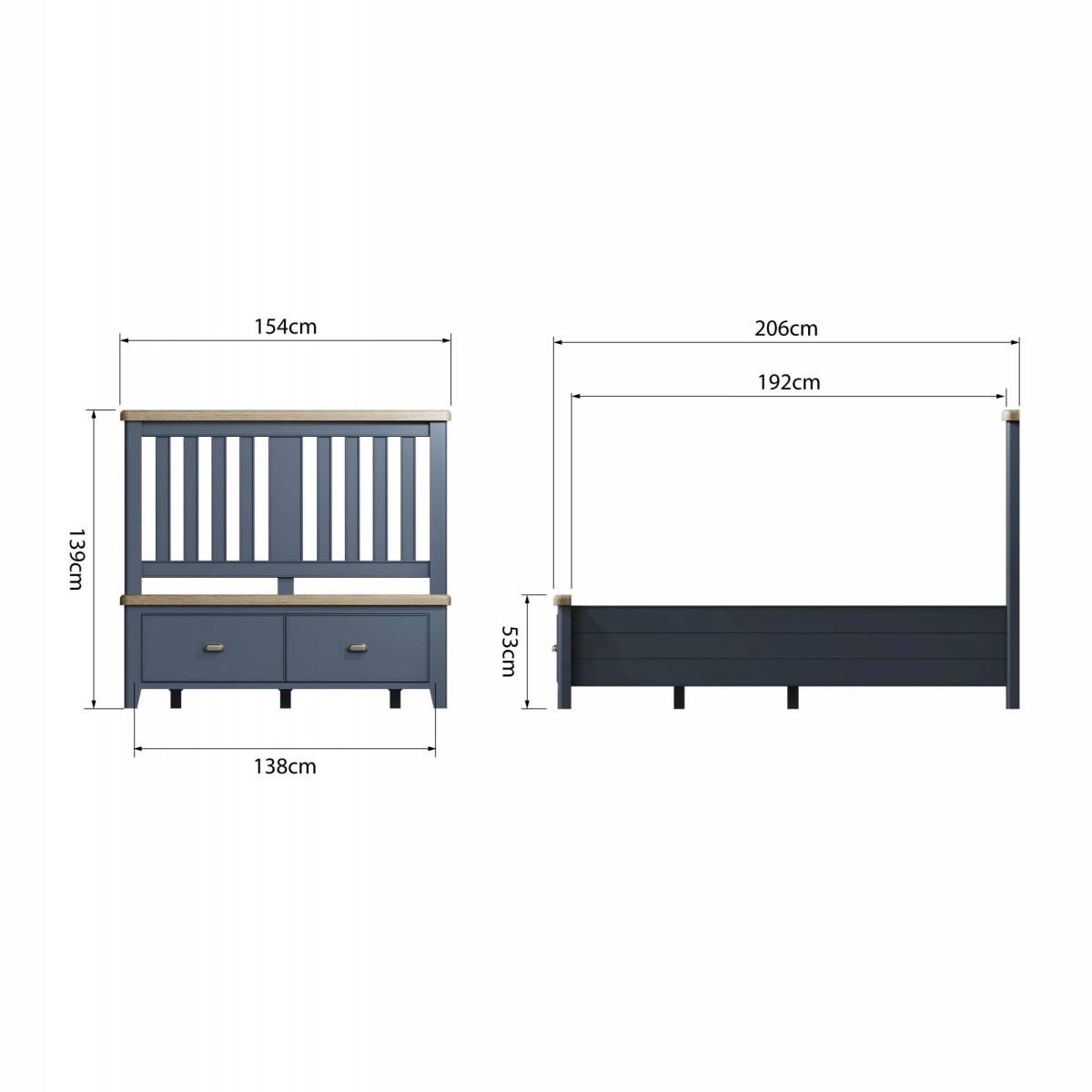 Create a stunning look for your bedroom with the Hexham Painted Blue Furniture collection. With chunky oak tops and smooth rounded corners combined with the eye-catching smoked oak solid frames painted Blue, this bedroom furniture collection exudes class and style and will be sure to make a statement in any home. Painted Blue and Smoked Oak Solid Wood Frame 2 Deep Storage Drawers on Metal Runners Sturdy Solid Wooden Slats Webbed Slats for Spacing Tapered Legs Assembly Required Dimensions (Double) - W: 154cm x D: 206cm x H: 139cm Dimensions (King) - W: 170cm x D: 206cm x H: 139cm Dimensions (Super King) - W: 200cm x D: 206cm x H: 139cm All screens vary in colour reproduction and whilst every effort has been made to display the colour as accurately as possible it is for guidance only.