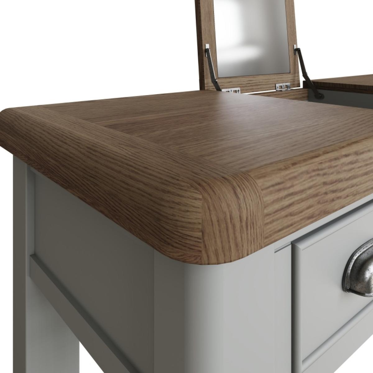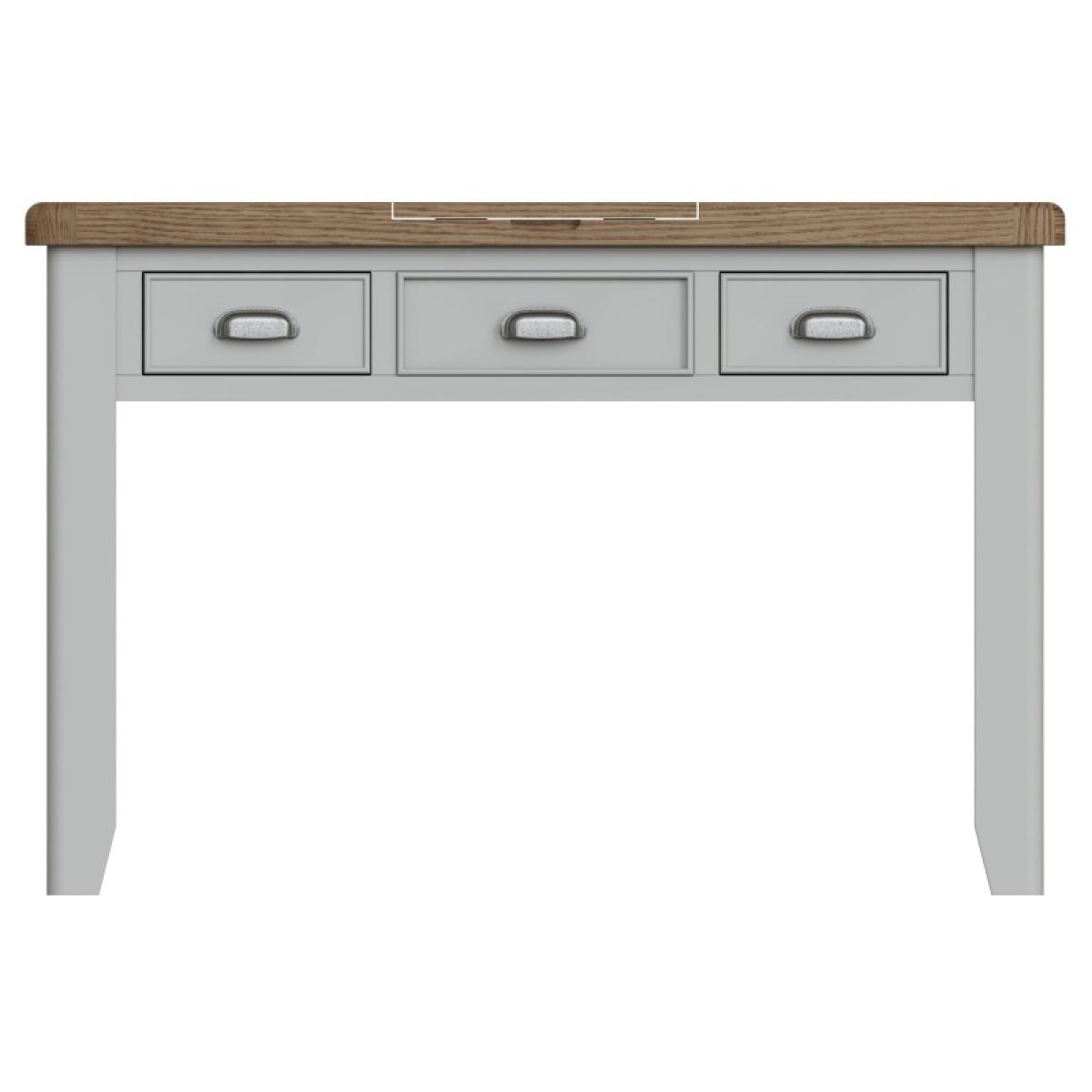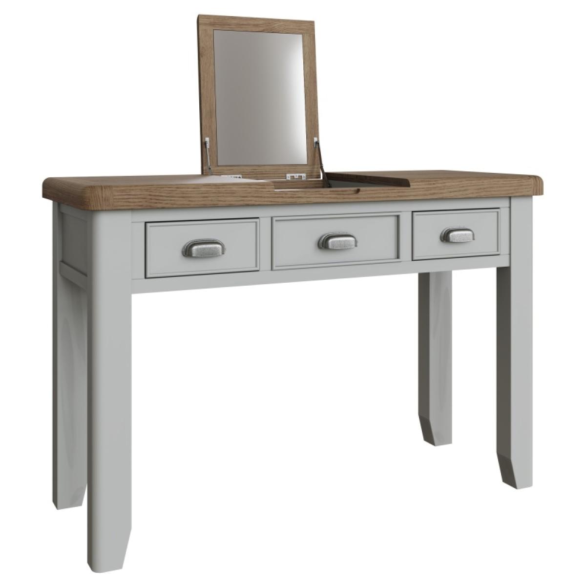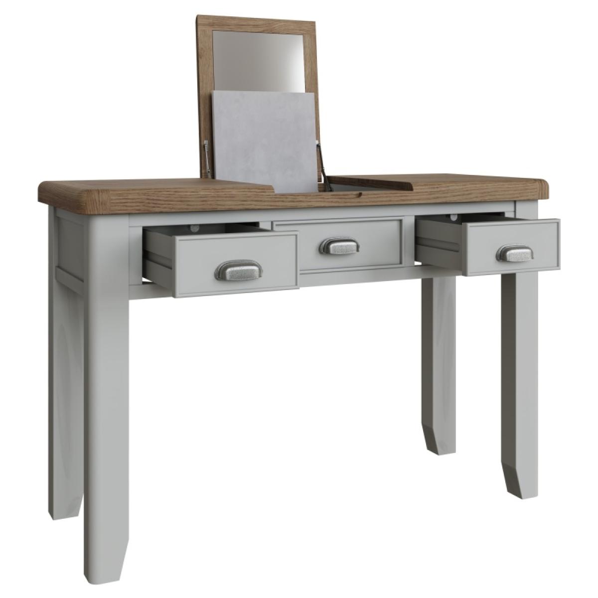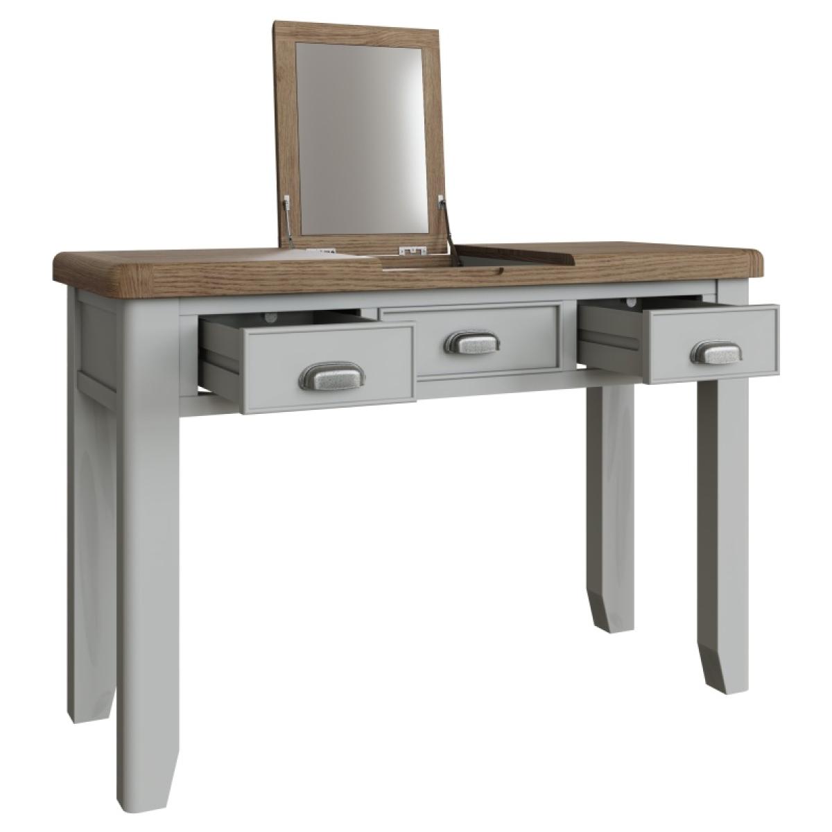 With beautiful modern Grey painted finish and rounded corners, this dressing table brings a sumptuous and elegant traditional style that is set to complement any interior. Impressive quality runs through every detail, from the thick oak tops and solid proportions. Features a built in felt jewellery box and flip up mirror. FEATURES:. *Arrives fully assembled *Solid Wood Frame *Built-in Felt Jewellery Box *Flip Up Mirror *Tapered Legs *Brushed Chrome Drawer Handles DIMENSIONS:. *Height: 80cm *Width: 120cm *Depth: 45cm All screens vary in colour reproduction and whilst every effort has been made to display the colour as accurately as possible it is for guidance only..