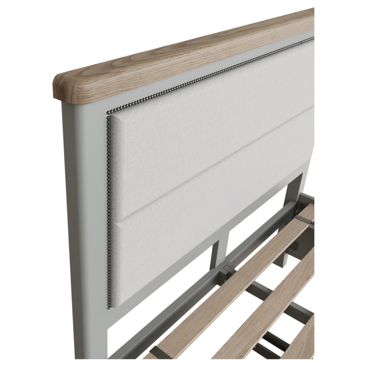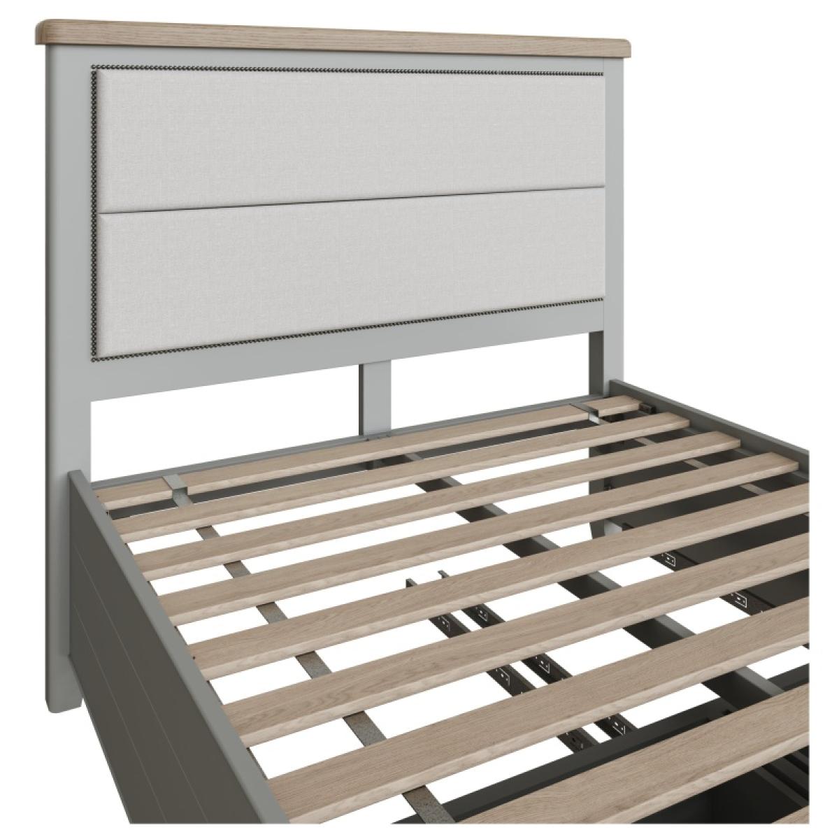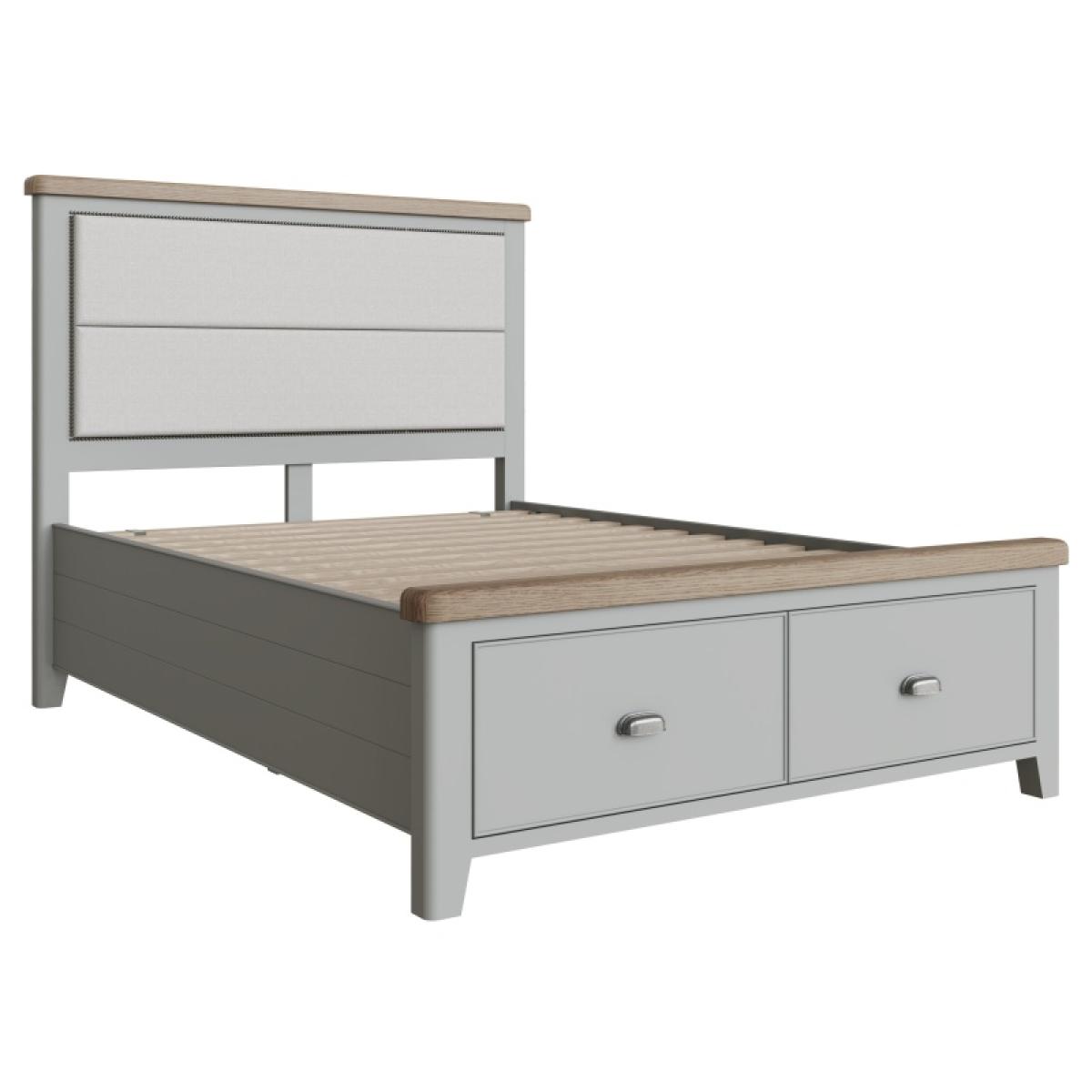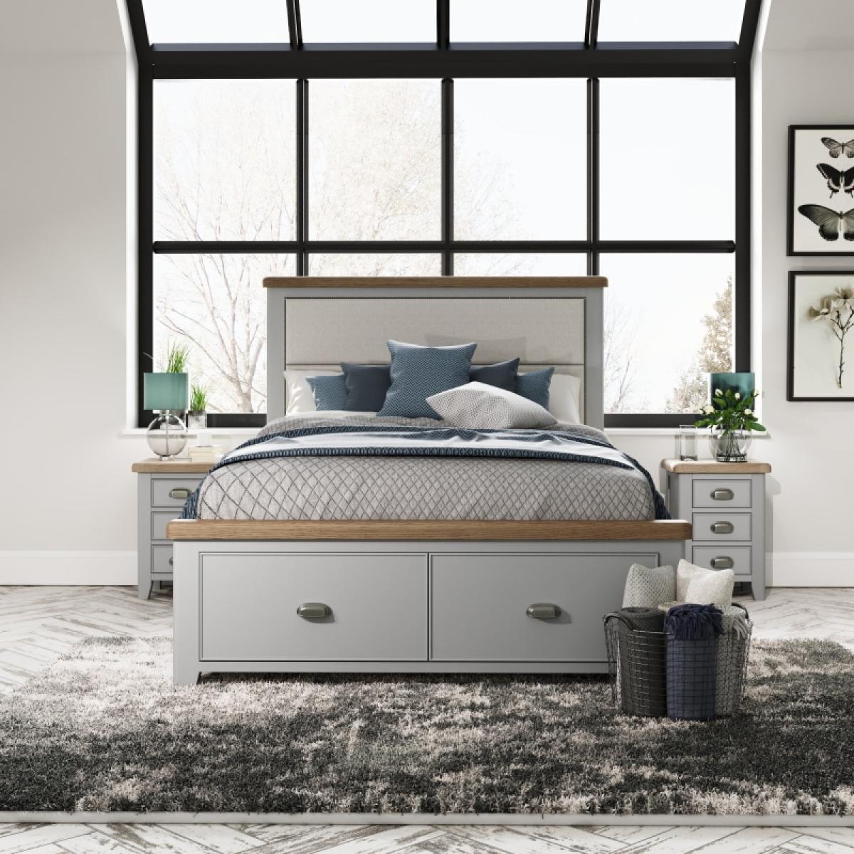 With beautiful modern Grey painted finish and rounded corners, this bed frame brings a sumptuous and elegant traditional style that is set to complement any interior. Impressive quality runs through every detail, from the thick oak tops and solid proportions. Features an upholstered headboard with 2 deep storage drawers on metal runners and webbed slats for spacing.. Please note, this item arrives flat-packed, assembly is required.. FEATURES:. *Solid Wood Frame *Tapered Legs *2 Deep Storage Drawers *Upholstered Headboard DIMENSIONS:. *Double - H 139cm x W 154cm x D 206cm *King - H 139cm x W 170cm x D 206cm *Super King -H 139cm x W 200cm x D 206cm All screens vary in colour reproduction and whilst every effort has been made to display the colour as accurately as possible it is for guidance only..