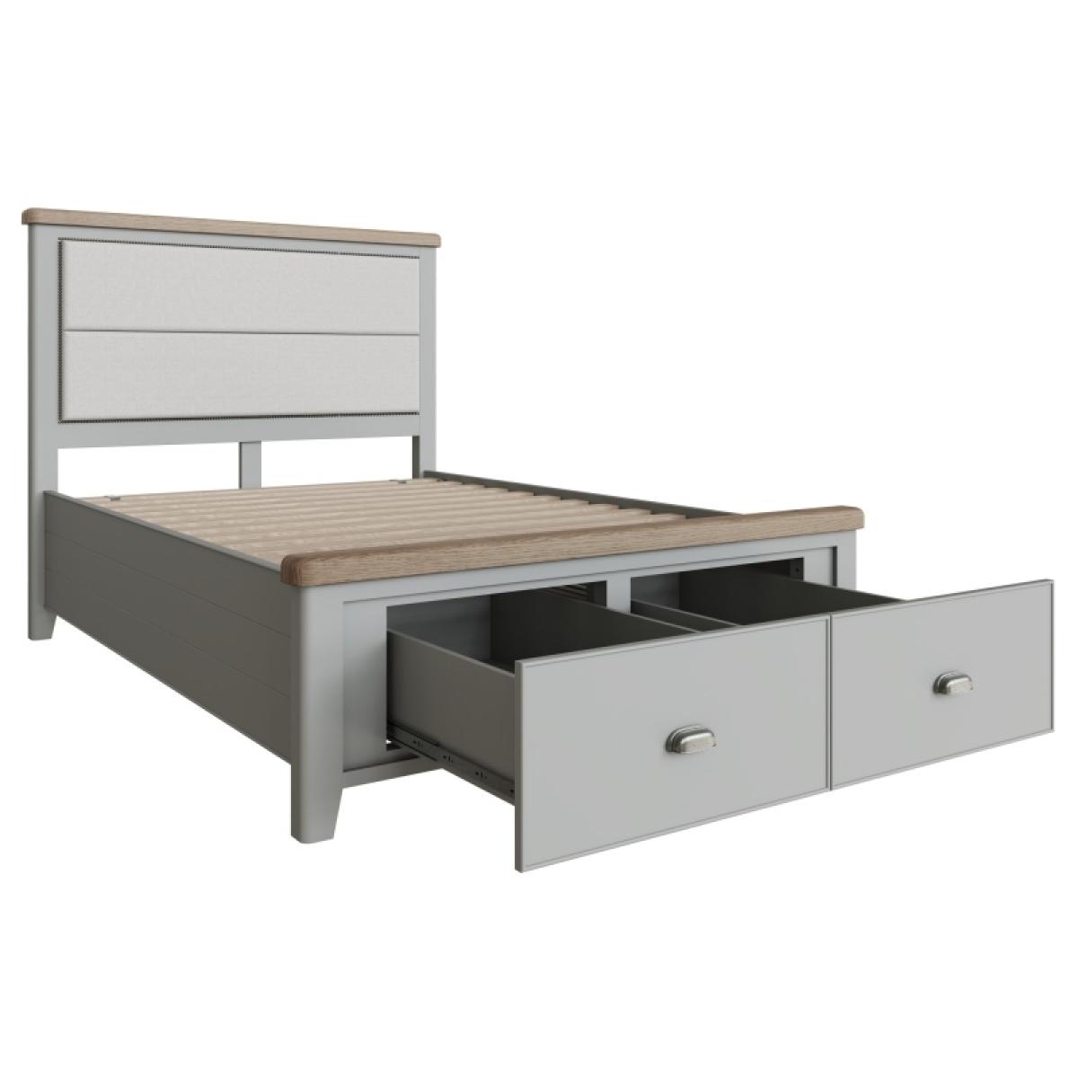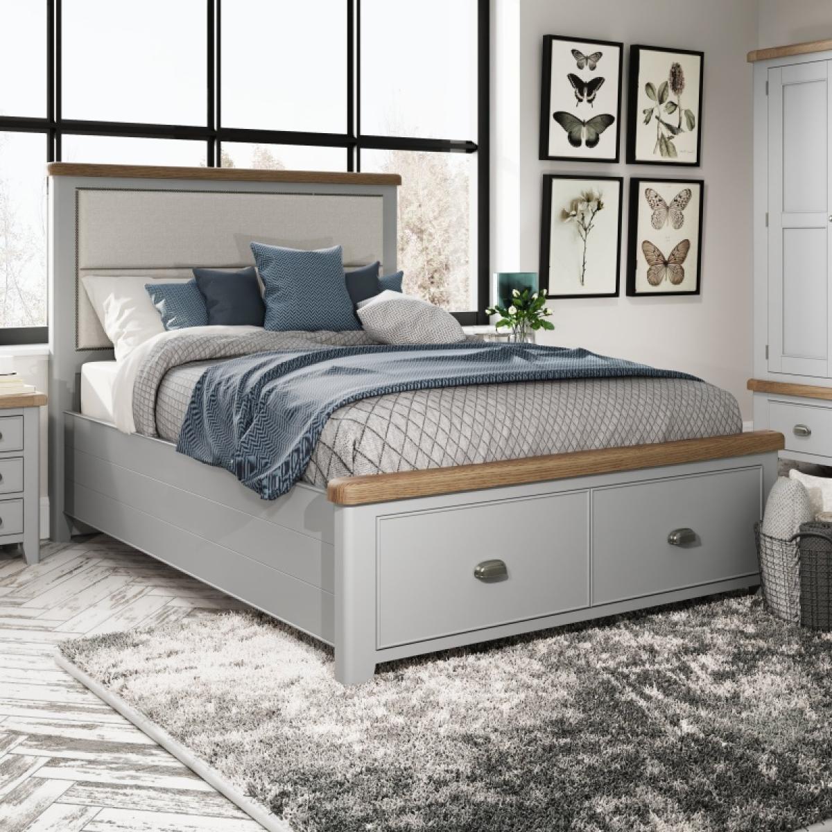 With beautiful modern Grey painted finish and rounded corners, this bed frame brings a sumptuous and elegant traditional style that is set to complement any interior. Impressive quality runs through every detail, from the thick oak tops and solid proportions. Features an upholstered headboard with 2 deep storage drawers on metal runners and webbed slats for spacing.. Please note, this item arrives flat-packed, assembly is required.. FEATURES:. *Solid Wood Frame *Tapered Legs *2 Deep Storage Drawers *Upholstered Headboard DIMENSIONS:. *Double - H 139cm x W 154cm x D 206cm *King - H 139cm x W 170cm x D 206cm *Super King -H 139cm x W 200cm x D 206cm All screens vary in colour reproduction and whilst every effort has been made to display the colour as accurately as possible it is for guidance only..