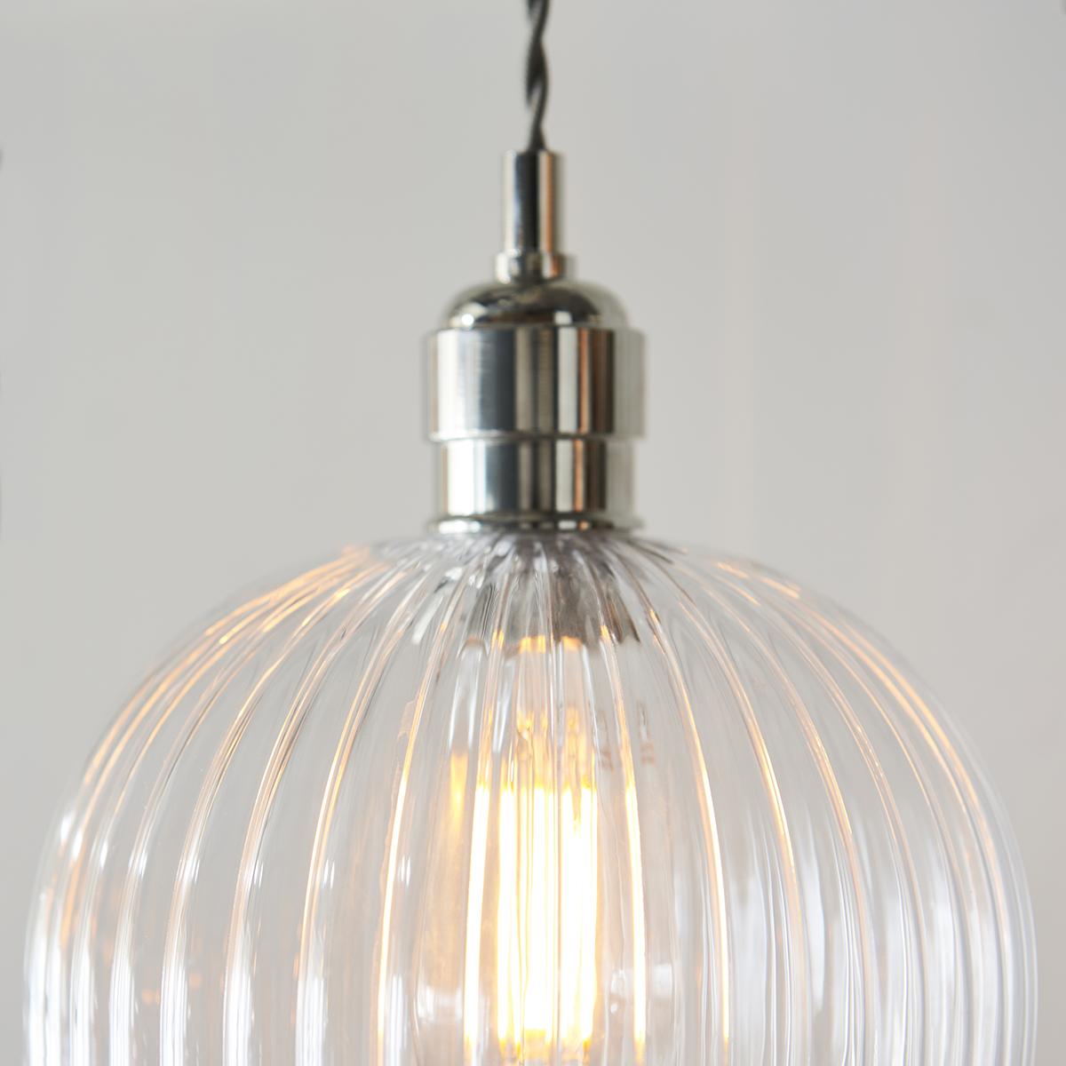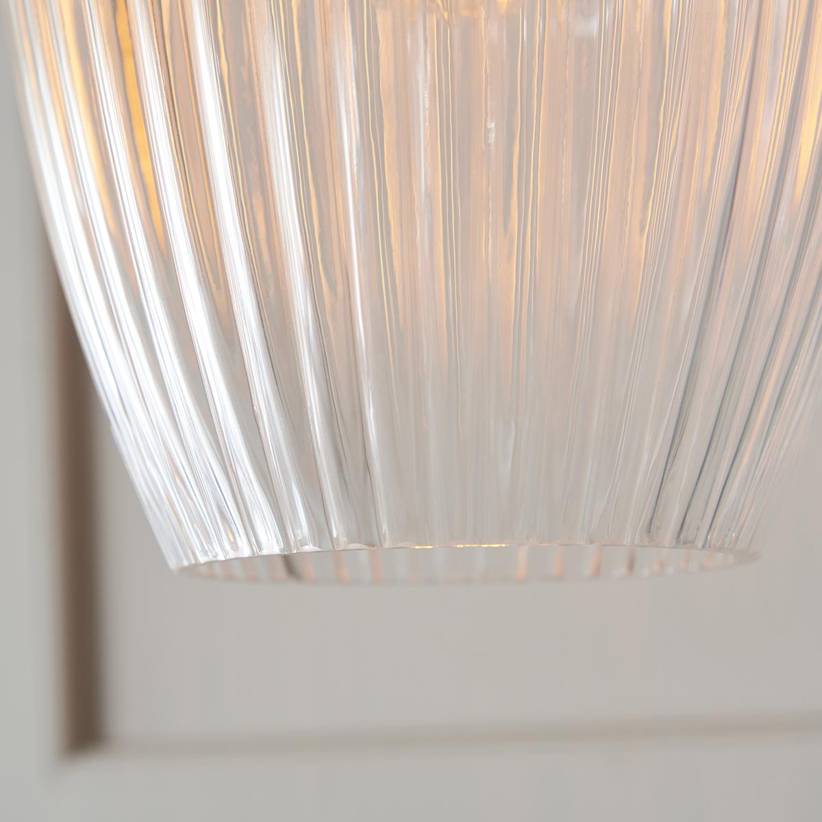 I love this pendant’s clean, modern aesthetic and the way the ribbed glass diffuses light softly, creating a welcoming ambience. It works particularly well in contemporary or minimalist interiors, but can also add a touch of sophistication to more eclectic spaces. When styling, consider pairing it with simple colour schemes to let the glass and nickel finish stand out, or hang multiple units for a striking visual impact in kitchens or dining areas. Practical tips include ensuring it’s hung at the right height above tables or islands for optimal lighting and visual balance, and pairing with bare or vintage-style bulbs for an effortlessly chic look. It’s a versatile choice that elevates any ceiling space with its understated elegance.