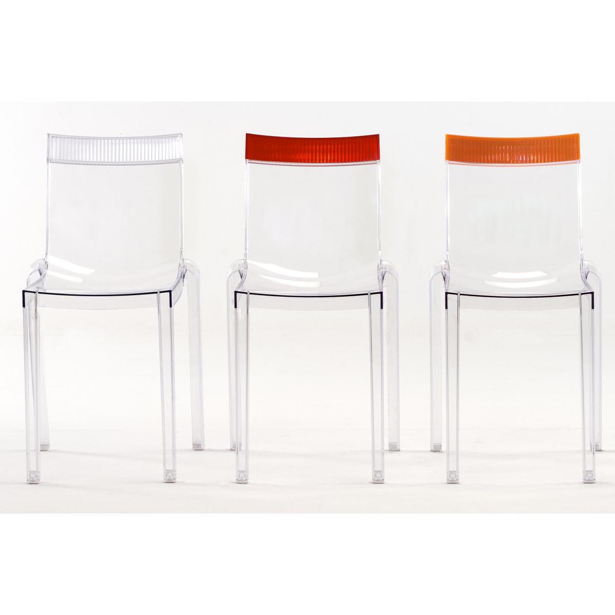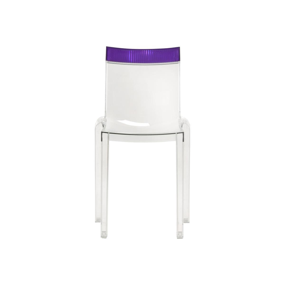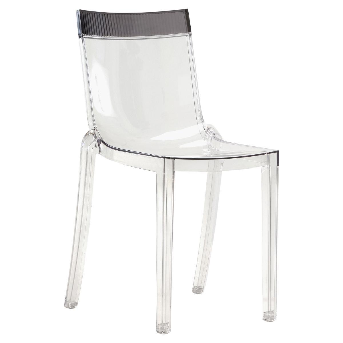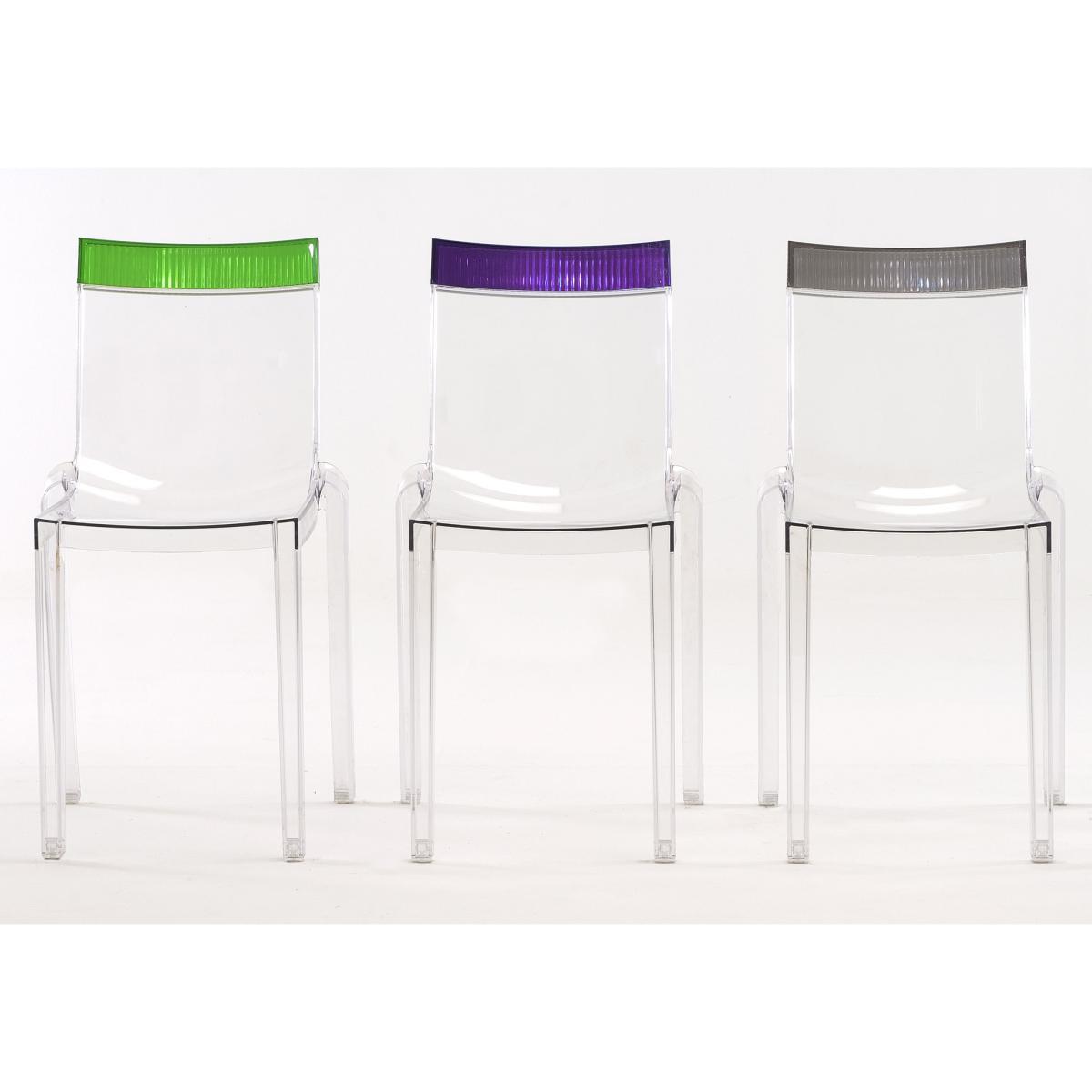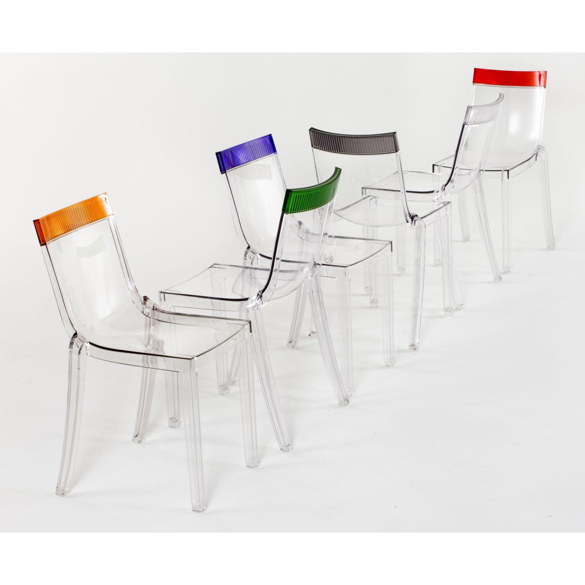 Kartell presents the latest development in transparency: Hi Cut, the new polycarbonate chair designed by Philippe Starck, which offers a perfectly ergonomic seat combining elasticity and solidity. The iridescent vertical lines in the structure of the top that customises the chair creates seductive plays of light and glints. The veritable rainbow of colours of the top and the possible combinations - 15 in all - give the chair an art deco air and make it extremely eclectic and precious, adding a touch of personality and originality to its surroundings. Hi Cut is available in three different versions (transparent, black and white) to be teamed with a range of fluorescent shades (purple, red, green and orange) plus the more classic transparent and smoke grey tones. The design of the structure of the chair, moulded in a single piece, is based on contrasting curves and angles: the front legs and front part of the seat are squared, while the rear legs and back have a softer, rounded form, which reverts to the angular design in the upper backrest.