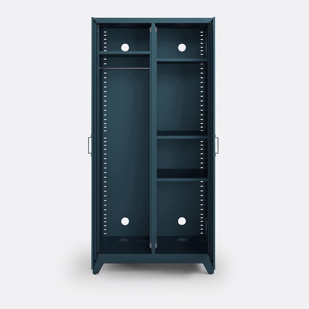 Bring industrial charm to your space with the Hiba 2-Door Metal Cabinet, perfect for organizing in hallways or bedrooms. This versatile unit includes a hanging rail, adjustable shelves, and a sturdy epoxy-finish steel frame. Its factory locker room style incorporates the look of the industrial trend, to bring a vintage touch to your decor. Storage: on the left is a shelf at the top and a hanging rail, on the right 3 shelves. Plus point: The shelves are adjustable in height, for personalised and optimal storage!Product Details • 2 doors • On left-hand side: 1 hanging rail and 1 adjustable removable shelf • On the right : 2 removable and adjustable shelves and one fixed shelf in the middle • Epoxy-finish steel metal structure, base and handles • Magnetic closure of the doors • Adjustable legs: 4 plastic pads adjustable in height. Dimensions • Width: 85cm • Height: 180cm • Depth: 50cm • Hanging space : L41 x H128 x D48cmDelivery:. This product is sold for self-assembly. It will be delivered to your door. ! Note! Please check that access points (doorways, stairways, lifts) are wide enough to accommodate your delivery. Dimensions and weight of parcel:2 parcels • L106 x H19 x D58cm. 15.5kg • L175 x H24 x D56cm. 40kg