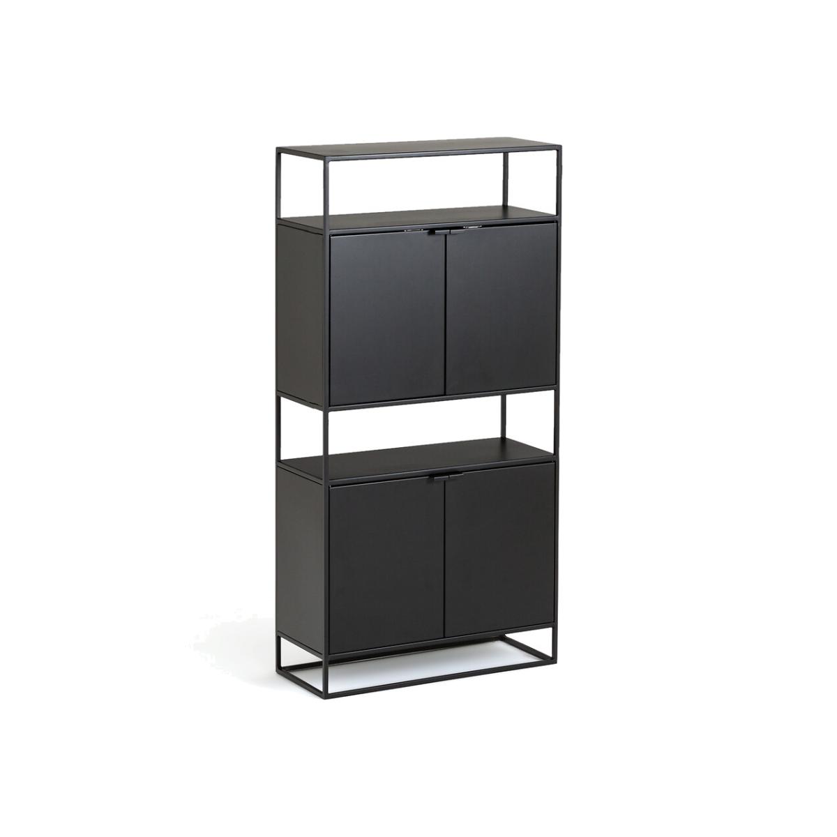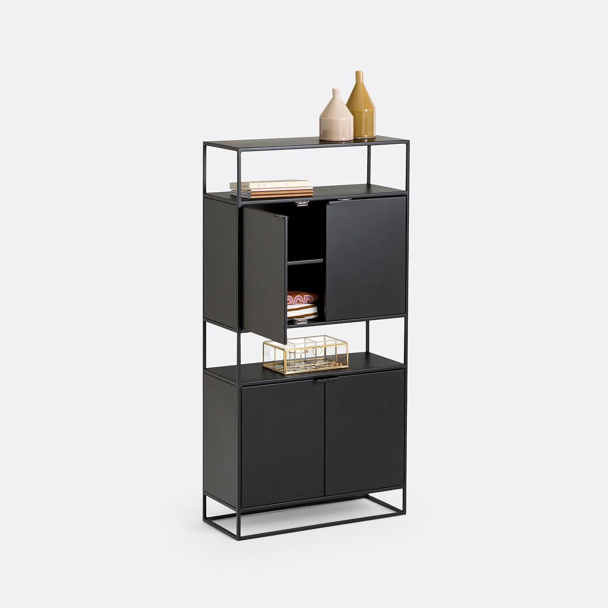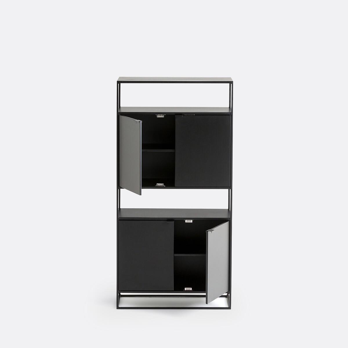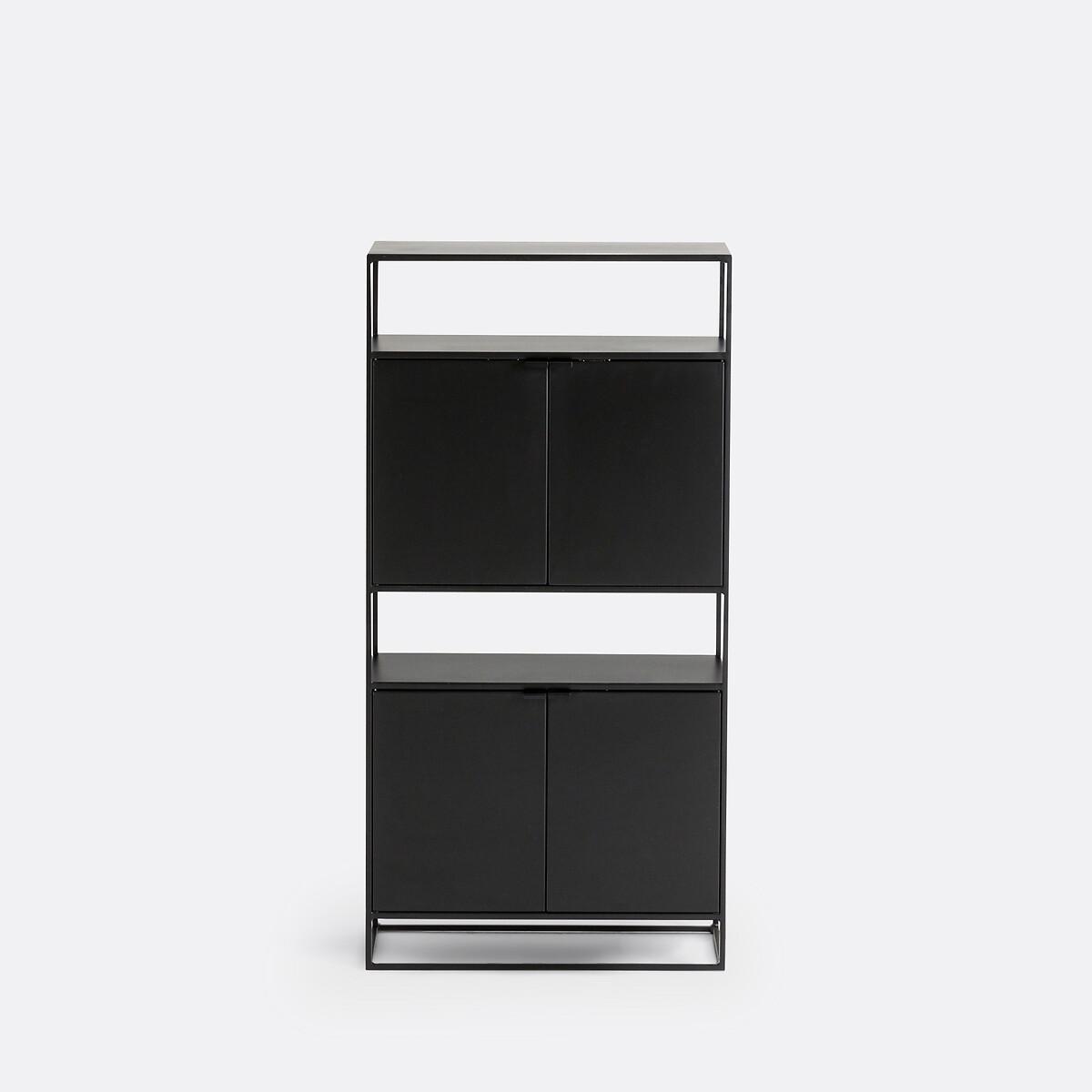Optimise your entrance with the Hiba industrial-style cabinet. This piece of furniture will be perfect in an entrance to store bags and accessories.. Its shallow depth saves space in small spaces. Designed by La Redoute Interiors. Product Details • 4-door wardrobe with 1 shelf in each height-adjustable box + 2 open storage spaces + 1 shelf with the upper shelf • Structure in square shaped steel metal tube, thickness 1cm, black tinted epoxy finish, matte effect • Magnetic closure of the doorsDimensions. Overall • Width: 60cm • Height: 120cm • Depth: 25cm. Usable space • Height of 2 open compartments: 15cm • Base height: 8cm • Dimensions of the 4 internal storage spaces: L58 x D24 x H18cm (adjustable shelves on 3 height levels) • Weight: 27kgDelivery:. Sold pre-assembled. Dimensions and weight of parcel1 parcel • L126 x H65.5 x D31cm. 31.26kg