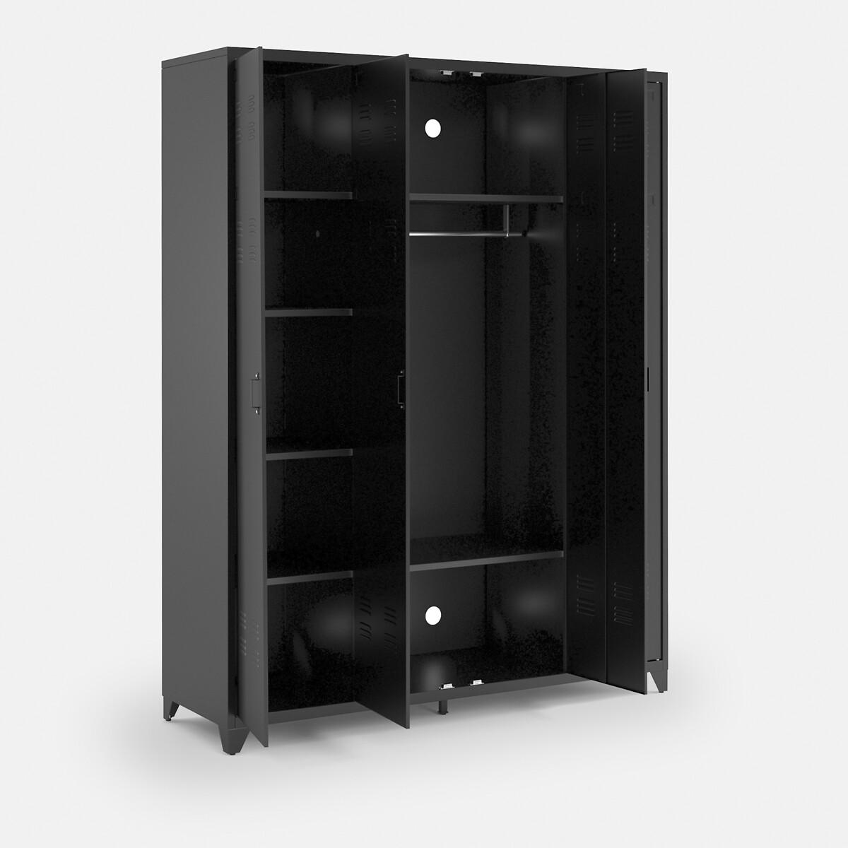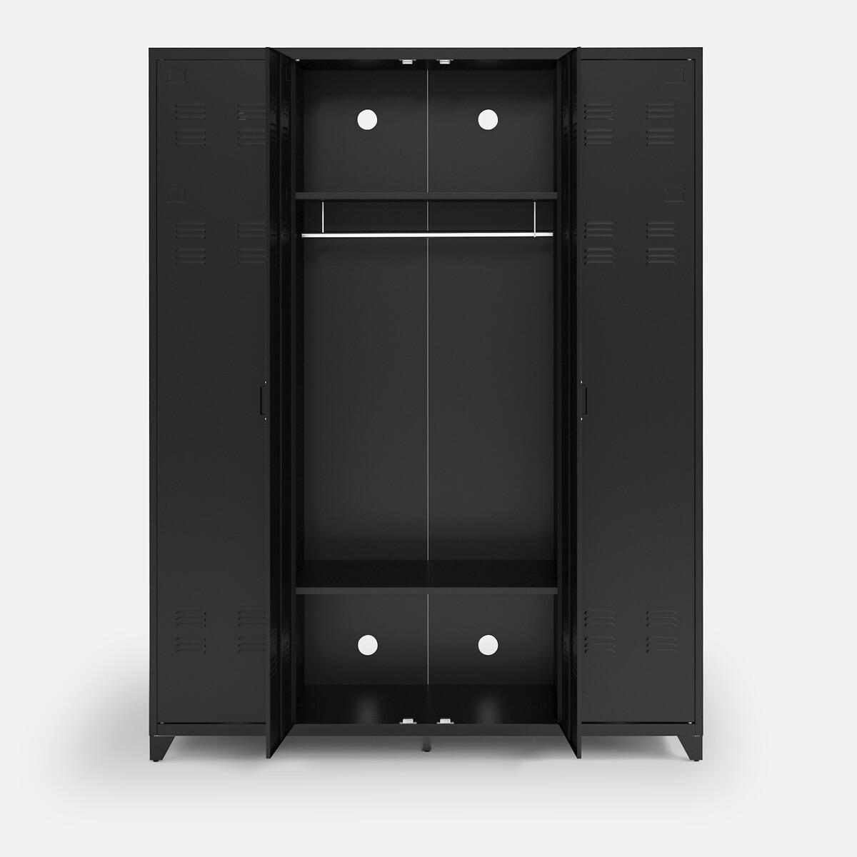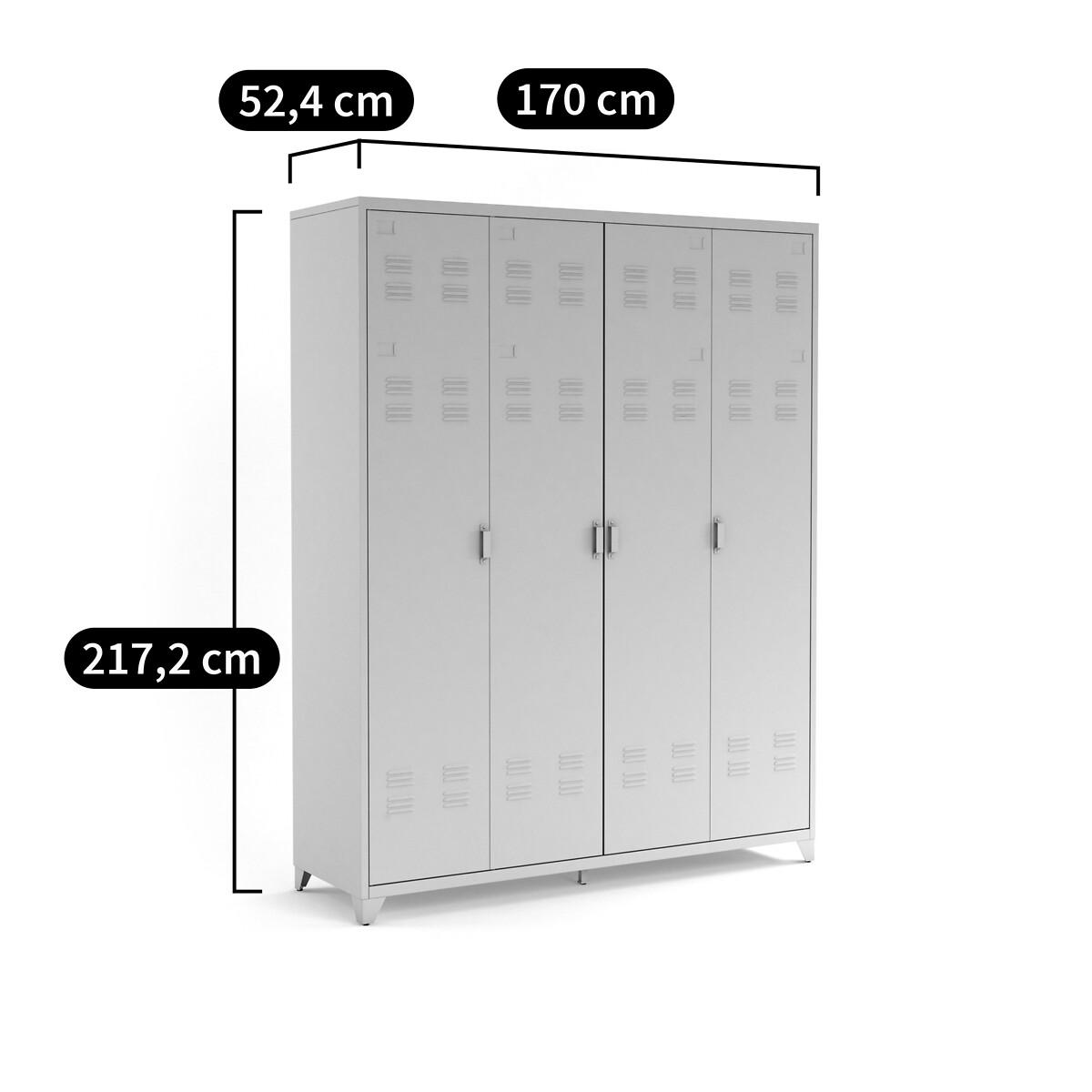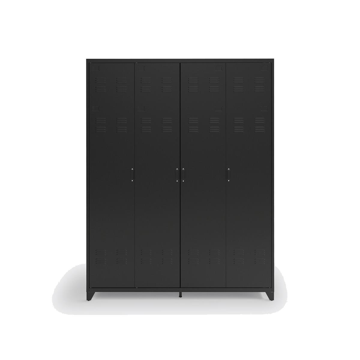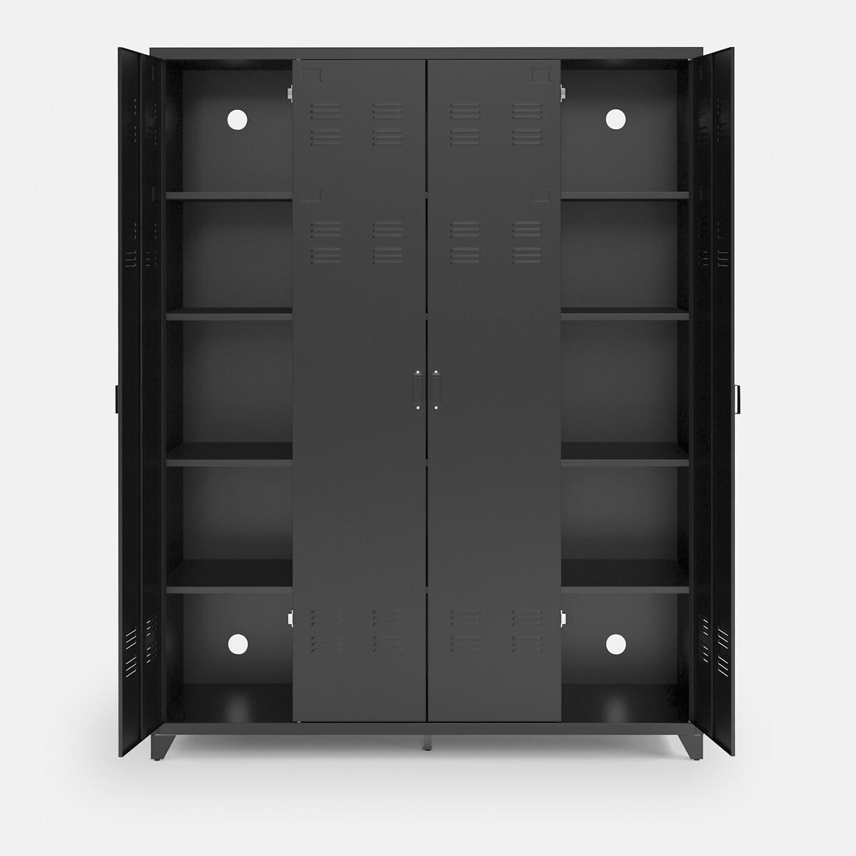 With its industrial design, the Hiba 4-door metal cabinet brings a vintage touch to your decoration. Perfect in a bedroom or hallway!Product Details • Made from steel with an epoxy finish • 4 doors : 2 central doors with hanging rail and 2 fixed shelves + 2 side doors each with 5 fixed shelves • 6 ajustable feet • Holes at the back for wall mounting (recommended)Dimensions. Overall • Width: 170cm • Depth: 52.4cm • Height: 217.2cm. Usable dimensions • Dimensions of the central wardrobe: L80 x H120.5cm • Central compartment : L80 x H38.8cm • Side compartments: L35 x H38.8cm • Weight: 103kgDelivery:. This product is sold ready to assemble..Note! Please check that all access points are large enough to accommodate your delivery (doors, stairs, lifts).Dimensions and weight of parcel3 parcels • L215.5 x H14 x D60cm. 39.5kg • L213 x H14.5 x D56cm. 37kg • L186 x H19 x D60cm. 32.6kg