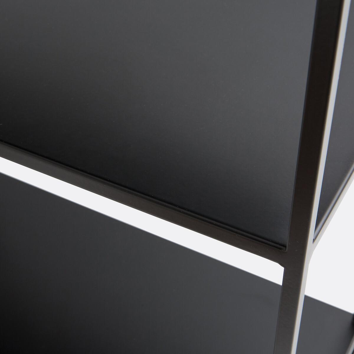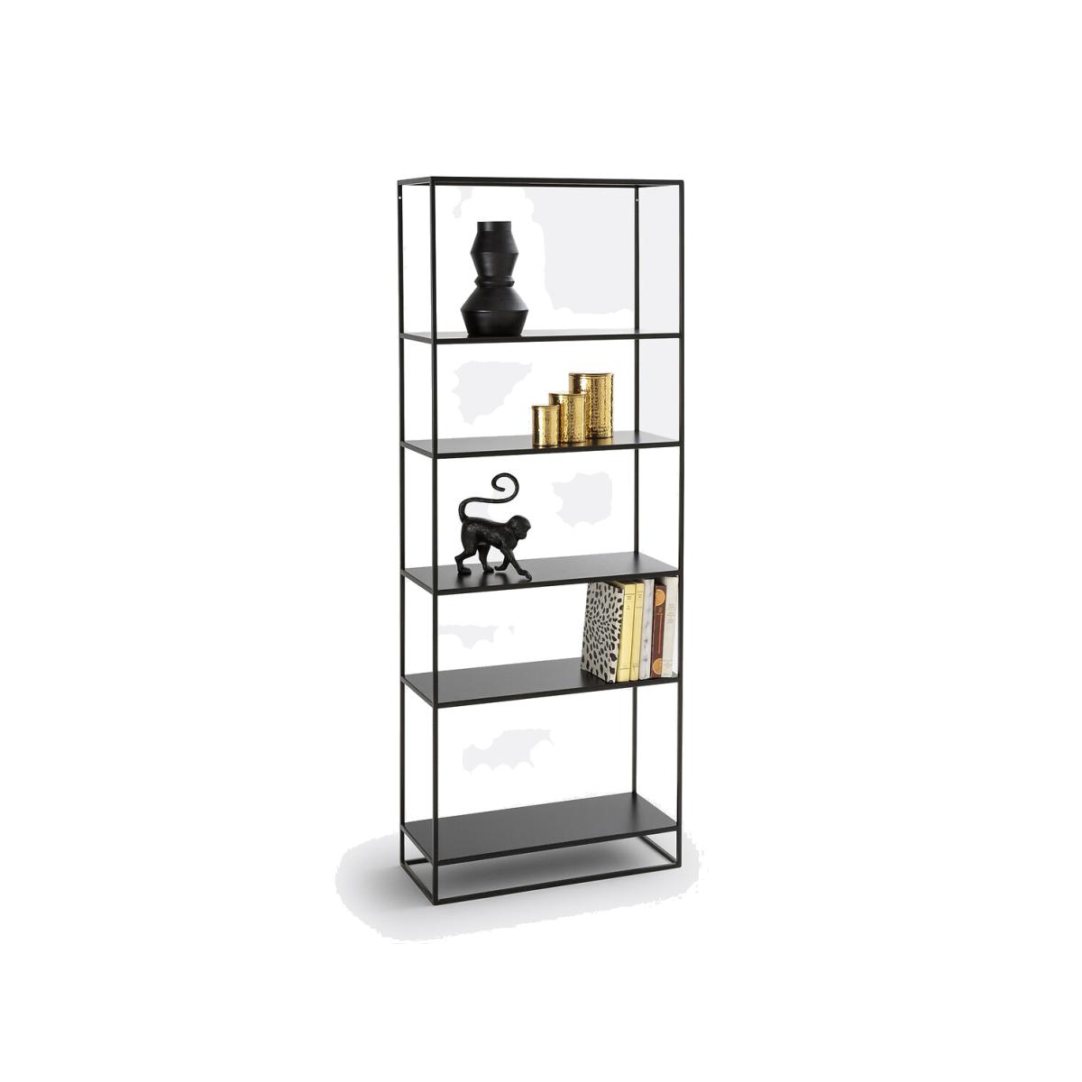 A shallow depth and a subtle and discreet design, the Hiba bookcase offers plenty of storage space. Product Details • 6 shelves (useful height between shelves: 2 x 34cm, 2 x 25cm, 1 x 30cm) • Matt black lacquered steel with epoxy coating • To be fixed to the wall (2 fixing points on the top of the shelf)Dimensions. Total: • Width: 60cm • Height: 160cm • Depth: 25cmDelivery:. Sold pre-assembled. Note! Please check that all access points are large enough to accommodate your delivery (doors, stairs, lifts).Parcel dimensions and weight:1 parcel • L172.5 x H25.8 x D69.5cm, 20.4kg