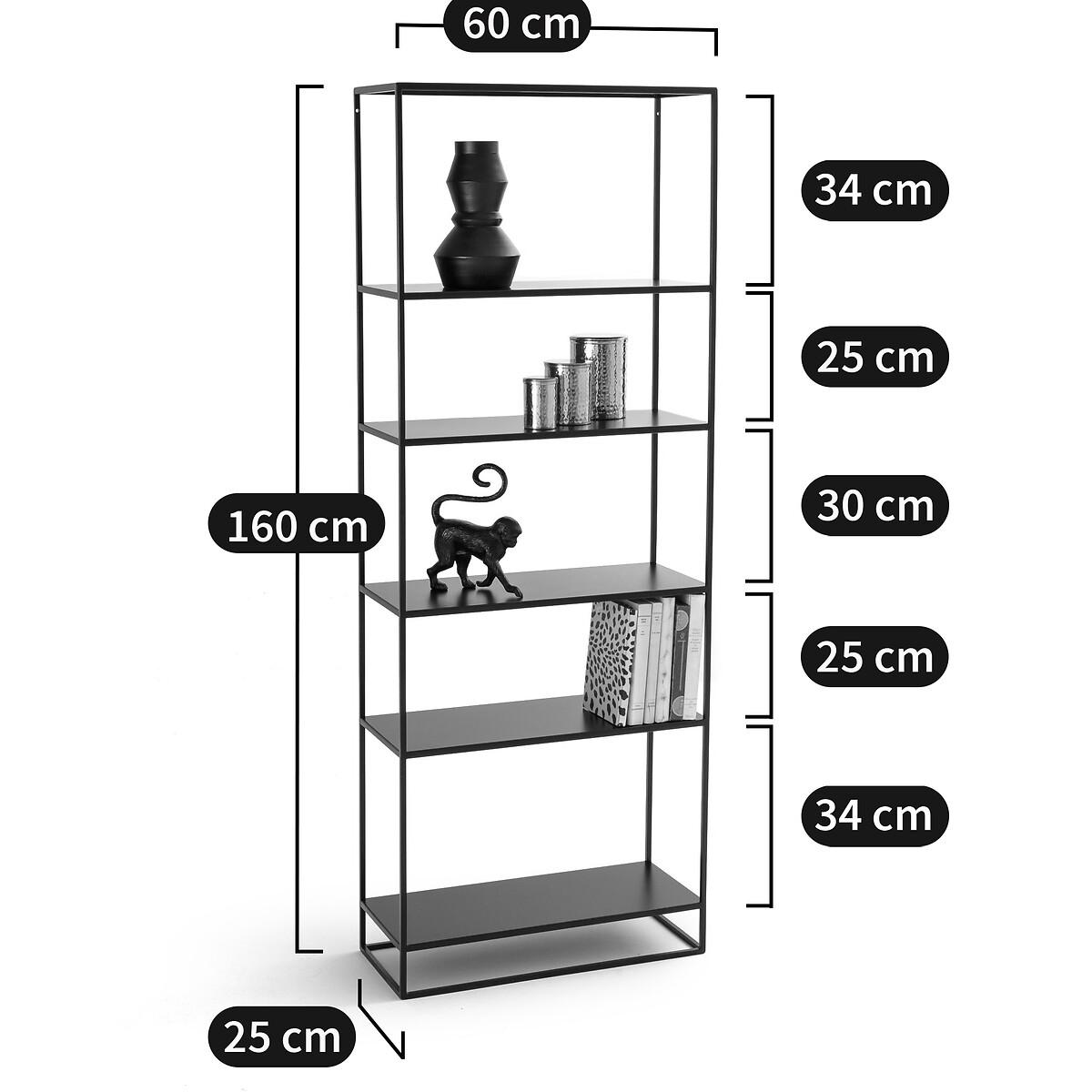 A shallow depth and a subtle and discreet design, the Hiba bookcase offers plenty of storage space. Product Details • 6 shelves (useful height between shelves: 2 x 34cm, 2 x 25cm, 1 x 30cm) • Matt black lacquered steel with epoxy coating • To be fixed to the wall (2 fixing points on the top of the shelf)Dimensions. Total: • Width: 60cm • Height: 160cm • Depth: 25cmDelivery:. Sold pre-assembled. Note! Please check that all access points are large enough to accommodate your delivery (doors, stairs, lifts).Parcel dimensions and weight:1 parcel • L172.5 x H25.8 x D69.5cm, 20.4kg
