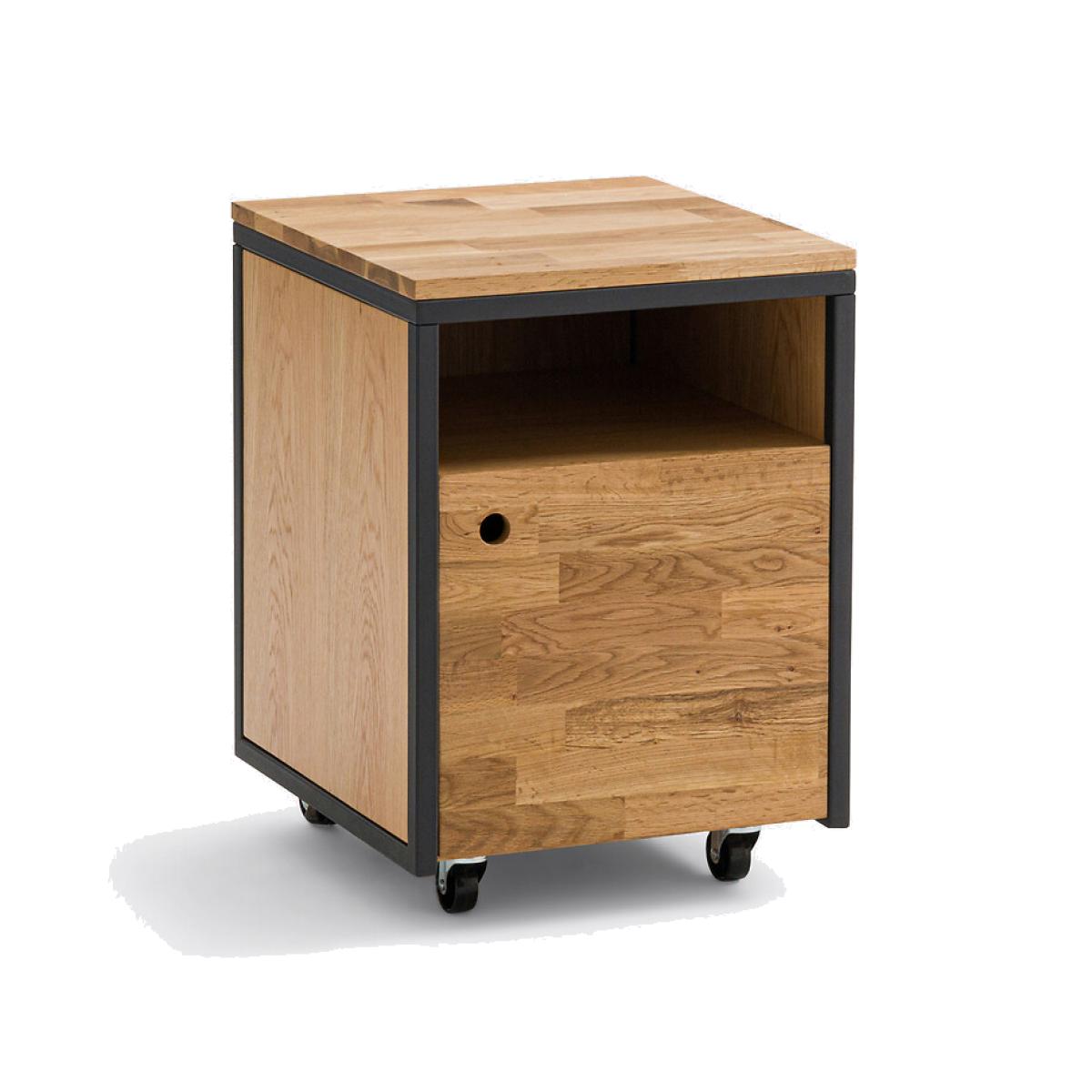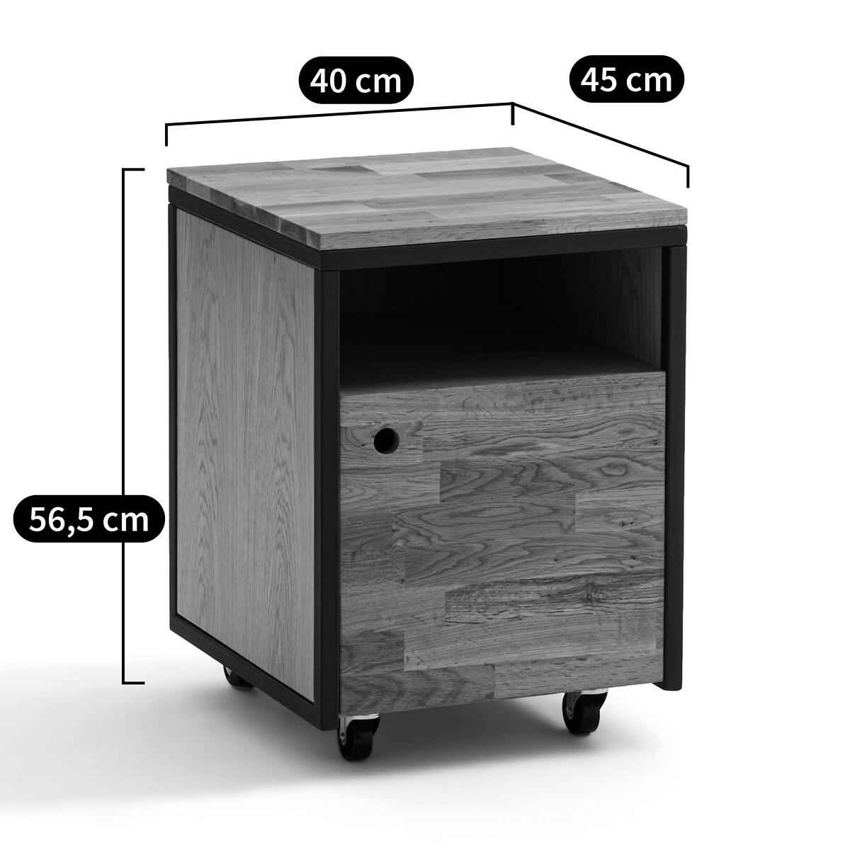 Embrace the industrial trend and fall for the Hiba desk unit on wheels, in oak and black metal. To be combined with desks with Hiba extension. Product Details • 1 compartment and 1 door • Mounted on 4 wheels • Tubular metal structure, black epoxy paint finish • Top and door in solid finger-jointed oak, nitrocellulose varnish finish • Back, sides, shelf in oak veneered PP, nitrocellulose varnish finishDimensions. Overall • Width: 40cm • Height: 56.5cm • Depth: 45cm • Weight: 16.5kg. Usable space • Compartment: L35.5 x H13 x D41cm • Compartment behind door:L33 x H29.5 x D41cmDelivery:. This product is sold ready to assemble..Note! Please check that all access points are large enough to accommodate your delivery (doors, stairs, lifts)Dimensions and weight of parcel1 parcel • L55 x H21 x D54cm. 18.2kg.