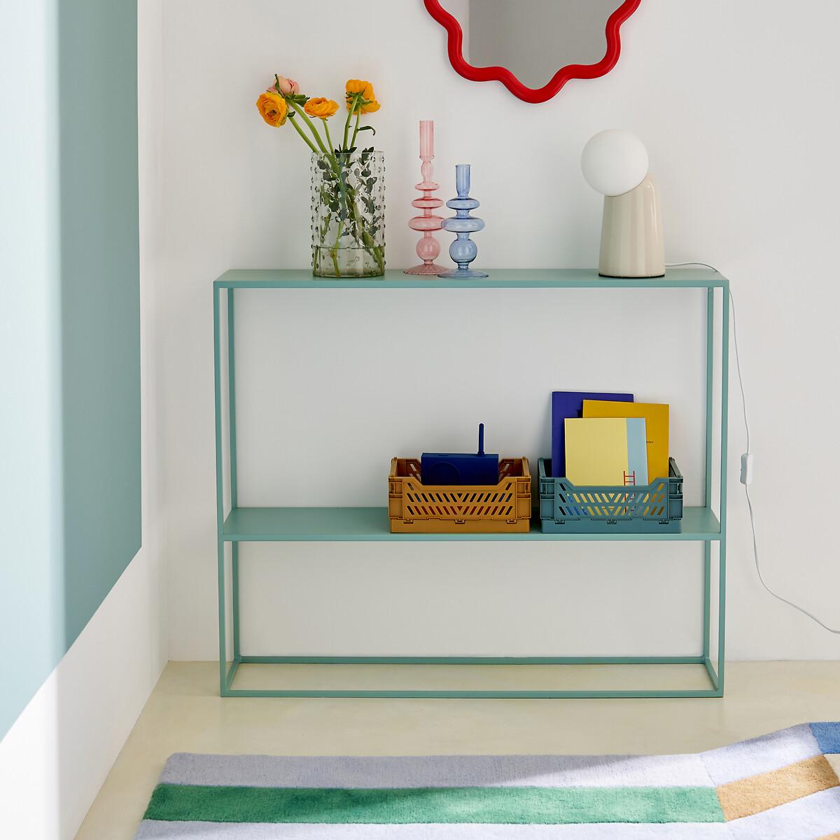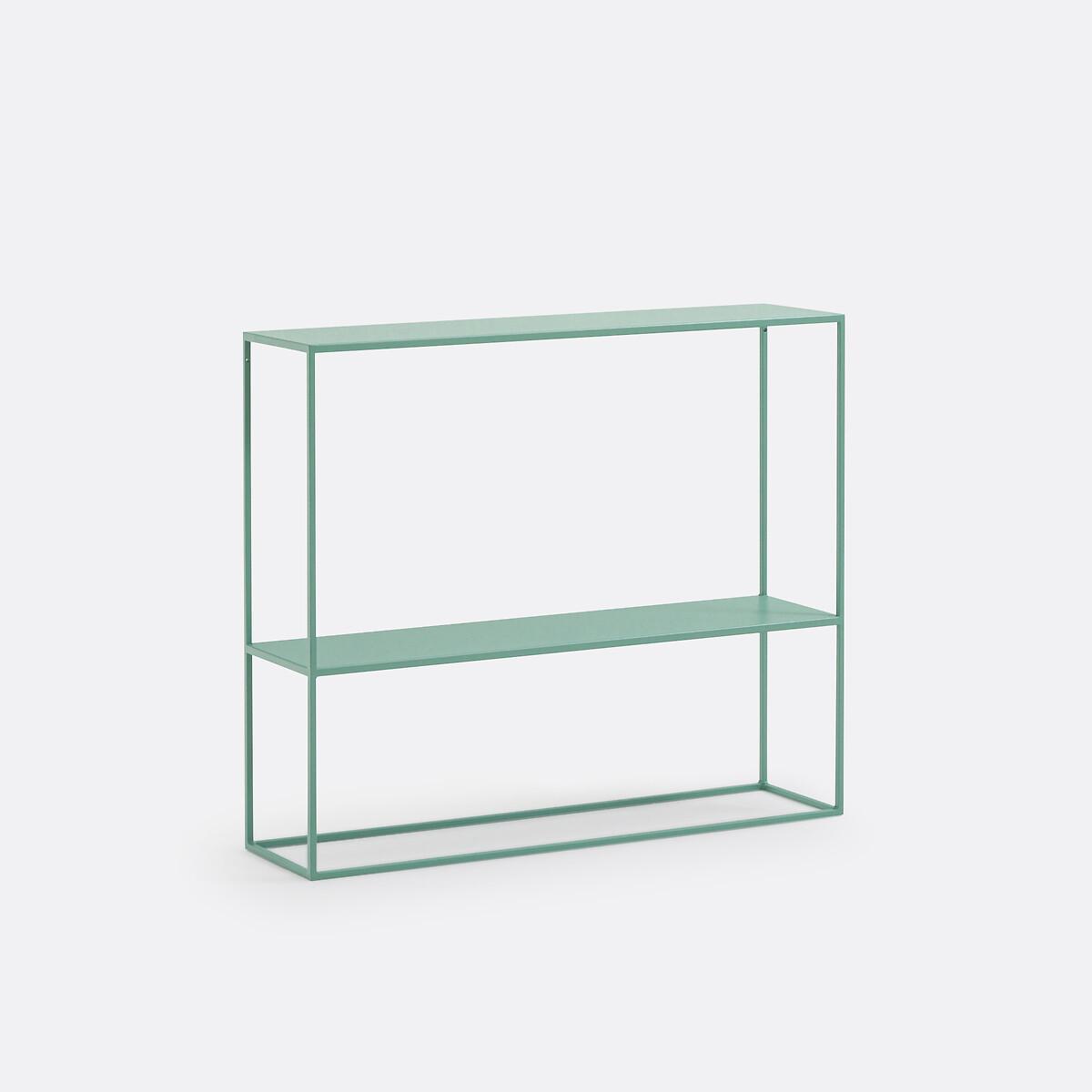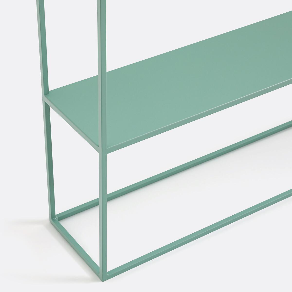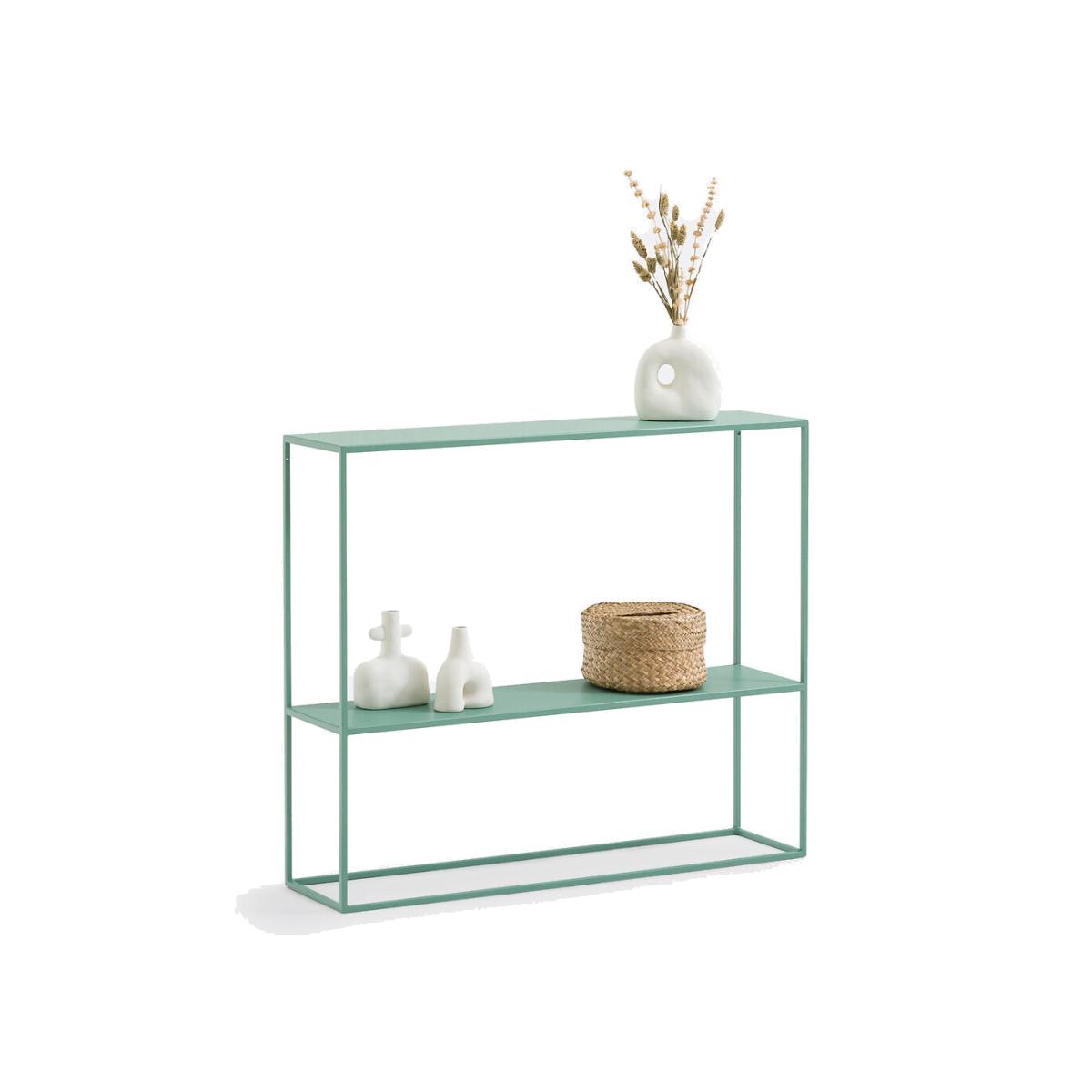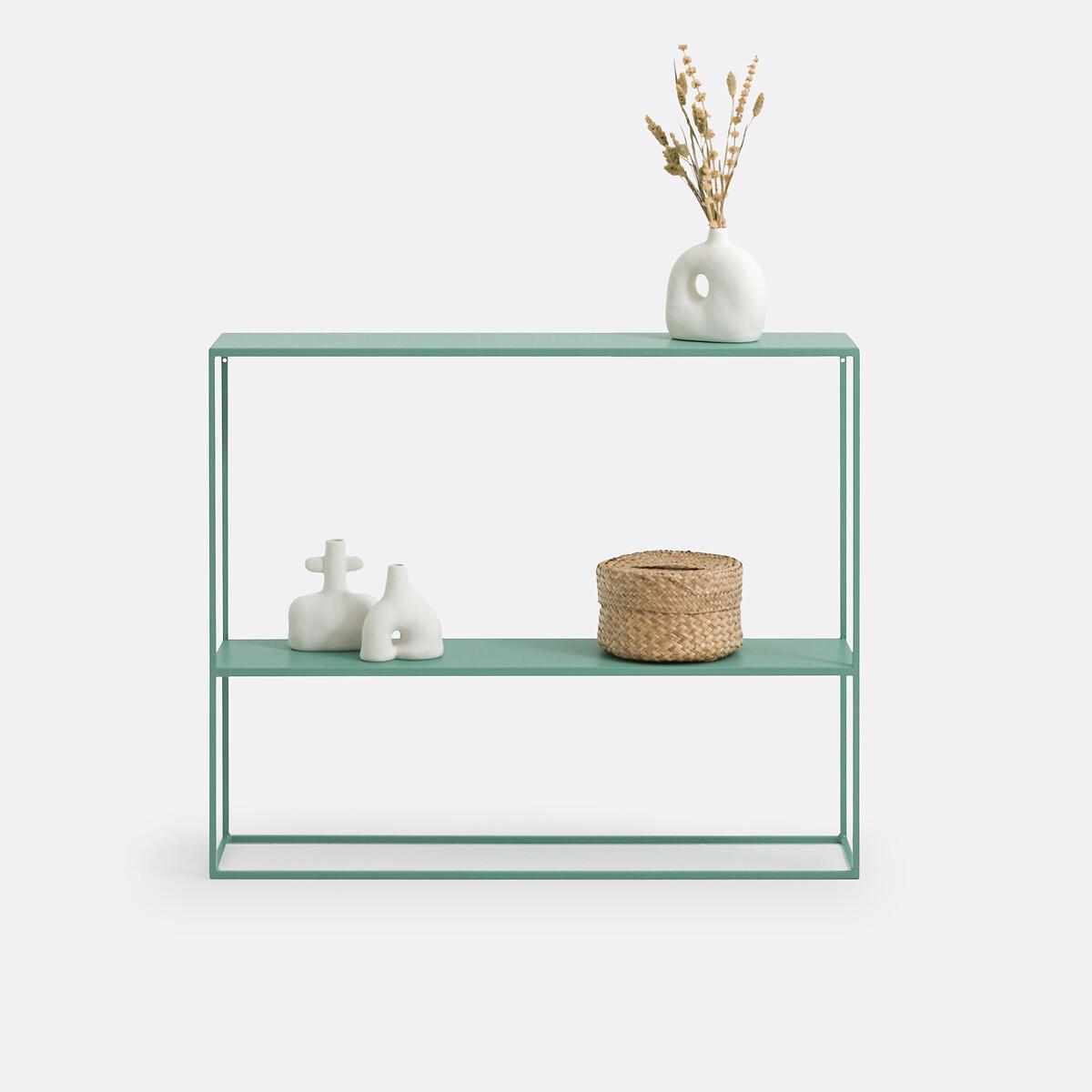 Sleek and modern. The Hiba range plays the all-metal card, available in colourful finishes. It will instantly charm you with its graphic, contemporary style. It’s up to you to invent your interior. Designed by La Redoute Interiors. The depth of this console is reduced, for a small footprint. Product Details • In matt celadon blue lacquered steel, epoxy finish • Shallow depth : 20cm • 2 tiersDimensions. Overall • Width: 90cm • Height: 75cm • Depth: 20cm. Usable space • Height between levels: 45cmDelivery:. Sold pre-assembled. Note! Please check that all access points are large enough to accommodate your delivery (doors, stairs, lifts).Dimensions and weight of parcel1 parcel • L98 x H81 x D24cm. 10.5kg