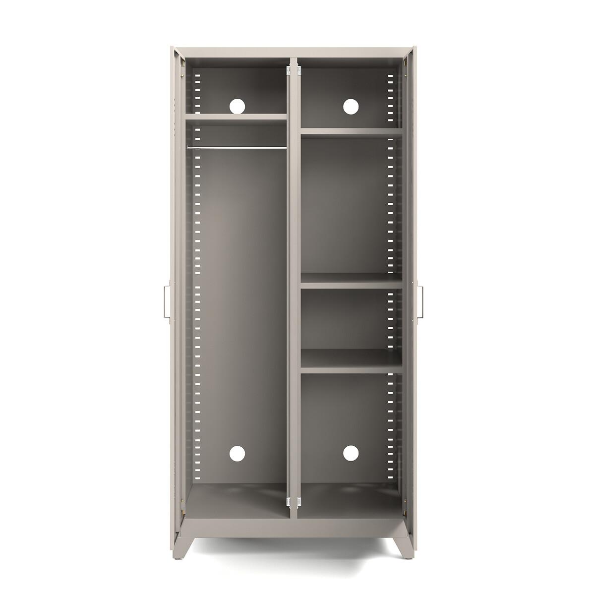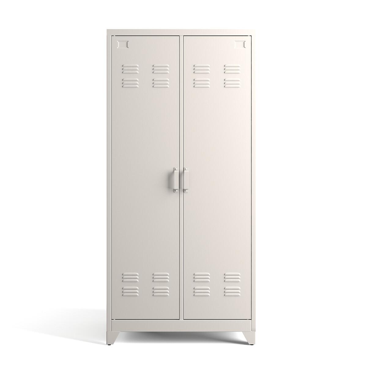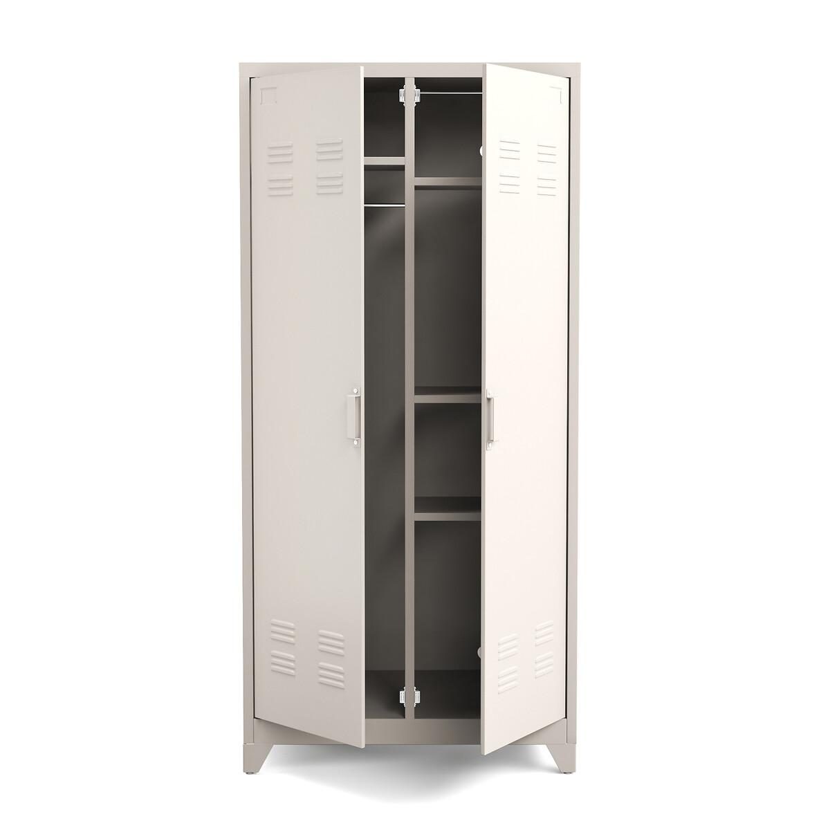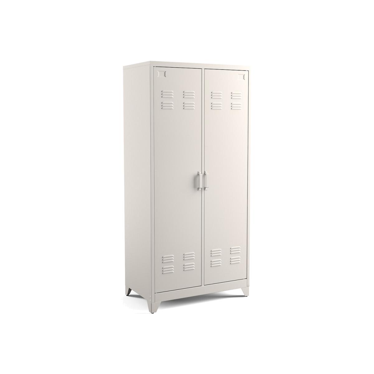 The Hiba 2-door metal wardrobe will be ideal in an hallway or in a bedroom. Its factory locker room style incorporates the look of the industrial trend, to bring a vintage touch to your decor. Storage: on the left is a shelf at the top and a hanging rail, on the right 3 shelves. Plus point: The shelves are adjustable in height, for personalised and optimal storage!Product Details • 2 doors • On left-hand side: 1 hanging rail and 1 adjustable removable shelf • On the right : 2 removable and adjustable shelves and one fixed shelf in the middle • Epoxy-finish steel metal structure, base and handles • Magnetic closure of the doors • Adjustable legs: 4 plastic pads adjustable in height. Dimensions • Width: 85cm • Height: 180cm • Depth: 50cm • Hanging space : L41 x H128 x D48cmDelivery:. This product is sold for self-assembly. It will be delivered to your door. ! Note! Please check that access points (doorways, stairways, lifts) are wide enough to accommodate your delivery. Dimensions and weight of parcel:2 parcels • L106 x H19 x D58cm. 15.5kg • L175 x H24 x D56cm. 40kg