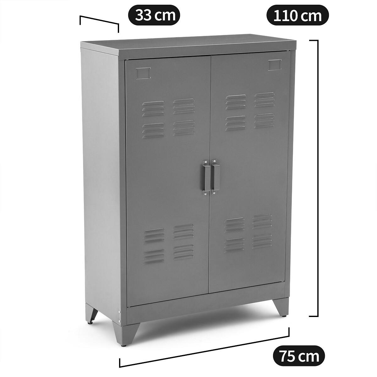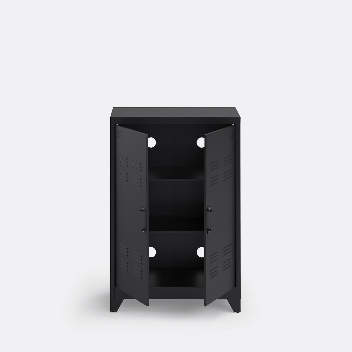 Add functional storage with industrial flair to your home using the Hiba Low Metal Cabinet. This sleek, durable unit includes two spacious, adjustable shelves and a magnetic door closure, making it ideal for organizing any room. Product Details • Epoxy-finish steel metal structure, base and handles • 2 doors • Inside: 2 large shelves, adjustable in height • Magnetic door closure • Adjustable legs: 4 plastic pads adjustable in heightDimensions. Total • Width: 75cm • Height: 110cm • Depth: 33cm. Usable dimensions: • Interior dimensions without shelves: L70 x H91.30 x D29cm • Height of legs: 8cm/3" • Weight: 21kgDelivery:. Assembly required. Available for home delivery. Note! Please check that all access points are large enough to accommodate your delivery (doors, stairs, lifts).Parcel dimensions and weight1 parcel • L116 x H22 x D47cm. 23kg.